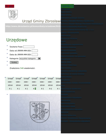 zamknij do góry Samorząd Rada Gminy Wójt Gminy Jednostki podległe Gminie Gminny Ośrodek Pomocy Społecznej Urząd Gminy Zbrosławice Gminny Zespół Obsługi Placówek Oświatowych http://www.zbroslawice.pl/komunikaty/urzedowe/Strt-up.-Wyprobuj-swoj-pomysl-na-biznes/i Gminna Biblioteka Publiczna /printpdf/st:4 Gminny Zakład Komunalny Sp. z o.o. Szkoły i Przedszkola Informacje Urzędowe Edukacja i Kultura Sport Współpraca zagraniczna Szukana fraza Gazetka Gminna Data od (RRRR-MM-DD) Sztab Kryzysowy 1 procent podatku Data do (RRRR-MM-DD) Nieruchomości na sprzedaż Kategorie wszystkie kategorie ... ▼ Inwestycje AKCJA ZIMA Szukaj Gmina i Sołectwa Plan Gminy Znaleziono 548 wiadomości. Gminna ewidencja zabytków Sołectwa w naszej Gminie Urzęd Urzęd Urzęd Urzęd Urzęd Urzęd owe - owe - owe - owe - owe - owe - stron stron stron stron stron stron a1 a2 a3 a5 a6 a 4 Komunikaty Urzęd Następ Ostatni Urzędowe owe na a Komunikaty Sztabu kryzysowego stron Inne a 7 Konsultacje społeczne Akcje wyborcze Kontakt Gospodarka Odpadami Deklaracja Harmonogramy Kalkulator opłat Wyszukiwarka odpadów MPSZOK Punkty Apteczne Rejestr Działalności Regulowanej Kontakt - Gospodarka odpadami 09 SIE 2016 OGŁOSZENIE kategoria: Komunikaty urzędowe Wójt Gminy Zbrosławice informuje, że został wywieszony na okres 21 dni tj. od 9 sierpnia 2016 r. do 30 sierpnia 2016 r. na tablicy ogłoszeń Urzędu Gminy Zbrosławice przy ul. Oświęcimskiej 2, wykaz nieruchomości przeznaczonych do sprzedaży.Wykazem objęto nieruchomość gruntową niezabudowaną położoną w obrębie Szałsza (k.m. 1 i 3) określoną nr działki 121/208 o pow. 2,0000 ha, zapisaną w księdze wieczystej KW nr 03 SIE 2016 INFORMACJA O WYNIKU ROKOWAŃ kategoria: Komunikaty urzędowe Wójt Gminy Zbrosławice informuje, że w dniu 22 lipca 2016r. w Centrum Usług Publicznych w Zbrosławicach przy ul. Oświęcimskiej 2a przeprowadzono rokowania na sprzedaż składnika rzeczowego majątku ruchomego-naczepy do przewozu koni marki mercedes nr rej. STA PC 67 stanowiącej własność Gminy Zbrosławice. Dopuszczalna ładowność 11.000 kg. Dopuszczalna masa całkowita 18.000 kg. Masa własna 7000 kg. Ilość osi -2. Rok produkcji 01 SIE 2016 kategoria: Zaproszenie na spotkanie warsztatowe w sprawie rewitalizacji Komunikaty urzędowe Informuję, że Gmina Zbrosławice prowadzi prace związane z przygotowaniem Strategii Rozwoju Gminy Zbrosławice oraz Lokalnego Programu Rewitalizacji dla Gminy Zbrosławice, które to dokumenty będą wyznaczać kierunki rozwoju do 2022 roku.Prawidłowo zaplanowane działania strategiczne i rewitalizacyjne są znaczącym bodźcem rozwoju lokalnego, skutkują polepszeniem stanu infrastruktury technicznej, turystycznej, kulturalnej i 01 SIE 2016 Test sprawności syren alarmowych kategoria: Komunikaty urzędowe Wójt Gminy Zbrosławice informuje, że 1 sierpnia 2016 r. o godzinie 17:00 zostanie przeprowadzony krajowy trening sprawności syren alarmowych wykorzystywanych w systemie ostrzegania i alarmowania ludności, upamiętniający jednocześnie obchody 72. rocznicy wybuchu Powstania Warszawskiego.W ramach treningu uruchomione zostaną syreny alarmowe emitujące dźwięk ciągły, trwający trzy minuty - oznaczający odwołanie alarmu. WÓJT 27 LIP 2016 kategoria: Zostań partnerem Karty Dużej Rodziny! Komunikaty urzędowe Zapraszamy firmy i instytucje do włączenia się do ogólnopolskiego programu Karta Dużej Rodziny.Do współpracy zapraszamy podmioty niezależnie od sektora, czy wielkości. Warunkiem udziału jest zapewnienie zniżek lub dodatkowych uprawnień dla rodzin posiadających Kartę Dużej Rodziny. Korzyści dla firm i instytucji z włączenia się do programu: współtworzenie pierwszego ogólnopolskiego programu skierowanego do dużych 25 LIP 2016 Ogłoszenia o przetargach na nieruchomości kategoria: Komunikaty urzędowe Dziś ogłoszono przetargi, dotyczące kilku nieruchomości na terenie Gminy Zbrosławice. Więcej szczegółów dostępnych jest w Biuletynie Informacji Publicznej. 22 LIP 2016 Ogłoszenie o sprzedaży działki w Miedarach kategoria: Komunikaty urzędowe WÓJT GMINY ZBROSŁAWICE ogłasza że w dniu 31 sierpnia 2016 r. o godzinie 10:00 w Centrum Usług Publicznych w Zbrosławicach, przy ul. Oświęcimskiej 2a, rozpocznie się I ustny przetarg nieograniczony na sprzedaż prawa własności nieruchomości gruntowej zabudowanej położonej w obrębie Miedary (k.m. 2 Kopa.) określonej następującym numerem działki: działka nr 477/1 o pow. 0,2813 ha; KW nr GL1T/00042811/3 Cena wywoławcza 21 LIP 2016 Uczniowie we Francji kategoria: Komunikaty urzędowe Dla ósemki wyróżniających się uczniów gminnych gimnazjów Urząd Gminy Zbrosławice zorganizował wyjazd na Europejski Tydzień Młodzieży. Tym razem wydarzenie miało miejsce w gminie partnerskiej Charnay-lès-Mâcon we Francji. Na wyjazd do Burgundii, historycznej krainy we wschodniej Francji, każde gimnazjum z terenu gminy wyznaczyło dwójkę uczniów. Opiekę nad nimi objął radny 21 LIP 2016 kategoria: Rondo Polski... w Niemczech Komunikaty urzędowe W niemieckim mieście partnerskim Brackenheim na początku lipca odbyła się nietypowa uroczystość. Na cześć współpracy z gminą Zbrosławice nowopowstałe skrzyżowanie o ruchu okrężnym nazwano Rondem Polski. Tę niecodzienną inicjatywę poprzedził kilka lat temu pomysł Francuzów z gminy partnerskiej Charnay-lès-Mâcon, którzy nowemu skrzyżowaniu nadali nazwę Ronda Brackenheim. Następnie, 18 LIP 2016 Informacja Powiatowego Lekarza Weterynarii w Tarnowskich Górach kategoria: Komunikaty urzędowe W związku ze stwierdzeniem czwartego ogniska ASF w Polsce przekazujemy informację o zasadach postępowania w gospodarstwach. Rzetelne stosowanie bioasekuracji jest obecnie jedynym sposobem skutecznego zapobiegnięcia rozprzestrzenienia się czynnika zakaźnego (w tym przypadku wirus ASF).Podstawą, zarówno dla skutecznego zapobiegania, jak i zwalcz