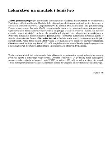 Lekarstwo na smutek i lenistwo „STOP Jesiennej Depresji” powiedziało Stowarzyszenie Akademia Pana Grześka we współpracy z Powiatowym Centrum Sportu. Hasło to było główną ideą akcji rozegranej pod koniec listopada w obiektach sportowych przy ul. Czaplineckiej 96, tj. basenie PCS, sali fitness i sali gimnastycznej. Fundacja Aktywnego Rozwoju (FAR) zorganizowała integrację z osobami niepełnosprawnymi z wykorzystaniem form zabawowo-sportowych, angażując w akcję dorosłych i dzieci. Na basenie czekały „mokre atrakcje”, zarówno dla potrafiących pływać, jak i absolutnie początkujących. Podwodne zwiedzanie basenu umożliwił Jacek Ławski – instruktor nurkowania, natomiast zumba w wodzie z instruktorką fitness - Weroniką Olczak wzbudziła wiele emocji, zarówno w wodzie, jak i na trybunach. Pokaz filmu z akcji „Zdobywamy Górę Kamieńsk” w obecności starosty Szczepana Chrzęsta zwieńczył imprezę. Ponad 100 osób mogło bezpłatnie zbadać kondycję ogólną organizmu i zasięgnąć porad dietetyków, rehabilitanta i porozmawiać o zdrowym trybie życia. Wydarzenia ostatnich dni potwierdzają dużą aktywność organizacyjną naszej jednostki na gruncie promocji sportu i aktywnego wypoczynku. Otwarte lodowisko i 24-godzinny mecz curlingowy, rozpoczęcie kursu jazdy na łyżwach i zajęć PAMS na lodzie, 1800 osób na lodzie w ciągu pierwszych 10 dni funkcjonowania lodowiska oraz maraton fitness, to wszystko na powitanie sezonu zimowego. Wydział PR