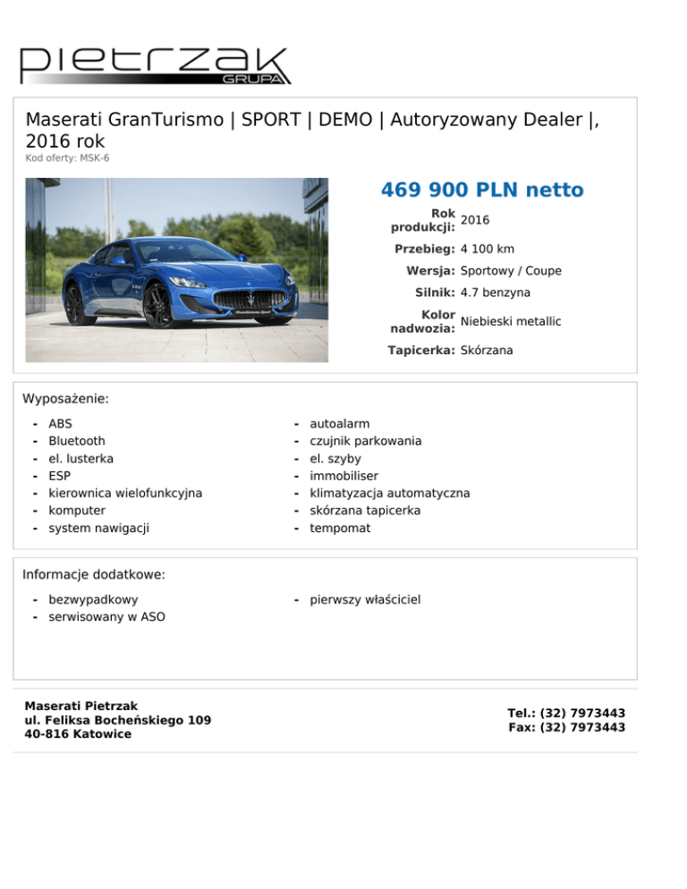 Maserati GranTurismo | SPORT | DEMO | Autoryzowany Dealer |, 2016 rok Kod oferty: MSK-6 469 900 PLN netto Rok 2016 produkcji: Przebieg: 4 100 km Wersja: Sportowy / Coupe Silnik: 4.7 benzyna Kolor Niebieski metallic nadwozia: Tapicerka: Skórzana Wyposażenie: - ABS Bluetooth el. lusterka ESP kierownica wielofunkcyjna komputer system nawigacji - autoalarm czujnik parkowania el. szyby immobiliser klimatyzacja automatyczna skórzana tapicerka tempomat Informacje dodatkowe: - bezwypadkowy - serwisowany w ASO Maserati Pietrzak ul. Feliksa Bocheńskiego 109 40-816 Katowice - pierwszy właściciel Tel.: (32) 7973443 Fax: (32) 7973443