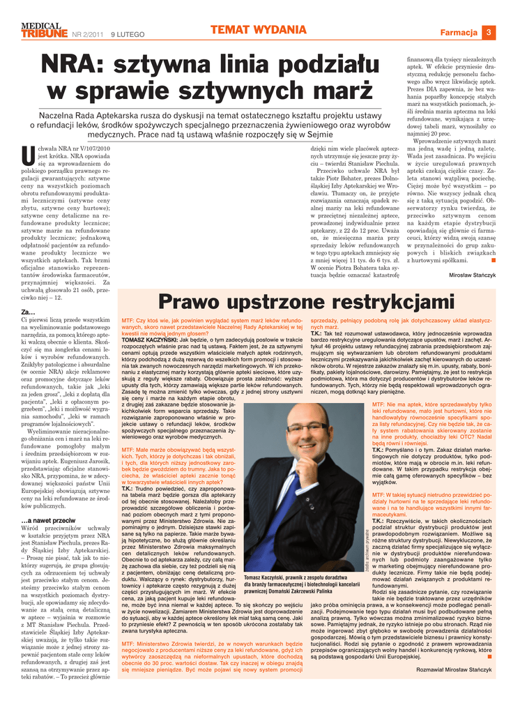 NR 2/2011 9 LUTEGO TEMAT WYDANIA Farmacja NRA: sztywna linia podziału w sprawie sztywnych marż Naczelna Rada Aptekarska rusza do dyskusji na temat ostatecznego kształtu projektu ustawy o refundacji leków, środków spożywczych specjalnego przeznaczenia żywieniowego oraz wyrobów medycznych. Prace nad tą ustawą właśnie rozpoczęły się w Sejmie dzięki nim wiele placówek aptecznych utrzymuje się jeszcze przy życiu – twierdzi Stanisław Piechula. Przeciwko uchwale NRA był także Piotr Bohater, prezes Dolnośląskiej Izby Aptekarskiej we Wrocławiu. Tłumaczy on, że przyjęte rozwiązania oznaczają spadek realnej marży na leki refundowane w przeciętnej niezależnej aptece, prowadzonej indywidualnie przez aptekarzy, z 22 do 12 proc. Uważa on, że miesięczna marża przy sprzedaży leków refundowanych w tego typu aptekach zmniejszy się z mniej więcej 11 tys. do 6 tys. zł. W ocenie Piotra Bohatera taka sytuacja będzie oznaczać katastrofę U Ci pierwsi liczą przede wszystkim na wyeliminowanie podstawowego narzędzia, za pomocą którego apteki walczą obecnie o klienta. Skończyć się ma żonglerka cenami leków i wyrobów refundowanych. Znikłyby patologiczne i absurdalne (w ocenie NRA) akcje reklamowe oraz promocyjne dotyczące leków refundowanych, takie jak „leki za jeden grosz”, „leki z dopłatą dla pacjenta”, „leki z opłaconym pogrzebem”, „leki i możliwość wygrania samochodu”, „leki w ramach programów lojalnościowych”. Wyeliminowanie nieracjonalnego obniżania cen i marż na leki refundowane pomogłoby małym i średnim przedsiębiorcom w rozwijaniu aptek. Eugeniusz Jarosik, przedstawiając oficjalne stanowisko NRA, przypomina, że w zdecydowanej większości państw Unii Europejskiej obowiązują sztywne ceny na leki refundowane ze środków publicznych. Za… Wśród przeciwników uchwały w kształcie przyjętym przez NRA jest Stanisław Piechula, prezes Rady Śląskiej Izby Aptekarskiej. – Proszę nie pisać, tak jak to niektórzy sugerują, że grupa głosujących za odrzuceniem tej uchwały jest przeciwko stałym cenom. Jesteśmy przeciwko stałym cenom na wszystkich poziomach dystrybucji, ale opowiadamy się zdecydowanie za stałą ceną detaliczną w aptece – wyjaśnia w rozmowie z MT Stanisław Piechula. Przedstawiciele Śląskiej Izby Aptekarskiej uważają, że tylko takie rozwiązanie może z jednej strony zapewnić pacjentom stałe ceny leków refundowanych, z drugiej zaś jest szansą na otrzymywanie przez apteki rabatów. – To przecież głównie …a nawet przeciw finansową dla tysięcy niezależnych aptek. W efekcie przyniesie drastyczną redukcję personelu fachowego albo wręcz likwidację aptek. Prezes DIA zapewnia, że bez wahania poparłby koncepcję stałych marż na wszystkich poziomach, jeśli średnia marża apteczna na leki refundowane, wynikająca z urzędowej tabeli marż, wynosiłaby co najmniej 20 proc. Wprowadzenie sztywnych marż ma jedną wadę i jedną zaletę. Wada jest zasadnicza. Po wejściu w życie uregulowań prawnych apteki czekają ciężkie czasy. Zaleta stanowi wątpliwą pociechę. Ciężej może być wszystkim – po równo. Nie wszyscy jednak chcą się z taką sytuacją pogodzić. Obserwatorzy rynku twierdzą, że przeciwko sztywnym cenom na każdym etapie dystrybucji opowiadają się głównie ci farmaceuci, którzy widzą swoją szansę w przynależności do grup zakupowych i bliskich związkach z hurtowymi spółkami. ■ Mirosław Stańczyk Prawo upstrzone restrykcjami MTF: Czy ktoś wie, jak powinien wyglądać system marż leków refundowanych, skoro nawet przedstawiciele Naczelnej Rady Aptekarskiej w tej kwestii nie mówią jednym głosem? TOMASZ KACZYŃSKI: Jak będzie, o tym zadecydują posłowie w trakcie rozpoczętych właśnie prac nad tą ustawą. Faktem jest, że za sztywnymi cenami optują przede wszystkim właściciele małych aptek rodzinnych, którzy podchodzą z dużą rezerwą do wszelkich form promocji i stosowania tak zwanych nowoczesnych narzędzi marketingowych. W ich przekonaniu z elastycznej marży korzystają głównie apteki sieciowe, które uzyskują z reguły większe rabaty. Obowiązuje prosta zależność: wyższe upusty dla tych, którzy zamawiają większe partie leków refundowanych. Zasadę tę można zmienić tylko wówczas, gdy z jednej strony usztywni się ceny i marże na każdym etapie obrotu, z drugiej zaś zakazane będzie stosowanie jakichkolwiek form wsparcia sprzedaży. Takie rozwiązanie zaproponowano właśnie w projekcie ustawy o refundacji leków, środków spożywczych specjalnego przeznaczenia żywieniowego oraz wyrobów medycznych. sprzedaży, pełniący podobną rolę jak dotychczasowy układ elastycznych marż. T.K.: Tak też rozumował ustawodawca, który jednocześnie wprowadza bardzo restrykcyjne uregulowania dotyczące upustów, marż i zachęt. Artykuł 46 projektu ustawy refundacyjnej zabrania przedsiębiorstwom zajmującym się wytwarzaniem lub obrotem refundowanymi produktami leczniczymi przekazywania jakichkolwiek zachęt kierowanych do uczestników obrotu. W rejestrze zakazów znalazły się m.in. upusty, rabaty, bonifikaty, pakiety lojalnościowe, darowizny. Pamiętajmy, że jest to restrykcja podmiotowa, która ma dotyczyć producentów i dystrybutorów leków refundowanych. Tych, którzy nie będą respektowali wprowadzonych ograniczeń, mogą dotknąć kary pieniężne. MTF: Nie ma aptek, które sprzedawałyby tylko leki refundowane, mało jest hurtowni, które nie handlowałyby równocześnie specyfikami spoza listy refundacyjnej. Czy nie będzie tak, że cały system rabatowania skierowany zostanie na inne produkty, chociażby leki OTC? Nadal będą równi i równiejsi. T.K.: Pomyślano i o tym. Zakaz działań marketingowych nie dotyczy produktów, tylko podmiotów, które mają w obrocie m.in. leki refundowane. W takim przypadku restrykcja obejmie całą gamę oferowanych specyfików – bez wyjątków. MT