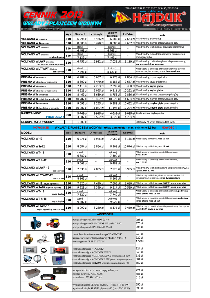 TEL - 95/722 54 59, 723 99 97, FAX - 95/723 99 98 www.hajduk.com.pl CENNIK NETTO (naleŜy doliczyć 23% VAT) KOSZT TRANSPORTU 105 ZŁ NETTO Wys 510 510 VOLCANO W chłodnica VOLCANO W h chłodnica VOLCANO WT chłodnica 510 VOLCANO WT chłodnica szyba duplex VOLCANO WL/WP chłodnica bez szprosa lub ze szprosem VOLCANO WLT/WPT chłodnica bez szprosa 510 510 510 Standard 6 296 zł 8 300 zł stand 6 408 zł stand 7 139 zł 6 752 zł Lx mosiądz Lx złoty Lx chrom 6 466 zł 8 470 zł 6 582 zł 8 586 zł Lx Extra Lx(inox) - - 6 768 zł Lx(inox) - 6 922 zł 7 499 zł 7 038 zł opis 7 663 zł Wkład wodny z chłodnicą 9 667 zł Wkład wodny z szybą przesuwana do góry - Wkład wodny z chłodnicą, drzwiczki bezramowe Wkład wodny z chłodnicą, drzwiczki bezramowe z podwójną szybą 8 119 zł Wkład wodny z chłodnicą lewo lub prawostronny, bez szprosa, lub ze szprosem stand 7 696 zł Lx(inox) - - 8 120 zł Wkład wodny z chłodnicą, drzwiczki bezramowe lewo lub prawostronne, bez szprosa, szyba dwuczęsciowa PRISMA W chłodnica 510 6 487 zł 6 657 zł 6 773 zł 7 854 zł Wkład wodny, szyba trójdzielna PRISMA W chłodnica, wymiennik 510 8 300 zł 8 470 zł 8 586 zł 9 667 zł Wkład wodny szyba trójdzielna, PRISMA W chłodnica 510 7 113 zł 7 283 zł 7 399 zł PRISMA W chłodnica, wymiennik PRISMA W h chłodnica 510 510 8 925 zł 8 469 zł 9 095 zł 8 639 zł 9 211 zł 8 755 zł 8 480 zł Wkład wodny szyba gięta, 10 292 zł Wkład wodny szyba gięta, 9 836 zł Wkład wodny z szyba przesuwaną do góry PRISMA W h chłodnica, wymiennik 510 10 287 zł 10 457 zł 10 573 zł 11 654 zł Wkład wodny z szybą przesuwaną do góry PRISMA W h chłodnica 510 9 095 zł 9 265 zł 9 381 zł 10 462 zł Wkład wodny, szyba gięta przes.do góry PRISMA W h chłodnica, wymiennik 510 10 907 zł 11 077 zł 11 193 zł 12 274 zł Wkład wodny, szyba gięta przes.do góry 500 3 745 zł 3 387 zł 3 915 zł 3 557 zł 4 015 zł 3 673 zł KASETA MKW PROMOCJA ! 1 600 zł REKUPERATOR WODNY NOWOŚĆ!!! 5 035 zł Kaseta wodna, szyba płaska 4 754 zł Nakładany na wylot spalin śr.180, i 200 WKŁADY Z PŁASZCZEM WODNYM - układ zamknięty - max. ciśnienie 2,5 bar Lx złoty Lx chrom NOWOŚĆ!!! MODEL: Wys VOLCANO W-12 510 6 775 zł 6 945 zł 7 060 zł 8 135 zł Wkład wodny z chłodnicą moc 12 kW VOLCANO W h-12 510 8 684 zł 8 854 zł 8 969 zł 10 044 zł Wkład wodny z chłodnicą moc 12 kW VOLCANO WT-12 510 VOLCANO WT h-12 510 VOLCANO WL/WP-12 bez szprosa VOLCANO WLT/WPT-12 bez szprosa VOLCANO W-18 szyba z pyrolizą VOLCANO W h-18 szyba z pyrolizą VOLCANO WT-18 510 510 510 510 szyba duplex 510 szyba duplex 510 VOLCANO WT h-18 VOLCANO WL/WP-18 szyba z pyrolizą, bez szprosa 510 Standard stand 6 880 zł stand 9 062 zł 7 635 zł stand 8 145 zł 7 320 zł 9 229 zł stand 7 320 zł stand 9 502 zł 8 090 zł Lx mosiądz Lx Extra Lx(inox) - 7 300 zł Lx(inox) - 9 482 zł 7 805 zł 7 920 zł - 7 605 zł 9 514 zł 7 740 zł Lx(inox) - 9 922 zł 8 260 zł 8 375 zł - Wkład wodny z chłodnicą, drzwiczki bezramowe, moc 12 kW 8 680 zł 10 589 zł Lx(inox) - Wkład wodny z chłodnicą, drzwiczki bezramowe, moc 12 kW - 8 565 zł 7 490 zł 9 399 zł - 8 995 zł Lx(inox) opis Wkład wodny z chłodnicą lewo lub prawostronny, bez szprosa, moc 12 kW Wkład wodny z chłodnicą, drzwiczki bezramowe lewo lub prawostronne, bez szprosa, szyba dwuczęsciowa Wkład wodny z chłodnicą, moc 18 kW, szyba z pyrolizą Wkład wodny z chłodnicą, moc 18 kW, szyba z pyrolizą - Wkład wodny z chłodnicą, drzwiczki bezramowe, podwójna szyba płaska moc 18 kW - Wkład wodny z chłodnicą, drzwiczki bezramowe, podwójna szyba płaska moc 18 kW 9 450 zł Wkład wodny z chłodnicą lewo lub prawostronny, bez szprosa, moc 18 kW, szyba z pyrolizą AKCESORIA pompa obiegowa Keller GDP 25-40 pompa obiegowa GRUNDFOS UP basic 25-40 pompa obiegowa LFP LESZNO 25-40 205 zł 370 zł 296 zł zawór bezpieczeństwa termicznego "DANFOSS" trójdrogowy zawór temperaturowy "ESBE" VTC312 termoregulator "ESBE" LTC141 240 zł 220 zł 1 580 zł centralka sterująca "HAJDUK" centralka sterująca KOMINEK PLUS centralka sterująca KOMINEK LUX z przepustnicą fi-120 centralka sterująca KOMINEK LUX grafik z przepustnicą fi-120 centralka sterująca ecoKOM Classic z przepustnicą fi-100 221 zł 340 zł 536 zł 564 zł 550 zł naczynie wzbiorcze z zaworem pływakowym zasilacz awaryjny A200 WAC akumulator 12V SBL -65 Ah 221 zł 485 zł 513 zł wymiennik ciepła SL32/20 płytowy -1” (moc 15-20 kW) wymiennik ciepła SL32/30 płytowy –1” (moc 20-35 kW) 550 zł 690 zł