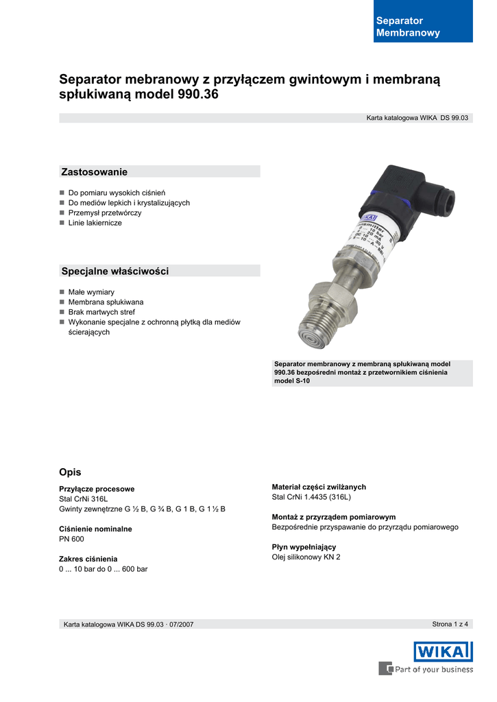 Separator Membranowy Separator mebranowy z przyłączem gwintowym i membraną spłukiwaną model 990.36 Karta katalogowa WIKA DS 99.03 Zastosowanie Do pomiaru wysokich ciśnień Do mediów lepkich i krystalizujących Przemysł przetwórczy Linie lakiernicze Specjalne właściwości Małe wymiary Membrana spłukiwana Brak martwych stref Wykonanie specjalne z ochronną płytką dla mediów ścierających Separator membranowy z membraną spłukiwaną model 990.36 bezpośredni montaż z przetwornikiem ciśnienia model S-10 Opis Przyłącze procesowe Stal CrNi 316L Gwinty zewnętrzne G ½ B, G ¾ B, G 1 B, G 1 ½ B Ciśnienie nominalne PN 600 Zakres ciśnienia 0 ... 10 bar do 0 ... 600 bar Karta katalogowa WIKA DS 99.03 · 07/2007 Materiał części zwilżanych Stal CrNi 1.4435 (316L) Montaż z przyrządem pomiarowym Bezpośrednie przyspawanie do przyrządu pomiarowego Płyn wypełniający Olej silikonowy KN 2 Strona 1 z 4 Opcjonalnie Wersja specjalna z ochronną płytką Specjalna dla mediów ścierających, patrz strona 3 Materiał części zwilżanych Materiały specjalne na zapytanie Sposób montażu z prządem pomiarowym Montaż poprzez wieżę chłodzącą Montaż poprzez kapilarę, przy zamówieniu proszę podać długość przewodu kapilarnego Płyn wypełniający Specjalny płyn dla linii lakierniczych 11256584.01 Wymiary w mm Gwint Rozmiar w mm Mb SW d l h Waga w kg G ½ B G ¾ B G 1 B G 1½ B 17 22 25 40 0,16 0,25 0,52 1,10 27 32 41 55 26 32 39 60 20 20 28 30 33 37 46 50 Mb = efektywna średnica membrany Strona 2 z 4 Karta katalogowa WIKA DS 99.03 · 07/2007 Wersja specjalna z pytką ochronną W celu ochrony przyrządu pomiarowego przed działaniem materiałów ściernych, WIKA wprowadziła separator membranowy z płytką ochronną przeznaczony do stosowania w najcięższych warunkach. Przyrząd pomiarowy jest chroniony przed działaniem mediów mechanicznie agresywnych poprzez zastosowanie płytki ochronnej o dostatecznej grubości. Materiał płytki ochronnej: stal CrNi 316L Zastosowanie Pomiar ciśnienia mediów zawierających twarde i wysokościerne cząstki: pompy gipsu i cementu drążarki tunelów górnictwo/ usuwanie odpadów Manometr z osłoną gumową model 232.50.100 i bezpośredni montaż z separatorem model 990.36 , wersja specjalna z płytką ochronną Opcjonalnie Osłona gumowa na obudowie manometrów 11256592.01 Wymiary w mm Gwint Rozmiar w mm Mb SW d l h Waga w kg G ½ B G ¾ B G 1 B G 1½ B 17 22 25 40 0,30 0,50 0,65 1,30 30 32 41 55 26 32 39 55 20 20 28 27 40 40 46 48 Mb = efektywna średnica membrany Możliwe kombinacje Przyłącze do przyrządu pomiarowego bezpośrenio wspawany przyrząd pomiarowy Płyn wypełniający olej silikonowy KN 2 Zakres temperatury medium -10 °C ... +80 °C otoczenie -10 °C ... +40 °C Manometr z rurką Bourdona np. Przetwornik ciśnienia np. model 232.50 / 233.50 (karta katalogowa model S-10 PM 02.02) lub wersja bezpieczna (karta katalogowa model 232.30 / 233.30 (karta katalogowa PE 81.01) PM 02.04) Najniższy zakres pomiarowy NS 63: 0 ... 6 bar NS 100: 0 ... 10 bar Karta katalogowa WIKA DS 99.03 · 07/2007 0 ... 2,5 bar Strona 3 z 4 Dane do zamówienia Model / przyłącze procesowe / materiał części zwilżanych / sposób montażu: montaż bezpośredni lub poprzez kapilarę, długość przewodu kapilarnego / płyn wypełniający / montaż z przyrządem pomiarowym model... (standard NS 63)/ warunki procesowe Strona 4 z 4 Karta katalogowa WIKA DS 99.03 · 07/2007 WIKA Polska spółka z ograniczoną odpowiedzialnością sp. k. Ul. Łęgska 29/35, 87-800 Włocławek Tel.: (+48) 54 23 01 100 Fax: (+48) 54 23 01 101 E-mail: [email protected] www.wikapolska.pl 9039813 07/2007 PL Specyfikacje i wymiary podane w niniejszej karcie przedstawiają stan konstrukcyjny aktualny w momencie wydruku. Istnieje możliwość wprowadzenia modyfikacji i zmian specyfikacji materiałowej bez wcześniejszego powiadomienia.
