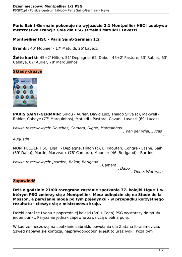Dzień meczowy: Montpellier 1-2 PSG PSGFC.pl - Polskie centrum kibiców Paris Saint-Germain - News Paris Saint-Germain pokonuje na wyjeździe 2:1 Montpellier HSC i zdobywa mistrzostwo Francji! Gole dla PSG strzelali Matuidi i Lavezzi. Montpellier HSC - Paris Saint-Germain 1:2 Bramki: 40' Mounier - 17' Matuidi, 26' Lavezzi Żółte kartki: 45+2' Hilton, 51' Deplagne, 62' Dabo - 45+2' Pastore, 53' Rabiot, 63' Cabaye, 67' Aurier, 78' Marquinhos Składy drużyn PARIS SAINT-GERMAIN: Sirigu - Aurier, David Luiz, Thiago Silva (c), Maxwell Rabiot, Cabaye (77' Marquinhos), Matuidi - Pastore, Cavani, Lavezzi (69' Lucas) Ławka rezerwowych: Douchez, Camara, Digne, Marquinhos ↑ , Van der Wiel, Lucas ↑ , Augustin MONTPELLIER HSC: Ligali - Deplagne, Hilton (c), El Kaoutari, Congre - Lasne, Saïhi (39' Dabo), Martin, Marveaux (78' Camara), Mounier (46' Berigaud) - Barrios Ławka rezerwowych: Jourden, Bakar, Berigaud ↑ , Camara ↑ , Dabo ↑ , Tiene, Wuthrich Zapowiedź Dziś o godzinie 21:00 rozegrane zostanie spotkanie 37. kolejki Ligue 1 w którym PSG zmierzy się z Montpellier. Mecz odbędzie się na Stade de la Mosson, a paryżanie mogą po tym pojedynku - w przypadku korzystnego rezultatu - cieszyć się z mistrzostwa kraju. Dzięki porażce Lyonu z poprzedniej kolejki (3:0 z Caen) PSG wystarczy do tytułu jeden punkt. Paryżanie jednak zapewne zawalczą o pełną pulę. W kadrze meczowej na spotkanie zabrakło powołania dla Zlatana Ibrahimovicia. Szwed nabawił się kontuzji, najprawdopodobniej jest to uraz łydki. Poza tym 1/2 Dzień meczowy: Montpellier 1-2 PSG PSGFC.pl - Polskie centrum kibiców Paris Saint-Germain - News zawieszeni są Marco Verratti oraz Thiago Motta. Do składu powrócił za to David Luiz. Pełna kadra dostępna tutaj. W drużynie Montpellier nie zagra kontuzjowany, nominowany do nagrody Najlepszego Młodego Zawodnika Sezonu, Morgan Sanson. Ponadto niezdolny do gry jest Karim Aït Fana. Inni zawodnicy są do dyspozycji trenera Rollanda Courbisa. Na pięć ostatnich spotkań pomiędzy Paryżem a Montpellier, zawodnicy stołecznego klubu triumfowali tylko dwa razy. Raz zwyciężył MHSC, dwukrotnie padł remis. Ostatnie spotkanie odbyło się w ramach Pucharu Francji, PSG wygrał je 3:0. Sędzią dzisiejszego meczu będzie Fredy Fautrel. Asystować mu będą Cyril Gringore i Eric Danizan. Arbiter techniczny to William Lavis. Fredy Fautrel sędziował w tym sezonie trzy mecze PSG. Było to spotkanie przeciwko Metz (3:2) oraz z Bastią (2:4) w Ligue 1, a także mecz z Saint-Étienne w Coupe de France (4:1). Montpellier HSC - PARIS SAINT-GERMAIN Ligue 1, 37. kolejka Stade de la Mosson 16.05.2015, godz. 21:00 Transmisja: nSport + Przewidywany skład PSG wg PSGFC.pl Sirigu - Aurier, Thiago Silva, Marquinhos, Maxwell - Rabiot, Cabaye, Matuidi Pastore, Cavani, Lavezzi Autor: Bercik 2/2 Powered by TCPDF (www.tcpdf.org)