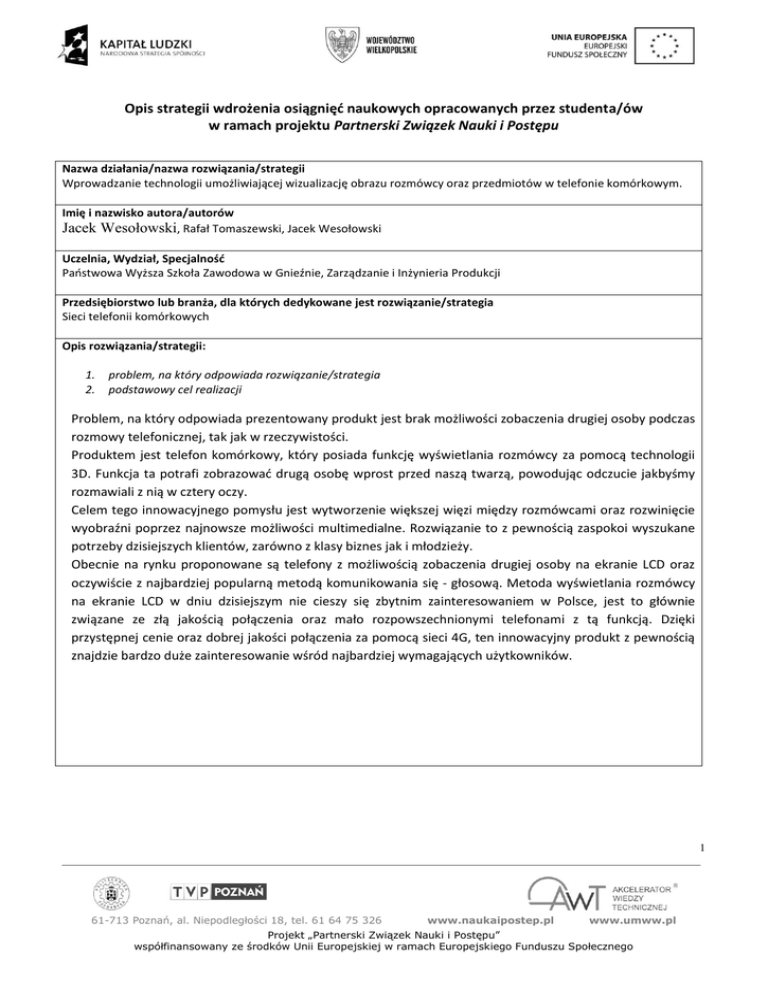 Opis strategii wdrożenia osiągnięd naukowych opracowanych przez studenta/ów w ramach projektu Partnerski Związek Nauki i Postępu Nazwa działania/nazwa rozwiązania/strategii Wprowadzanie technologii umożliwiającej wizualizację obrazu rozmówcy oraz przedmiotów w telefonie komórkowym. Imię i nazwisko autora/autorów Jacek Wesołowski, Rafał Tomaszewski, Jacek Wesołowski Uczelnia, Wydział, Specjalnośd Paostwowa Wyższa Szkoła Zawodowa w Gnieźnie, Zarządzanie i Inżynieria Produkcji Przedsiębiorstwo lub branża, dla których dedykowane jest rozwiązanie/strategia Sieci telefonii komórkowych Opis rozwiązania/strategii: 1. 2. problem, na który odpowiada rozwiązanie/strategia podstawowy cel realizacji Problem, na który odpowiada prezentowany produkt jest brak możliwości zobaczenia drugiej osoby podczas rozmowy telefonicznej, tak jak w rzeczywistości. Produktem jest telefon komórkowy, który posiada funkcję wyświetlania rozmówcy za pomocą technologii 3D. Funkcja ta potrafi zobrazowad drugą osobę wprost przed naszą twarzą, powodując odczucie jakbyśmy rozmawiali z nią w cztery oczy. Celem tego innowacyjnego pomysłu jest wytworzenie większej więzi między rozmówcami oraz rozwinięcie wyobraźni poprzez najnowsze możliwości multimedialne. Rozwiązanie to z pewnością zaspokoi wyszukane potrzeby dzisiejszych klientów, zarówno z klasy biznes jak i młodzieży. Obecnie na rynku proponowane są telefony z możliwością zobaczenia drugiej osoby na ekranie LCD oraz oczywiście z najbardziej popularną metodą komunikowania się - głosową. Metoda wyświetlania rozmówcy na ekranie LCD w dniu dzisiejszym nie cieszy się zbytnim zainteresowaniem w Polsce, jest to głównie związane ze złą jakością połączenia oraz mało rozpowszechnionymi telefonami z tą funkcją. Dzięki przystępnej cenie oraz dobrej jakości połączenia za pomocą sieci 4G, ten innowacyjny produkt z pewnością znajdzie bardzo duże zainteresowanie wśród najbardziej wymagających użytkowników. 1 61-713 Poznań, al. Niepodległości 18, tel. 61 64 75 326 www.naukaipostep.pl www.umww.pl Projekt „Partnerski Związek Nauki i Postępu” współfinansowany ze środków Unii Europejskiej w ramach Europejskiego Funduszu Społecznego Elementy innowacyjne rozwiązania/strategii (jeśli istnieją) Elementem innowacyjnym w projekcie jest technologia 3D 4G w telefonie komórkowym, która dotychczas była tylko dostępna w wielkich multipleksach lub w domu z użyciem specjalnych okularów z możliwością widzenia trójwymiaru. Proponowane rozwiązanie ma usprawnid połączenia telefoniczne, ułatwid kontakt ze znajomymi i zwiększyd wachlarz usług w telefonii komórkowej, a przez to jej atrakcyjnośd i użytecznośd. Technologia 3D 4G jest to przyszłośd, z której będzie można wkrótce korzystad w każdej części kraju. Ta innowacja zbliży ludzi jeszcze bardziej, pozwoli na szybkie zdanie relacji z jakiegoś miejsca w kraju lub na świecie oraz co będzie nowością, ujawni emocje rozmówców w postaci hologramu przed ich oczami. Zaproponowane rozwiązanie jest dotychczas niespotykane w telefonii komórkowej. Rozpocznie ono jeszcze nowszą erę komunikacji międzyludzkiej i pozwoli wprowadzid na rynek telefoniczny bardziej zaawansowane technologicznie telefony. Telefon już nie będzie zwykłym aparatem służącym do pisania smsów i odbierania rozmów, a stanie się wysoce innowacyjnym urządzeniem codziennego użytku, jakim jest komputer czy tablet. Wzrost zapotrzebowania społecznego na tego typu usługę spowoduje, że producenci i operatorzy komórkowi wyrażą chęd zainwestowania w tą technologię. Rozwój telefonii komórkowej jest w dalszym ciągu motorem innowacji, natomiast jednowymiarowy przekaz głosowy w formie telefonii stacjonarnej to przeżytek, który należy zastąpid technologią 3D 4G, aby jeszcze bardziej zbliżyd ludzi. Spodziewane korzyści dla przedsiębiorstwa wdrażającego rozwiązanie/strategię Spodziewaną korzyścią może byd zwiększona liczba klientów oraz umocnienie pozycji na dotychczasowym rynku polskim po wdrożeniu najnowszej technologii 3D 4G w telefonach komórkowych. Zapotrzebowanie na nowe modele telefonów oraz ich racjonalizatorskie funkcje mogą byd wielkim zagrożeniem dla konkurencji i pokaźnym zyskiem dla nas, jako pionierów tego nowatorskiego produktu. Mamy nadzieję, że ta innowacyjnośd w telefonie wzbudzi wielkie zainteresowanie ze strony użytkowników młodych jak i starszych oraz pozwoli na zaspokojenie ich potrzeb czyniąc nas liderami na rynku polskim, a w niedługiej przyszłości, zagranicznym. Innowacyjna funkcja 3D 4G pozwoli rozwinąd telefonię komórkową do tego stopnia, że nabywcy tych telefonów, będą mieli kontakt z całym światem nie tylko słysząc głos w słuchawce, ale również widząc rozmówcę w postaci obrazu 3D przed sobą. Bardziej kolorowe i urozmaicone menu w telefonie sprawi, że młodzi użytkownicy chętniej będą korzystad z szybkiego internetu, ucząc się czy grając w ulubione gry. Klientom biznesowym umili czas popołudniami możliwośd oglądania mobilnej telewizji w obrazie 3D w telefonie, gdy będą w delegacji z dala od rodzin czy znajomych. Wszystkie te możliwości wpłyną na korzyśd i rozwój naszej marki czyniąc ją bardziej znaną i cenioną wśród konsumentów. Pomysł na technologię 3D 4G może byd sprzedawany konkurencji i przynosid korzyści dla firmy w postaci większego popytu na produkt. 2 61-713 Poznań, al. Niepodległości 18, tel. 61 64 75 326 www.naukaipostep.pl www.umww.pl Projekt „Partnerski Związek Nauki i Postępu” współfinansowany ze środków Unii Europejskiej w ramach Europejskiego Funduszu Społecznego