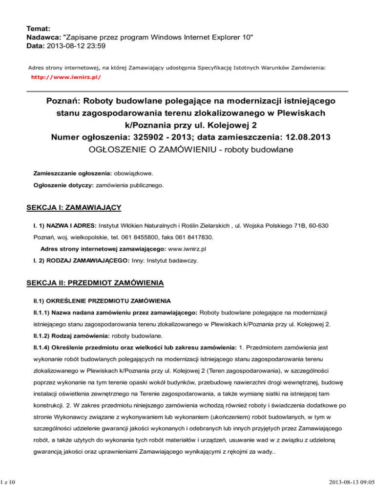 1 z 10 Temat: Nadawca: "Zapisane przez program Windows Internet Explorer 10" Data: 2013-08-12 23:59 Adres strony internetowej, na której Zamawiający udostępnia Specyfikację Istotnych Warunków Zamówienia: http://www.iwnirz.pl/ Poznań: Roboty budowlane polegające na modernizacji istniejącego stanu zagospodarowania terenu zlokalizowanego w Plewiskach k/Poznania przy ul. Kolejowej 2 Numer ogłoszenia: 325902 - 2013; data zamieszczenia: 12.08.2013 OGŁOSZENIE O ZAMÓWIENIU - roboty budowlane Zamieszczanie ogłoszenia: obowiązkowe. Ogłoszenie dotyczy: zamówienia publicznego. SEKCJA I: ZAMAWIAJĄCY I. 1) NAZWA I ADRES: Instytut Włókien Naturalnych i Roślin Zielarskich , ul. Wojska Polskiego 71B, 60-630 Poznań, woj. wielkopolskie, tel. 061 8455800, faks 061 8417830. Adres strony internetowej zamawiającego: www.iwnirz.pl I. 2) RODZAJ ZAMAWIAJĄCEGO: Inny: Instytut badawczy. SEKCJA II: PRZEDMIOT ZAMÓWIENIA II.1) OKREŚLENIE PRZEDMIOTU ZAMÓWIENIA II.1.1) Nazwa nadana zamówieniu przez zamawiającego: Roboty budowlane polegające na modernizacji istniejącego stanu zagospodarowania terenu zlokalizowanego w Plewiskach k/Poznania przy ul. Kolejowej 2. II.1.2) Rodzaj zamówienia: roboty budowlane. II.1.4) Określenie przedmiotu oraz wielkości lub zakresu zamówienia: 1. Przedmiotem zamówienia jest wykonanie robót budowlanych polegających na modernizacji istniejącego stanu zagospodarowania terenu zlokalizowanego w Plewiskach k/Poznania przy ul. Kolejowej 2 (Teren zagospodarowania), w szczególności poprzez wykonanie na tym terenie opaski wokół budynków, przebudowę nawierzchni drogi wewnętrznej, budowę instalacji oświetlenia zewnętrznego na Terenie zagospodarowania, a takŜe wymianę siatki na istniejącej tam konstrukcji. 2. W zakres przedmiotu niniejszego zamówienia wchodzą równieŜ roboty i świadczenia dodatkowe po stronie Wykonawcy związane z wykonywaniem lub wykonaniem (ukończeniem) robót budowlanych, w tym w szczególności udzielenie gwarancji jakości wykonanych i odebranych lub innych przyjętych przez Zamawiającego robót, a takŜe uŜytych do wykonania tych robót materiałów i urządzeń, usuwanie wad w z związku z udzieloną gwarancją jakości oraz uprawnieniami Zamawiającego wynikającymi z rękojmi za wady.. 2013-08-13 09:05 2 z 10 II.1.5) przewiduje się udzielenie zamówień uzupełniających: Określenie przedmiotu oraz wielkości lub zakresu zamówień uzupełniających Zamawiający zastrzega sobie prawo (nie obowiązek) udzielenia dotychczasowemu Wykonawcy zamówień uzupełniających, stanowiących nie więcej niŜ 50% wartości zamówienia podstawowego, jeŜeli spełnione zostaną pozostałe warunki wskazane w art. 67 ust. 1 pkt 6 ustawy PZP. Przedmiot zamówień uzupełniających stanowić mogą w szczególności: 1) Roboty dodatkowe polegające na połoŜeniu na terenie nieruchomości Zamawiającego przy ul. Kolejowej 2 w Plewiskach k/Poznania dodatkowej (wykraczającej poza Umowę) powierzchni nawierzchni wykonanej z kostki bukowej; 2) Wykonanie dodatkowych (ponad ilość wskazaną w Załączniku nr 1 SIWZ) punków oświetlenia zewnętrznego (w tym poprzez zwiększenie ilości słupów na terenie nieruchomości Zamawiającego przy ul. Kolejowej 2 w Plewiskach k/Poznania), 3) Wykonanie robót malarskich i konserwacyjnych na dodatkowych (ponad wskazane w załączniku nr 1 SIWZ) powierzchniach terenu nieruchomości Zamawiającego przy ul. Kolejowej 2 w Plewiskach k/Poznania). Chodzi równieŜ o powierzchnie do pomalowania na zewnątrz i wewnątrz budynków na ww. nieruchomości Zamawiającego. II.1.6) Wspólny Słownik Zamówień (CPV): 45.21.22.12-0, 45.21.33.16-0. II.1.7) Czy dopuszcza się złoŜenie oferty częściowej: nie. II.1.8) Czy dopuszcza się złoŜenie oferty wariantowej: nie. II.2) CZAS TRWANIA ZAMÓWIENIA LUB TERMIN WYKONANIA: Okres w dniach: 50. SEKCJA III: INFORMACJE O CHARAKTERZE PRAWNYM, EKONOMICZNYM, FINANSOWYM I TECHNICZNYM III.1) WADIUM Informacja na temat wadium: Warunkiem ubiegania się Wykonawcy o udzielenie niniejszego zamówienia jest wniesienie Zamawiającemu wadium w wysokości 3 600 zł. Szczegóły: dział IX specyfikacji istotnych warunków zamówienia (SIWZ). III.2) ZALICZKI III.3) WARUNKI UDZIAŁU W POSTĘPOWANIU ORAZ OPIS SPOSOBU DOKONYWANIA OCENY SPEŁNIANIA TYCH WARUNKÓW III.3.2) Wiedza i doświadczenie Opis sposobu dokonywania oceny spełniania tego warunku 1. Zamawiający uzna, iŜ Wykonawca wykazał spełnienie warunku posiadania wiedzy i doświadczenia (z zastrzeŜeniem jednak dodatkowych, właściwych dla niniejszego warunku, postanowień zawartych w sekcji IV.4.16 niniejszego ogłoszenia pn. Dodatkowe informacje dotyczące sposobu oceny spełnienia warunków udziału w niniejszym postępowaniu), jeŜeli: 1) Wykonawca potwierdzi Zamawiającemu fakt wykonania dwóch robót budowlanych (dwie wystarczą), spełniających następujące warunki: a) KaŜda z dwóch robót budowlanych została wykonana na podstawie odrębnej umowy; b) KaŜda z dwóch robót budowlanych wykonana (zakończona) została w okresie ostatnich pięciu lat przed upływem składania 2013-08-13 09:05 3 z 10 ofert w niniejszym postępowaniu (a jeŜeli okres prowadzenia działalności przez Wykonawcę jest krótszy niŜ pięć lat, to w tym okresie); c) KaŜda z dwóch robót budowlanych została wykonana naleŜycie, zgodnie z zasadami sztuki budowlanej i prawidłowo ukończona; d) KaŜda z dwóch robót budowlanych, o których mowa w pkt a) - c) niniejszego ustępu była o wartości nie mniejszej niŜ 50 000 zł (słownie: pięćdziesiąt tysięcy złotych). Przez wskazaną w niniejszym punkcie wartość Zamawiający rozumiał będzie kwotę stanowiącą cenę zapłaty z tytułu wykonania umowy o robotę budowlaną pomniejszoną o naleŜny podatek VAT. e) Przynajmniej jedna z robót budowlanych, o których mowa w pkt d) niniejszego ustępu obejmowała swoim zakresem wykonanie robót polegających połoŜeniu nawierzchni brukowej 