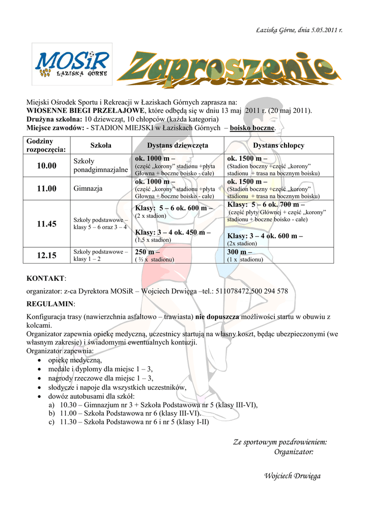 Łaziska Górne, dnia 5.05.2011 r. Miejski Ośrodek Sportu i Rekreacji w Łaziskach Górnych zaprasza na: WIOSENNE BIEGI PRZEŁAJOWE, które odbędą się w dniu 13 maj 2011 r. (20 maj 2011). Drużyna szkolna: 10 dziewcząt, 10 chłopców (każda kategoria) Miejsce zawodów: - STADION MIEJSKI w Łaziskach Górnych – boisko boczne. Godziny rozpoczęcia: 10.00 11.00 Szkoła Dystans dziewczęta ok. 1000 m – Szkoły (część „korony” stadionu +płyta ponadgimnazjalne Głowna + boczne boisko - całe) ok. 1000 m – Gimnazja (część „korony” stadionu +płyta Głowna + boczne boisko - całe) Klasy: 5 – 6 ok. 600 m – 11.45 Szkoły podstawowe – klasy 5 – 6 oraz 3 – 4 (2 x stadion) Klasy: 3 – 4 ok. 450 m – (1,5 x stadion) 12.15 Szkoły podstawowe – klasy 1 – 2 Dystans chłopcy ok. 1500 m – (Stadion boczny +część „korony” stadionu + trasa na bocznym boisku) ok. 1500 m – (Stadion boczny +część „korony” stadionu + trasa na bocznym boisku) Klasy: 5 – 6 ok. 700 m – (część płyty Głównej + część „korony” stadionu + boczne boisko - całe) Klasy: 3 – 4 ok. 600 m – (2x stadion) 250 m – 300 m – ( ⅔ x stadionu) (1 x stadionu) KONTAKT: organizator: z-ca Dyrektora MOSiR – Wojciech Drwięga –tel.: 511078472,500 294 578 REGULAMIN: Konfiguracja trasy (nawierzchnia asfaltowo – trawiasta) nie dopuszcza możliwości startu w obuwiu z kolcami. Organizator zapewnia opiekę medyczną, uczestnicy startują na własny koszt, będąc ubezpieczonymi (we własnym zakresie) i świadomymi ewentualnych kontuzji. Organizator zapewnia: opiekę medyczną, medale i dyplomy dla miejsc 1 – 3, nagrody rzeczowe dla miejsc 1 – 3, słodycze i napoje dla wszystkich uczestników, dowóz autobusami dla szkół: a) 10.30 – Gimnazjum nr 3 + Szkoła Podstawowa nr 5 (klasy III-VI), b) 11.00 – Szkoła Podstawowa nr 6 (klasy III-VI). c) 11.30 – Szkoła Podstawowa nr 6 i nr 5 (klasy I-II) Ze sportowym pozdrowieniem: Organizator: Wojciech Drwięga Regulamin Wiosennych Biegów Przełajowych SZKOŁY PONADGIMNAZJALNE: - start ok. 10.00 Dziewczęta – Klasy I-III rocznik 1992 i młodsze – dystans ~1000 m. – po 15 uczennic ze szkoły, Chłopcy – klasy I-III – rocznik 1992 i młodsze – dystans ~ 1500m – po 15 uczniów ze szkoły GIMNAZJA: - start ok. 11.00 Dziewczęta – klasy I-III – rocznik 1995 i młodsze – dystans ~ 1000 m – po 10 uczennic ze szkoły, Chłopcy – klasy I-III – rocznik 1995 i młodsi – dystans 1500 m – po 10 uczniów ze szkoły, SZKOŁY PODSTAWOWE: KLASY V-VI – start ok. 11.45 KLASY III-IV – start ok. 12.15 KLASY I-II – start ok. 12.30 Dziewczęta – klasy V-VI – dystans ~ 600m – po 10 uczennic Dziewczęta – klasy III-IV – dystans ~ 450m – po 10 uczennic Dziewczęta – klasy I-II – dystans ~ 250 m – po 10 uczennic, Chłopcy – klasy V-VI – dystans ~ 700m – po 10 uczniów Chłopcy – klasy III-IV – dystans ~ 600m – po 10 uczniów, Chłopcy – klasy I-II – dystans ~ 320 m – po 10 uczniów, POSTANOWIENIA: 1. Szkoły Ponadgimnazjalne przychodzą na godzinę 9.45 – pierwsze startują dziewczęta. 2. Uczniowie gimnazjów przychodzą na 10.45 3. Uczniowie szkół podstawowych (klasy III-VI) przychodzą na 11.30. 4. Uczniowie szkół podstawowych (klasy I-II) przychodzą na 12.00 5. Wszyscy uczniowie przychodzą pod opieką nauczycieli (opiekunów). 6. Wszyscy uczestnicy, bezpośrednio po zakończeniu biegu otrzymają słodycze (wafel lub baton) oraz wodę mineralną. 7. Dla zwycięzców (miejsca I-III) w każdej kategorii wiekowej zostaną przyznane medale oraz nagrody rzeczowe. Zwycięzca (I miejsce) otrzyma dodatkowo pamiątkową statuetkę. 8. Wręczenie nagród odbędzie się po zakończeniu biegu każdej kategorii wiekowej, po opracowaniu wyników. 9. Uczestnicy powinni posiadać aktualne badania lekarskie lub zgodę rodzica na udział w zawodach. Odpowiedzialnym za dopilnowanie ww. punktu regulaminu są opiekunowie grup. 10. Każdy uczestnik biegu powinien posiadać kartkę z nazwiskiem i imieniem oraz klasą i typem, nazwą reprezentowanej szkoły. 11. Reprezentanci danej szkoły (klasy V-VI SP i G) powinni posiadać jednakowe koszulki. 12. Opiekę medyczną zapewnia organizator. 13. Nauczyciele (opiekunowie) grup odpowiadają za porządek i właściwe zachowanie podległych grup. 14. Szkoły mogą korzystać z widowni przy płycie głównej stadionu (tam oczekują na start). 15. Kategorycznie zabrania się przebywania na płycie głównej stadionu. 16. Każda szkoła odpowiada za porządek w miejscu, w którym przebywała na widowni. 17. PO ZAKOŃCZENIU ZAWODÓW W DANEJ KATEGORII, OPIEKUNOWIE SĄ PROSZENI O DOPILNOWANIE PORZĄDKU W SWOICH SEKTORACH.