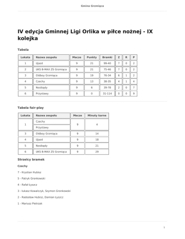 Gmina Grzmiąca IV edycja Gminnej Ligi Orlika w piłce nożnej - IX kolejka Tabela Lokata Nazwa zespołu Mecze Punkty Bramki Z R P 1 Ujazd 9 21 99-40 7 0 2 2 UKS B-MAX ZS Grzmiąca 9 21 75-46 7 0 2 3 Oldboy Grzmiąca 9 19 76-34 6 1 2 4 Czechy 9 13 38-35 4 1 4 5 Nosibądy 9 6 39-78 2 0 7 6 Przystawy 9 0 31-114 0 0 9 Tabela fair-play Lokata Nazwa zespołu Mecze Minuty karne 9 4 Czechy 1 Przystawy 3 Oldboy Grzmiąca 9 14 4 Ujazd 9 18 5 Nosibądy 9 21 6 UKS B-MAX ZS Grzmiąca 9 29 Strzelcy bramek Czechy 7 - Krystian Hubisz 5 - Patryk Gronkowski 4 - Rafał Łyszcz 3 - łukasz Kowalczyk, Szymon Gronkowski 2 - Radosław Hubisz, Damian Łyszcz 1 - Mariusz Pietrzak 1 Gmina Grzmiąca Nosibądy 11 - Mateusz Wieczorek 9 - Patryk Zakrzewski 5 - Adam Margol 4 - Marcin Zakrzewski, Marcin Szczęśniak 3 - Maciej Bartosik 2 - Dawid Kowalczuk 1 - Jacek Jezierski Oldboy Grzmiąca 24 - Jacek Szyjkowski 16 - Przemysław Babiak 11 - Artur Bator 7 - Marian Szyjkowski 6 - Jacek Drewniak, 5 - Tomasz Babiak 3 - Bogdan Markiewicz 1 - Rafał Rolniczak Przystawy 8 - Patryk Rumiński 6 - Patryk Śliwka, Sebastian Rumiński 3 - Szymon Kępa 2 - Krzysztof Wrotkowski 1 - Tomasz Kępa, Tomasz Wolski Ujazd 55 - Kazimierz Misztal 28 - Sebastian Misztal 8 - Janusz Wysocki 2 - Leszek Kwaśny, Dariusz Pańpuch 1 - Robert Pańpuch, Mateusz Gański 2 Gmina Grzmiąca UKS B-MAX ZS Grzmiąca 33 - Kamil Schab 15 - Filip Gendek 10 - Aleksander Januzik 6 - Tomasz Buzała 3 - Zbigniew Węglowski 2 - Daniel Żukowski, Szymon Górka 1 - Adrian Buzała, Sebastian Majchrzak Bramki samobójcze 5 - Przystawy 3 - Nosibądy 1 - UKS B-MAX ZS Grzmiąca, Oldboy Grzmiąca, Ujazd Runda I Kolejka 1 – 27.06.2015 r. (sobota) 16:30 UKS B-MAX ZS Grzmiąca – Nosibądy - 13 : 4 (7 : 0) (sędzia: Zwolak R, Wieczorek M) 18:00 Czechy – Oldboy Grzmiąca - 6 : 6 (0 :4) (sędzia: Zwolak R, Redner D) 28.06.2015 r. (niedziela) 17:00 Przystawy – Ujazd - 3 - 19 (1 : 10) (sędzia: Zwolak R, Schab K) Kolejka 2 – 04.07.2015 r. (sobota) 16:30 Czechy – Nosibądy - 3 : 6 (3 : 3) (sędzia: Zwolak R.) 18:00 UKS B-MAX ZS Grzmiąca – Przystawy - 10 : 6 (4 : 1) (sędzia. Zwolak R, Pawłowski A) 05.07.2015 r. (niedziela) 17:00 Oldboy Grzmiąca – Ujazd - 8 : 11 (5 : 6) (sędzia: Zwolak R, Pawłowski A) Kolejka 3 – 11.07.2015 r. (sobota) 16:30 Czechy – Przystawy - 3 : 2 (0 : 1) (sędzia: Zwolak R, Schab K) 18:00 Oldboy Grzmiąca – Nosibądy - 10 : 5 (3 :4) (sędzia: Zwolak R, Schab K) 12.07.2015 r. (niedziela) 17:00 UKS B-MAX ZS Grzmiąca – Ujazd - 6 : 7 (2 : 4) (sędzia: Zwolak R, Pawłowski A) 3 Gmina Grzmiąca Kolejka 4 – 18.07.2015 r. (sobota) 16:30 Czechy – Ujazd - 3 : 0 v.o. 18:00 Oldboy Grzmiąca – UKS B-MAX ZS Grzmiąca - 6 : 10 (1 : 6) (sędzia: Zwolak R, Wieczorek M) 19.07.2015 r. (niedziela) 17:00 Nosibądy – Przystawy - 9 : 6 (3 : 2) (sędzia: Zwolak R, Schab K) Kolejka 5 – 25.07.2015 r. (sobota) 16:30 Nosibądy – Ujazd - 4 : 11 (2 : 3) (sędzia: Zwolak R, Redner D) 18:00 Oldboy Grzmiąca – Przystawy - 11 : 3 (6 :0 ) (sędzia: Zwolak R, Schab K) 26.07.2015 r. (niedziela) 17:00 UKS B-MAX ZS Grzmiąca – Czechy - 8 : 4 (4 : 2) (sędzia: Zwolak R, Redner D) Runda II Kolejka 6 - 01.08.2015 r. (sobota) 16:30 Oldboy Grzmiąca – Przystawy - 21 : 3 (8 : 0) (sędzia: Łoboda M, Redner D) 18:00 UKS B-MAX ZS Grzmiąca – Nosibądy - 11 : 4 (7 : 3) (sędzia: Zwolak R, Łoboda M) 02.08.2015 r. (niedziela) 17:00 Ujazd – Czechy - 7 : 0 (3 : 0) (sędzia: Zwolak R, Redner D) Kolejka 7 - 08.08.2015 r. (sobota) 16:30 UKS B-MAX ZS Grzmiąca – Przystawy - 8 : 4 (2 : 1) (sędzia: Pawłowski A, Łoboda M) 18:00 Oldboy Grzmiąca – Czechy - 5 : 4 (1 : 1) (sędzia: Pawłowski A, Łoboda M) 09.08.2015 r. (niedziela) 17:00 Ujazd – Nosibądy - 18 : 7 (7 : 1) (sędzia: Zwolak R, Babiak P) Kolejka 8 - 22.08.2015 r. (sobota) 16:30 Czechy – Przystawy - 12 : 1 (5 : 1) (sędzia: Zwolak R, Babiak T) 18:00 Oldboy Grzmiąca – Nosibądy - 3 : 0 v.o 23.08.2015 r. (niedziela) 17:00 UKS B-MAX ZS Grzmiąca – Ujazd - 6 : 5 (4 : 2) (sędzia: Zwolak R, Drewniak J) Kolejka 9 - 29.08.2015 r. (sobota) 16:30 Czechy – Nosibądy - 3 : 0 v.o 18:00 Ujazd – Przystawy - 21 : 3 (12 : 0) (sędzia: Zwolak R, Januzik A) 30.08.2015 r. (niedziela) 4 Gmina Grzmiąca 17:00 UKS B-MAX ZS Grzmiąca – Oldboy Grzmiąca - 2 : 6 (1 : 3) (sędzia: Zwolak R, Jedliński K) Kolejka 10 - 05.09.2015 r. (sobota) 15:00 Nosibądy – Przystawy 16:30 UKS B-MAX ZS Grzmiąca – Czechy 18:00 Oldboy Grzmiąca – Ujazd Kontakt Koordynator rozgrywek – Ryszard Zwolak tel. 728 352 676 Oldboy Grzmiąca - Jacek Szyjkowski tel. 604 579 442 Czechy - Krystian Hubisz tel. 724 674 774 Przystawy - Szymon Kępa tel. 538 537 139 Ujazd - Dariusz Pańpuch tel. 721 777 460 UKS B-MAX ZS Grzmiąca - Tomasz Buzała tel. 788 608 287 Nosibądy - Jacek Jezierski tel. 509 528 776 5