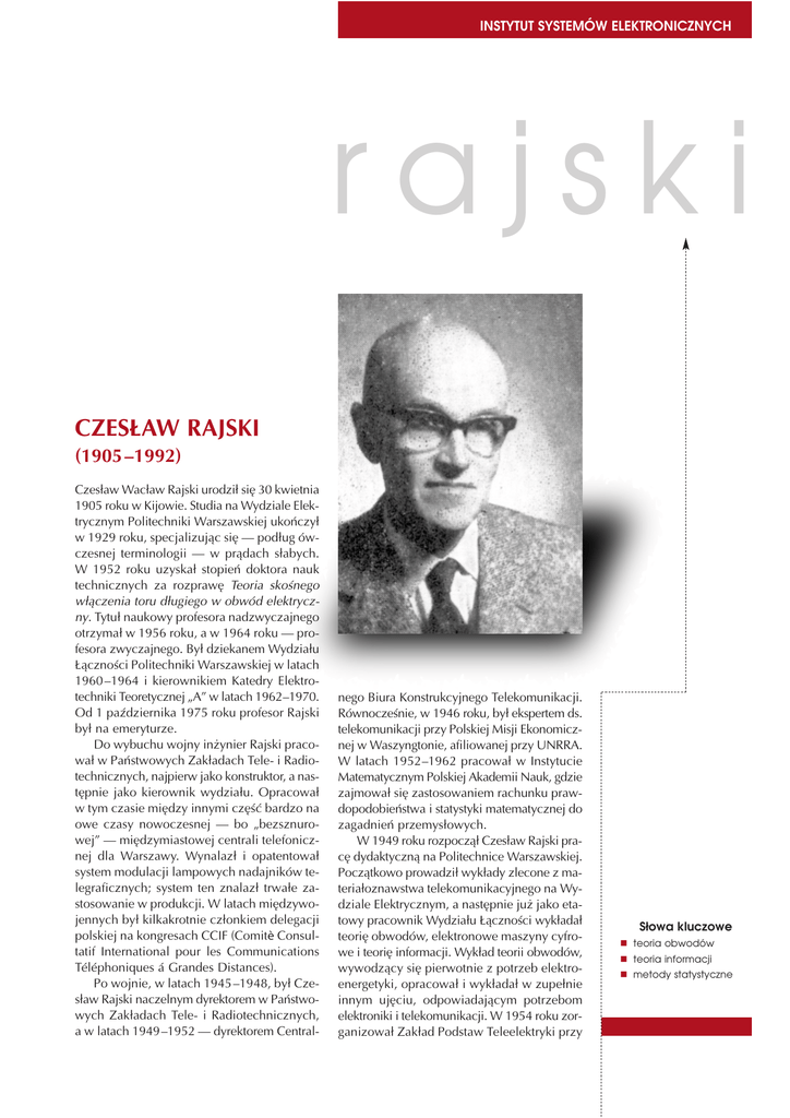 INSTYTUT SYSTEMÓW ELEKTRONICZNYCH rajski CZESŁAW RAJSKI (1905 –1992) Czesław Wacław Rajski urodził się 30 kwietnia 1905 roku w Kijowie. Studia na Wydziale Elektrycznym Politechniki Warszawskiej ukończył w 1929 roku, specjalizując się — podług ówczesnej terminologii — w prądach słabych. W 1952 roku uzyskał stopień doktora nauk technicznych za rozprawę Teoria skośnego włączenia toru długiego w obwód elektryczny. Tytuł naukowy profesora nadzwyczajnego otrzymał w 1956 roku, a w 1964 roku — profesora zwyczajnego. Był dziekanem Wydziału Łączności Politechniki Warszawskiej w latach 1960 –1964 i kierownikiem Katedry Elektrotechniki Teoretycznej „A” w latach 1962–1970. Od 1 października 1975 roku profesor Rajski był na emeryturze. Do wybuchu wojny inżynier Rajski pracował w Państwowych Zakładach Tele- i Radiotechnicznych, najpierw jako konstruktor, a następnie jako kierownik wydziału. Opracował w tym czasie między innymi część bardzo na owe czasy nowoczesnej — bo „bezsznurowej” — międzymiastowej centrali telefonicznej dla Warszawy. Wynalazł i opatentował system modulacji lampowych nadajników telegraficznych; system ten znalazł trwałe zastosowanie w produkcji. W latach międzywojennych był kilkakrotnie członkiem delegacji polskiej na kongresach CCIF (Comitè Consultatif International pour les Communications Téléphoniques á Grandes Distances). Po wojnie, w latach 1945 –1948, był Czesław Rajski naczelnym dyrektorem w Państwowych Zakładach Tele- i Radiotechnicznych, a w latach 1949 –1952 — dyrektorem Central- nego Biura Konstrukcyjnego Telekomunikacji. Równocześnie, w 1946 roku, był ekspertem ds. telekomunikacji przy Polskiej Misji Ekonomicznej w Waszyngtonie, afiliowanej przy UNRRA. W latach 1952–1962 pracował w Instytucie Matematycznym Polskiej Akademii Nauk, gdzie zajmował się zastosowaniem rachunku prawdopodobieństwa i statystyki matematycznej do zagadnień przemysłowych. W 1949 roku rozpoczął Czesław Rajski pracę dydaktyczną na Politechnice Warszawskiej. Początkowo prowadził wykłady zlecone z materiałoznawstwa telekomunikacyjnego na Wydziale Elektrycznym, a następnie już jako etatowy pracownik Wydziału Łączności wykładał teorię obwodów, elektronowe maszyny cyfrowe i teorię informacji. Wykład teorii obwodów, wywodzący się pierwotnie z potrzeb elektroenergetyki, opracował i wykładał w zupełnie innym ujęciu, odpowiadającym potrzebom elektroniki i telekomunikacji. W 1954 roku zorganizował Zakład Podstaw Teleelektryki przy Słowa kluczowe n teoria obwodów n teoria informacji n metody statystyczne INSTYTUT SYSTEMÓW ELEKTRONICZNYCH R Katedrze Podstaw Telekomunikacji, który następnie został przekształcony w Katedrę Elektrotechniki Teoretycznej „A”. W 1970 roku Katedra ta weszła w skład Instytutu Podstaw Elektroniki. Jako dziekan Wydziału Łączności zainicjował daleko idącą reformę nauczania wszystkich prawie przedmiotów. Przyczynił się do znacznego wzrostu sprawności studiowania. Spowodował również powstanie kilku nowych katedr. Przez wiele lat był przedstawicielem Wydziału w Senacie Politechniki Warszawskiej. W roku akademickim 1965/1966 przebywał w Ghanie, gdzie jako visiting professor wykładał analizę matematyczną na University of Science and Technology w Kumasi. W latach 1972–1974 przebywał kilkakrotnie w Algierii; pełnił tam funkcję konsultanta UNESCO do spraw kształcenia kadr i prowadził (w roku akademickim 1973/1974) wykłady z teorii informacji w École Nationale Polytechnique d’Alger. Dorobek naukowy Czesława Rajskiego obejmuje kilkadziesiąt pozycji. W 1957 roku napisał skrypt Elektronowe maszyny cyfrowe. Była to pierwsza publikacja zwarta, dotycząca urządzeń zwanych obecnie komputerami. W 1964 roku ukazał się następny skrypt, tym razem z teorii obwodów, a w 1971 roku książka Teoria obwodów, część I, której zakres obejmował program pierwszego semestru wykładu tego przedmiotu. Spośród publikacji, które ukazały się w wydawnictwach periodycznych trzy były szczególnie bliskie autorowi. W 1961 roku podał on definicję metryki w przestrzeni zmiennych losowych dyskretnych, a w 1963 roku nową definicję mocnego współczynnika korelacji takich zmiennych (w obu przypadkach na podstawie funkcjonału entropii). W 1982 roku wykazał, że dla bardzo obszernej klasy makroskopowych systemów dynamicznych, również dyssypatywnych, istnieje wielkość, która w każdej chwili przyjmuje dla przebiegów rzeczywistych wartość stacjonarną, przeważnie minimalną. W trakcie swej długoletniej pracy dydaktycznej był promotorem ponad 20 zakończonych rozpraw doktorskich, z których wiele zostało wyróżnionych. Czesław Rajski był członkiem założycielem Polskiego Towarzystwa Elektrotechniki Teoretycznej i Stosowanej oraz członkiem założycielem Polskiego Towarzystwa Cybernetycznego. Był również członkiem Polskiego Towarzystwa Matematycznego oraz członkiem The Institution of Electrical Engineers w Wielkiej Brytanii i The Association for Symbolic Logic w USA. W 1964 roku za swoje osiągnięcia naukowe i dydaktyczne profesor Rajski został odznaczony Krzyżem Kawalerskim Orderu Odrodzenia Polski, a w 1981 roku wyróżniony tytułem honorowym „Zasłużony Nauczyciel PRL”. W 1984 roku otrzymał godność członka honorowego Polskiego Towarzystwa Elektrotechniki Teoretycznej i Stosowanej. Mimo przejścia na emeryturę w 1975 roku Czesław Rajski nie zaprzestał działalności naukowej. Opiekował się również intensywnie licznym gronem doktorantów, promując w latach 1975 –1985 dziewięciu nowych doktorów. Do ostatnich lat, dopóki pozwalało mu na to zdrowie, kierował pracami zespołu naukowego. Dla wychowanków i współpracowników pozostanie zawsze wzorem człowieka i uczonego. Miał niezwykłe i oryginalne poczucie humoru, które zjednywało mu powszechną sympatię. W przedmowie do wspomniane