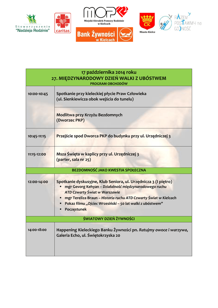 Miejski Ośrodek Pomocy Rodzinie w Kielcach Miasto Kielce 17 października 2014 roku 27. MIĘDZYNARODOWY DZIEŃ WALKI Z UBÓSTWEM PROGRAM OBCHODÓW 10:00-10:45 Spotkanie przy kieleckiej płycie Praw Człowieka (ul. Sienkiewicza obok wejścia do tunelu) Modlitwa przy Krzyżu Bezdomnych (Dworzec PKP) 10:45-11:15 Przejście spod Dworca PKP do budynku przy ul. Urzędniczej 3 11:15-12:00 Msza Święta w kaplicy przy ul. Urzędniczej 3 (parter, sala nr 25) BEZDOMNOŚĆ JAKO KWESTIA SPOŁECZNA 12:00-14:00 Spotkanie dyskusyjne, Klub Seniora, ul. Urzędnicza 3 (I piętro) mgr Gevorg Kehyan – Działalność międzynarodowego ruchu ATD Czwarty Świat w Warszawie mgr Tereliza Braun – Historia ruchu ATD Czwarty Świat w Kielcach Pokaz filmu „Ojciec Wrzesiński – 50 lat walki z ubóstwem” Poczęstunek ŚWIATOWY DZIEŃ ŻYWNOŚCI 14:00-18:00 Happening Kieleckiego Banku Żywności pn. Ratujmy owoce i warzywa, Galeria Echo, ul. Świętokrzyska 20