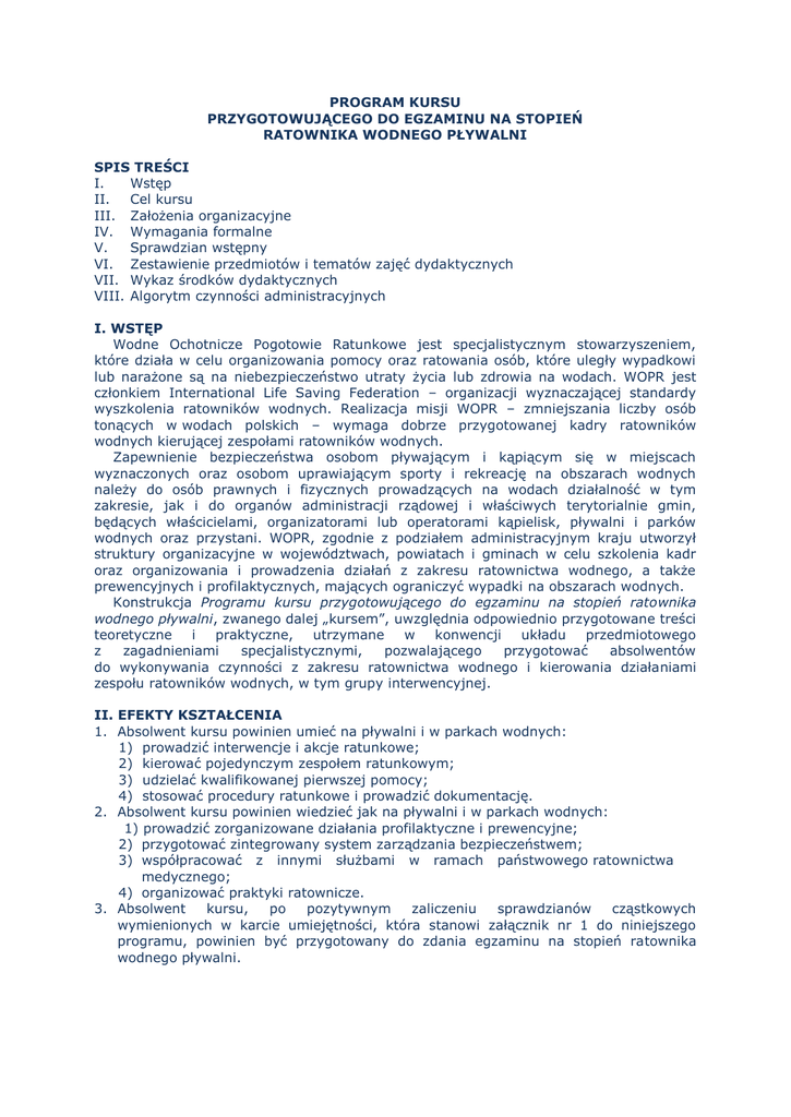 PROGRAM KURSU PRZYGOTOWUJĄCEGO DO EGZAMINU NA STOPIEŃ RATOWNIKA WODNEGO PŁYWALNI SPIS TREŚCI I. Wstęp II. Cel kursu III. Założenia organizacyjne IV. Wymagania formalne V. Sprawdzian wstępny VI. Zestawienie przedmiotów i tematów zajęć dydaktycznych VII. Wykaz środków dydaktycznych VIII. Algorytm czynności administracyjnych I. WSTĘP Wodne Ochotnicze Pogotowie Ratunkowe jest specjalistycznym stowarzyszeniem, które działa w celu organizowania pomocy oraz ratowania osób, które uległy wypadkowi lub narażone są na niebezpieczeństwo utraty życia lub zdrowia na wodach. WOPR jest członkiem International Life Saving Federation – organizacji wyznaczającej standardy wyszkolenia ratowników wodnych. Realizacja misji WOPR – zmniejszania liczby osób tonących w wodach polskich – wymaga dobrze przygotowanej kadry ratowników wodnych kierującej zespołami ratowników wodnych. Zapewnienie bezpieczeństwa osobom pływającym i kąpiącym się w miejscach wyznaczonych oraz osobom uprawiającym sporty i rekreację na obszarach wodnych należy do osób prawnych i fizycznych prowadzących na wodach działalność w tym zakresie, jak i do organów administracji rządowej i właściwych terytorialnie gmin, będących właścicielami, organizatorami lub operatorami kąpielisk, pływalni i parków wodnych oraz przystani. WOPR, zgodnie z podziałem administracyjnym kraju utworzył struktury organizacyjne w województwach, powiatach i gminach w celu szkolenia kadr oraz organizowania i prowadzenia działań z zakresu ratownictwa wodnego, a także prewencyjnych i profilaktycznych, mających ograniczyć wypadki na obszarach wodnych. Konstrukcja Programu kursu przygotowującego do egzaminu na stopień ratownika wodnego pływalni, zwanego dalej „kursem”, uwzględnia odpowiednio przygotowane treści teoretyczne i praktyczne, utrzymane w konwencji układu przedmiotowego z zagadnieniami specjalistycznymi, pozwalającego przygotować absolwentów do wykonywania czynności z zakresu ratownictwa wodnego i kierowania działaniami zespołu ratowników wodnych, w tym grupy interwencyjnej. II. EFEKTY KSZTAŁCENIA 1. Absolwent kursu powinien umieć na pływalni i w parkach wodnych: 1) prowadzić interwencje i akcje ratunkowe; 2) kierować pojedynczym zespołem ratunkowym; 3) udzielać kwalifikowanej pierwszej pomocy; 4) stosować procedury ratunkowe i prowadzić dokumentację. 2. Absolwent kursu powinien wiedzieć jak na pływalni i w parkach wodnych: 1) prowadzić zorganizowane działania profilaktyczne i prewencyjne; 2) przygotować zintegrowany system zarządzania bezpieczeństwem; 3) współpracować z innymi służbami w ramach państwowego ratownictwa medycznego; 4) organizować praktyki ratownicze. 3. Absolwent kursu, po pozytywnym zaliczeniu sprawdzianów cząstkowych wymienionych w karcie umiejętności, która stanowi załącznik nr 1 do niniejszego programu, powinien być przygotowany do zdania egzaminu na stopień ratownika wodnego pływalni. III. ZAŁOŻENIA ORGANIZACYJNE 1. Organizatorami kursów są jednostki wojewódzkie WOPR. 2. Program kursu powinien być zrealizowany w czasie co najmniej 8 jednostek dydaktycznych (jednostka dydaktyczna wynosi 45'). 3. Szczegółową ilość jednostek dydaktycznych ustala jednostka organizacyjna w zależności od liczby uczestników, dostępnych pomocy dydaktycznych, warunków lokalowych, organizacyjnych i atmosferycznych. 4. Zajęcia praktyczne i zaliczenia realizowane w trakcie kursu zawarte w karcie umiejętności odbywają się na pływalni lub w parku wodnym lub na kąpielisku. 5. Kurs może być zorganizowany w formie stacjonarnej lub w formie zajęć cyklicznych. 6. Za stronę formalną i merytoryczną odpowiedzialny jest kierownik kursu - instruktor WOPR lub instruktor wykładowca WOPR. 7. Kandydaci na kurs przyjmowani są po spełnieniu wymogów formalnych. 8. Kursy na stopnie WOPR należy realizować zgodnie z algorytmem czynności zawierającej elementy rejestracji, realizacji, egzaminowania, rozliczania, obsługi Centralnej Ewidencji (CE), stosując się do wzorów dzienników, pieczęci, identyfikatorów, zaświadczeń, regulaminów, standardów wyposażenia. IV. WYMAGANIA FORMALNE 1. Uczestnik ma mieć ukończony 18 rok życia. 2. Uczestnik ma posiadać: 1) ważną legitymację członka WOPR; 2) stopień ratownik WOPR i kartę identyfikacyjną; 3) ważne zaświadczenie o uzyskaniu tytułu ratownika na podstawie Ustawy o Państwowym Ratownictwie Medycznym lub jeden z tytułów: lekarz systemu, pielęgniarka systemu, ratownik medyczny. 3. Uczestnik ma posiadać potwierdzenie odbycia w sumie 150 godzin kształcenia zawodowego ponad te dokumentowane do stopnia ratownika WOPR obejmującego co najmniej udokumentowane odbycie stażu 50 godzin w stopniu ratownika WOPR w parku wodnym lub pływalni. V. 1. 2. 3. SPRAWDZIAN WSTĘPNY Przepłynięcie dystansu 50 m kraulem ratunkowym w czasie poniżej 50". Przepłynięcie dystansu 400 m stylem dowolnym w czasie poniżej 8'. Przepłynięcie 25 m pod wodą bez wynurzania się na powierzchnię. Podczas płynięcia pod wodą wydobycie 3 obiektów umieszczonych w odległości 5m od siebie przy czym 1 obiekt znajduje się w najgłębszym miejscu pływalni (toru). UWAGA Ze sprawdzianu wstępnego mogą być zwolnieni kandydaci, którzy ukończyli pozytywnie w przeciągu ostatniego roku jeden z dwóch pozostałych stopni zawodowych. VI. ZESTAWIENIE PRZEDMIOTÓW I TEMATÓW ZAJĘĆ DYDAKTYCZNYCH LP Tematyka zajęć 1 Sprawdzian wstępny 2 Wiadomości ogólne i profilaktyka 1 Cel, zadania, rola i struktura WOPR 2 Ratownik wodny pływalni – uprawnienia i program kursu 3 Działania profilaktyczne i prewencyjne 3 Zagadnienia prawne, taktyka 1 Wybrane przepisy i akty prawne 2 Obowiązki i odpowiedzialność ratownika oraz zasady kierowania zespołem 3 Sporządzanie zintegrowanego systemu zarządzania bezpieczeństwa dla pływalni i parku wodnego (procedury postępowania) 4 Dokumentacja pracy na pływalniach 