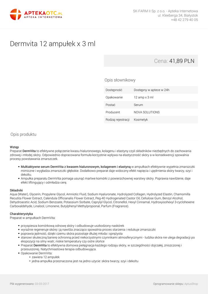 SK-FARM II Sp. z o.o. - Apteka Internetowa ul. Kleeberga 34, Białystok +48 42 279 40 05 Dermvita 12 ampułek x 3 ml Cena: 41,89 PLN Opis słownikowy Dostępność Dostępny w aptece w 24h Opakowanie 12 amp x 3 ml Postać Serum Producent NOVA SOLUTIONS Rodzaj rejestracji Kosmetyk Opis produktu Wstęp Preparat DermVita to efektywne połączenie kwasu hialuronowego, kolagenu i elastyny czyli składników niezbędnych do zachowania zdrowej i młodej skóry. Odpowiednio dopracowana formuła korzystnie wpływa na elastyczność skóry a w konsekwencji spowalnia procesy powstawania zmarszczek. Multiaktywne serum DermVita z kwasem hialuronowym, kolagenem i elastyną w ampułkach efektywnie wypełnia zmarszczki mimiczne i wygładza zmarszczki głębokie. Dodatkowo preparat daje widoczny efekt napięcia i ujędrnienia skóry twarzy, szyi i dekoltu. Ampułka preparatu DermVita pomaga usunąć martwe komórki z powierzchownej warstwy skóry. Poprawia nawilżenie, daje efekt liftingujący i odmładza cerę. Składniki Aqua (Water), Glycerin, Propylene Glycol, Amniotic Fluid, Sodium Hyaluronate, Hydrolyzed Collagen, Hydrolyzed Elastin, Chamomilla Recutita Flower Extract, Calendula Officianalis Flower Extract, Peg-40 Hydrogenated Castor Oil, Cellulose Gum, Benzyl Alcohol, Dehydroacetic Acid, Sodium Benzoate, Potassium Sorbate, Caprylyl Glycol, Citronellol, Hexyl Cinnamal, Hydroxyisohexyl 3-cyclohexene Carboxaldehyde, Linalool, Limonene, Butylphenyl Methylpropional, Parfum (Fragrance). Charakterystyka Preparat w ampułkach DermVita: przyspiesza komórkową odnowę skóry i odbudowuje uszkodzony naskórek wyraźnie regeneruje skórę i ją nawilża znacząco spowalnia proces starzenia i redukuje zmarszczki poprawia jędrność, dzięki czemu skóra pozostaje dłużej młoda i sprężysta stanowi skuteczną barierę ochronną przed niekorzystnymi czynnikami atmosferycznymi - ludzka skóra nie ulega degradacji po ekspozycji na silny wiatr, niskie temperatury czy ostre słońce Preparat DermVita to efektywna domowa pielęgnacja każdego rodzaju skóry, w szczególności dojrzałej, zniszczonej i przesuszonej. Natychmiastowa terapia odbudowująca. Opakowanie DermVita: zawiera 12 ampułek jedna ampułka przeznaczona jest na jedno użycie: skóra twarzy, szyi i dekoltu Plik wygenerowano: 03-03-2017 Oprogramowanie sklepu: AptusShop SK-FARM II Sp. z o.o. - Apteka Internetowa ul. Kleeberga 34, Białystok +48 42 279 40 05 wystarcza na 6 tygodni standardowej kuracji Stosowanie 1. Oczyść skórę żelem myjącym lub mydłem i zmyj ciepłą wodą. 2. W miarę możliwości dla uzyskania lepszego efektu przetrzyj twarz tonikiem. 3. Wetrzyj zawartość ampułki w dłonie i rozprowadzaj po skórze twarzy, szyi i dekoltu za pomocą delikatnych uderzeń, zwracając szczególną uwagę na miejsca zniszczone lub dotknięte zmarszczkami. 4. Pozostawiamy aż do wchłonięcia się preparatu. Nie spłukujemy. Kuracja normalna intensywnie nawilżająca, ujędrniająca i liftingująca skórę: 2 ampułki serum DermVita w tygodniu. Kuracja intensywna stosowana w miejscach uszkodzonej skóry i dotkniętej procesem powstawania zmarszczek: 1 ampułka serum DermVita na dobę przez okres 2 tygodni a następnie (od 3 tygodnia) 1 ampułka serum DermVita co drugi dzień przez kolejne 2 tygodnie. Informacje dodatkowe W razie pytań lub wątpliwości służymy Państwu pomocą pod adresem [email protected]. Plik wygenerowano: 03-03-2017 Powered by TCPDF (www.tcpdf.org) Oprogramowanie sklepu: AptusShop