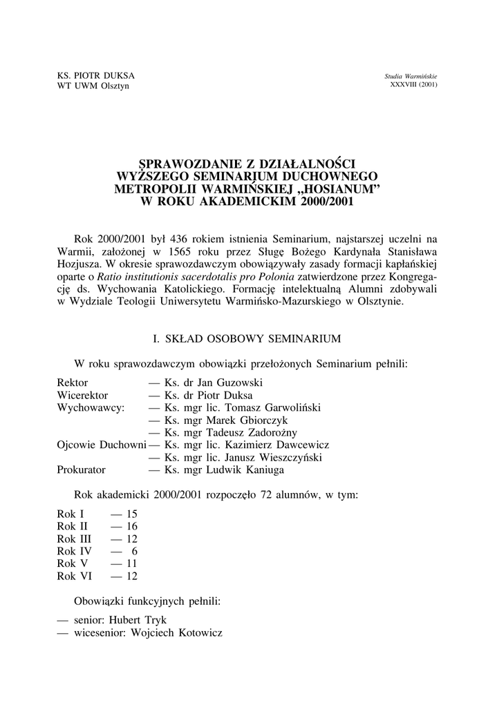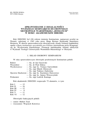 KS. PIOTR DUKSA WT UWM Olsztyn Studia Warmińskie XXXVIII (2001) SPRAWOZDANIE Z DZIAŁALNOŚCI SZEGO SEMINARIUM DUCHOWNEGO WYZ METROPOLII WARMIŃSKIEJ „HOSIANUM” W ROKU AKADEMICKIM 2000/2001 Rok 2000/2001 był 436 rokiem istnienia Seminarium, najstarszej uczelni na Warmii, załoz onej w 1565 roku przez Sługe Boz ego Kardynała Stanisława Hozjusza. W okresie sprawozdawczym obowiazywały zasady formacji kapłańskiej oparte o Ratio institutionis sacerdotalis pro Polonia zatwierdzone przez Kongregacje ds. Wychowania Katolickiego. Formacje intelektualna Alumni zdobywali w Wydziale Teologii Uniwersytetu Warmińsko-Mazurskiego w Olsztynie. I. SKŁAD OSOBOWY SEMINARIUM W roku sprawozdawczym obowiazki przełoz onych Seminarium pełnili: Rektor Wicerektor Wychowawcy: — — — — — Ojcowie Duchowni — — Prokurator — Ks. Ks. Ks. Ks. Ks. Ks. Ks. Ks. dr Jan Guzowski dr Piotr Duksa mgr lic. Tomasz Garwoliński mgr Marek Gbiorczyk mgr Tadeusz Zadoroz ny mgr lic. Kazimierz Dawcewicz mgr lic. Janusz Wieszczyński mgr Ludwik Kaniuga Rok akademicki 2000/2001 rozpoczeło 72 alumnów, w tym: Rok Rok Rok Rok Rok Rok I II III IV V VI — — — — — — 15 16 12 6 11 12 Obowiazki funkcyjnych pełnili: — senior: Hubert Tryk — wicesenior: Wojciech Kotowicz 396 — — — — — — — — — — KS. PIOTR DUKSA gospodarz: Piotr Matwiejczuk wicegospodarz: Przemysław Nowak sacelan: Mariusz Rybicki wicesacelan: Piotr Brygoła ceremoniarz: Mariusz Kubicki wiceceremoniarz: Bartłomiej Matczak orgnista: Tomasz Jagłowski wiceorganista: Mariusz Grabas infirmarz: Adam Narbut wiceinfirmarz: Piotr Chyliński II. FORMACJA SEMINARYJNA Formacja powołanych do kapłaństwa przygotowywała przyszłych duszpasterzy do pracy w parafii, szkole, do kontaktów z ludźmi w społeczeństwie, prowadzenia grup i wspólnot coraz liczniejszych we współczesnym Kościele. Seminarium starało sie dać taki zakres doświadczeń w z yciu duchowym, by młody ksiadz mógł być przewodnikiem dla innych. Priorytetowym zadaniem Seminarium było towarzyszenie wzrastaniu i rozwojowi daru powołania. W celu dostosowania formacji seminaryjnej do wymogów współczesnych dokumentów Kościoła, jak i potrzeb duszpasterskich, kaz dy rocznik seminaryjny ściśle współpracował ze swoim wychowawca. Byli nimi: Rok Rok Rok Rok Rok Rok I II III IV V VI — — — — — — Ks. Ks. Ks. Ks. Ks. Ks. mgr lic. Tomasz Garwoliński mgr Tadeusz Zadoroz ny mgr Marek Gbiorczyk mgr Marek Gbiorczyk dr Piotr Duksa dr Jan Guzowski Do obowiazków wychowawcy nalez ało organizowanie regularnych spotkań wychowawczych ze swoimi podopiecznymi, organizacja i nadzór praktyk duszpasterskich w ciagu roku akademickiego, animacja z ycia wspólnotowego, kulturalnego powierzonego rocznika, a takz e troska o zachowanie regulaminu seminaryjnego i właściwa postawe swoich podopiecznych. 1. Formacja duchowa Istotny wpływ w rozwoju z ycia duchowego alumnów miały rekolekcje jesienne prowadzone przez o. Kazimierza Wójtowicza; wielkopostne, którym przewodniczył ks. Marek Dziewiecki, a takz e przed świeceniami diakonatu i prezbiteratu, które odbyły sie w Gietrzwałdzie pod kierunkiem Ojca Duchownego ks. Kazimierza Dawcewicza. Formacja duchowa dokonywała sie takz e przez tygodniowe konferencje ascetyczne, kierownictwo duchowe pozasakramentalne, codzienny udział w Eu- SPRAWOZDANIE Z DZIAŁALNOŚCI WSDMW „HOSIANUM” 397 charystii i modlitwach, a takz e przez codzienne, wieczorne adoracje Najświetszego Sakramentu. Kierownictwo duchowe sakramentalne kaz dego tygodnia pełnili: — Ks. Marian Dubicki — Ks. Bernard Kuliński — Ks. Romuald Zapadka — Ks. Ireneusz Kuźmicki — Ks. Sławomir Ropiak — oraz Ojcowie Duchowni Seminarium 2. Formacja intelektualna Kapłan — nauczyciel wiary, powinien odznaczać sie wszechstronnym i głebokim rozumieniem wiary, która głosi. Owo „zrozumienie wiary” dokonywało sie podczas formacji intelektualnej seminarzystów realizowanej w Wydziale Teologii Uniwersytetu Warmińsko-Mazurskiego w Olsztynie. Najlepsze wyniki studiów w semestrze zimowym osiagnał rok IV (4,63), rok VI (4,59) i rok V (4,44). Indywidualnie z roku VI: dn Piotr Hartkiewicz, z roku V: Hubert Tryk i Roman Wiśniewski, z roku IV: Wojciech Kotowicz, Bartłomiej Matczak i Przemysław Nowak, z roku III: Paweł Romański, z roku II: Krystian Bielak i z roku I: Karol Gresik. Dane z semestru letniego dostepne sa dopiero po zaliczeniu praktyk pedagogicznych, które odbywaja sie we wrześniu (niestety ma to miejsce juz po zamknieciu rocznika). 3. Formacja pastoralna Pastoralny wymiar formacji seminaryjnej obejmował formy duszpasterskiego zaangaz owania naszych alumnów. Studenci teologii podczas roku akademickiego ycie, Wspólnoty „Wiara i Światło”, uczestniczyli w spotkaniach Ruchu Światło – Z Odnowy w Duchu Świetym, Liturgicznej Słuz by Ołtarza, odwiedzali areszt śledczy przy ul. Opolskiej, chorych w Poliklinice i w domach. Ponadto Diakoni odbywali stacjonarne praktyki w wyznaczonych parafiach w okresie Wielkiego Postu. Praktyczna szkoła duszpasterstwa dzieci i młodziez y było przygotowanie i przeprowadzenie przez alumnów na terenie seminarium akcji ewangelizacyjnych, szczególnie czuwań młodziez y, rekolekcji młodziez owych, spotkań ministrantów i lektorów, przegladów zespołów muzycznych, teatralnych, olimpiad wiedzy religijnej, itp. Podczas wakacji Alumni odpowiedzialnie i z wielkim poz ytkiem pełnili funkcje wychowawców na obozach i koloniach dla dzieci i młodziez y, uczestniczyli w oazach, pieszych pielgrzymkach na Jasna Góre i do Wilna oraz w „wakacjach z misjami”. Wszedzie wyraz ali gotowość do podjecia koniecznych prac i zadań. Aktywnie pracował muzyczny zespół seminaryjny „Soli Deo Gloria” uświetniajac pieknym śpiewem uroczystości seminaryjne i wyjez dz ajac z koncertami 398 KS. PIOTR DUKSA ewangelizacyjnymi do parafii naszej Archidiecezji, szkół i ośrodków opiekuńczych. NIEJS