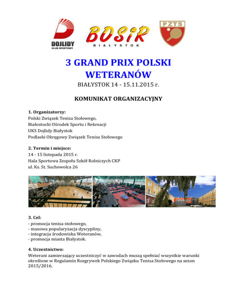 3 GRAND PRIX POLSKI WETERANÓW BIAŁYSTOK 14 - 15.11.2015 r. KOMUNIKAT ORGANIZACYJNY 1. Organizatorzy: Polski Związek Tenisa Stołowego, Białostocki Ośrodek Sportu i Rekreacji UKS Dojlidy Białystok Podlaski Okręgowy Związek Tenisa Stołowego 2. Termin i miejsce: 14 - 15 listopada 2015 r. Hala Sportowa Zespołu Szkół Rolniczych CKP ul. Ks. St. Suchowolca 26 3. Cel: - promocja tenisa stołowego, - masowa popularyzacja dyscypliny, - integracja środowiska Weteranów, - promocja miasta Białystok. 4. Uczestnictwo: Weterani zamierzający uczestniczyć w zawodach muszą spełniać wszystkie warunki określone w Regulamin Rozgrywek Polskiego Związku Tenisa Stołowego na sezon 2015/2016. 5. System rozgrywek: Turniej z cyklu Grand Prix Polski Weteranów będzie rozgrywany zgodnie z Regulaminem Rozgrywek PZTS na sezon 2015/2016 w następujących kategoriach wiekowych: - weteran w wieku 40-49 lat - weteran w wieku 50-59 lat - weteran w wieku 60-64 lat - weteran w wieku 65-69 lat - weteran w wieku 70-74 lat - weteran w wieku 75-79 lat - weteran w wieku powyżej 80 lat 6. Program zawodów: • Sobota (14.11.2015 r.) 08:00-09:00- możliwość rozgrzewki 09:00-14:30 – turniej eliminacyjny 15:00-19:00 – turniej pocieszenia • Niedziela (15.11.2015 r.) 09:00-13:00 – turnieje główne 13:00-13: 30 - uroczyste zakończenie (wręczenie pucharów, nagród i dyplomów) 7. Sprzęt sportowy: - zawody zostaną rozegrane na 12 stołach z atestem ITTF; piłeczkami plastikowymi, białymi Hanno *** - obowiązuje obuwie sportowe na jasnych podeszwach i strój sportowy 8. Zgłoszenia: Wypełnioną kartę zgłoszeniową wraz z potwierdzeniem dokonania opłaty wpisowego w wysokości 40 zł należy przesłać w nieprzekraczalnym terminie do dnia 11 listopada 2015 do godziny 21:00 na adresy e-mailowe: Przewodniczący Wydziału Rozgrywek PZTS Marek Przybyłowicz, tel. 607 922 249 e-mail: [email protected] oraz Organizator: Piotr Anchim, tel. 792 313 001 e-mail: [email protected] Wpisowe w wysokości 40 zł należy wpłacić na rachunek: UKS Dojlidy Białystok, ul. Ks. St. Suchowolca 26, 15-566 Białystok SBR Bank: 43 8769 0002 0391 6548 2000 0010 w treści wpisując: „wpisowe do 3 Grand Prix Weteranów – imię i nazwisko zawodnika” 9. Zakwaterowanie: Hostel ADEO – 80 miejsc (tel. 857323735, 601246205) www.adeohostel.pl Białystok, ul. Żwirki i Wigury 26 (3 km od miejsca zawodów): - Cena za osobę w pokoju 2 lub 3-osobowym 55 zł - śniadanie dodatkowo płatne w wysokości 15 zł - bezpłatny parking - cena podana przez organizatora na hasło „tenis stołowy” - rezerwacji i płatności dokonujemy bezpośrednio w ADEO Hotel Hotel BOSiR (tel, 85 749 62 00, 85 749 62 10) www.miejskoaktywni.pl Białystok, ul. Wołodyjowskiego 5 (3,4 km od miejsca zawodów): - Cena za osobę w pokoju 2 lub 3-osobowym 70 zł / os. - śniadanie dodatkowo płatne 15 zł 10. Wyżywienie: W trakcie trwania zawodów będzie można bezpośrednio u Organizatora zamówić obiady w cenie 20 zł. 11. Nagrody: Zawodniczki i zawodnicy, którzy zajęli miejsca 1 i 2 oraz 3-4 w turnieju głównym otrzymają dyplomy, puchary oraz nagrody rzeczowe. 12. Kontakt do Organizatora: Piotr Anchim, tel. 792313001, e-mail: [email protected]