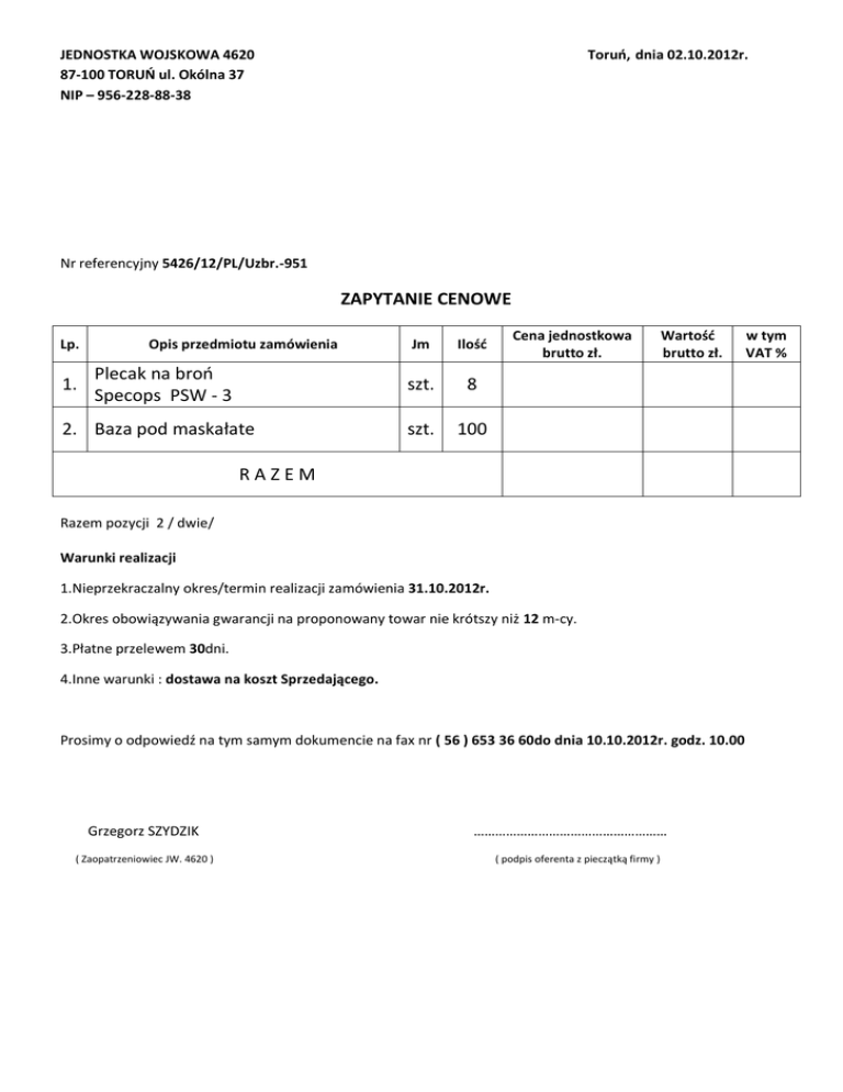 JEDNOSTKA WOJSKOWA 4620 87-100 TORUŃ ul. Okólna 37 NIP – 956-228-88-38 Toruń, dnia 02.10.2012r. Nr referencyjny 5426/12/PL/Uzbr.-951 ZAPYTANIE CENOWE Lp. Jm Ilość Plecak na broń Specops PSW - 3 szt. 8 2. Baza pod maskałate szt. 100 1. Opis przedmiotu zamówienia Cena jednostkowa brutto zł. Wartość brutto zł. RAZEM Razem pozycji 2 / dwie/ Warunki realizacji 1.Nieprzekraczalny okres/termin realizacji zamówienia 31.10.2012r. 2.Okres obowiązywania gwarancji na proponowany towar nie krótszy niż 12 m-cy. 3.Płatne przelewem 30dni. 4.Inne warunki : dostawa na koszt Sprzedającego. Prosimy o odpowiedź na tym samym dokumencie na fax nr ( 56 ) 653 36 60do dnia 10.10.2012r. godz. 10.00 Grzegorz SZYDZIK ( Zaopatrzeniowiec JW. 4620 ) ……………………………………………… ( podpis oferenta z pieczątką firmy ) w tym VAT %