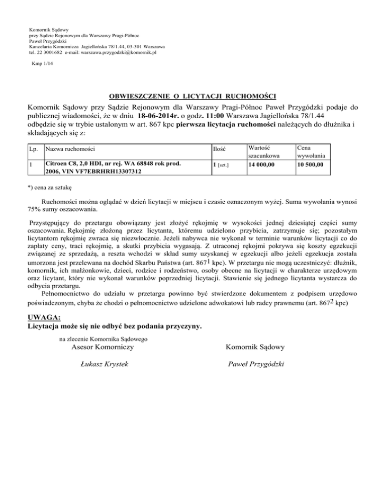 Komornik Sądowy przy Sądzie Rejonowym dla Warszawy Pragi-Północ Paweł Przygódzki Kancelaria Komornicza Jagiellońska 78/1.44, 03-301 Warszawa tel. 22 3001682 e-mail: [email protected] Kmp 1/14 OBWIESZCZENIE O LICYTACJI RUCHOMOŚCI Komornik Sądowy przy Sądzie Rejonowym dla Warszawy Pragi-Północ Paweł Przygódzki podaje do publicznej wiadomości, że w dniu 18-06-2014r. o godz. 11:00 Warszawa Jagiellońska 78/1.44 odbędzie się w trybie ustalonym w art. 867 kpc pierwsza licytacja ruchomości należących do dłużnika i składających się z: Lp. Nazwa ruchomości Ilość 1 Citroen C8, 2,0 HDI, nr rej. WA 68848 rok prod. 2006, VIN VF7EBRHRH13307312 1 [szt.] Wartość szacunkowa 14 000,00 Cena wywołania 10 500,00 *) cena za sztukę Ruchomości można oglądać w dzień licytacji w miejscu i czasie oznaczonym wyżej. Suma wywołania wynosi 75% sumy oszacowania. Przystępujący do przetargu obowiązany jest złożyć rękojmię w wysokości jednej dziesiątej części sumy oszacowania. Rękojmię złożoną przez licytanta, któremu udzielono przybicia, zatrzymuje się; pozostałym licytantom rękojmię zwraca się niezwłocznie. Jeżeli nabywca nie wykonał w terminie warunków licytacji co do zapłaty ceny, traci rękojmię, a skutki przybicia wygasają. Z utraconej rękojmi pokrywa się koszty egzekucji związanej ze sprzedażą, a reszta wchodzi w skład sumy uzyskanej w egzekucji albo jeżeli egzekucja została umorzona jest przelewana na dochód Skarbu Państwa (art. 8671 kpc). W przetargu nie mogą uczestniczyć: dłużnik, komornik, ich małżonkowie, dzieci, rodzice i rodzeństwo, osoby obecne na licytacji w charakterze urzędowym oraz licytant, który nie wykonał warunków poprzedniej licytacji. Stawienie się jednego licytanta wystarcza do odbycia przetargu. Pełnomocnictwo do udziału w przetargu powinno być stwierdzone dokumentem z podpisem urzędowo poświadczonym, chyba że chodzi o pełnomocnictwo udzielone adwokatowi lub radcy prawnemu (art. 8672 kpc) UWAGA: Licytacja może się nie odbyć bez podania przyczyny. na zlecenie Komornika Sądowego Asesor Komorniczy Komornik Sądowy Łukasz Krystek Paweł Przygódzki