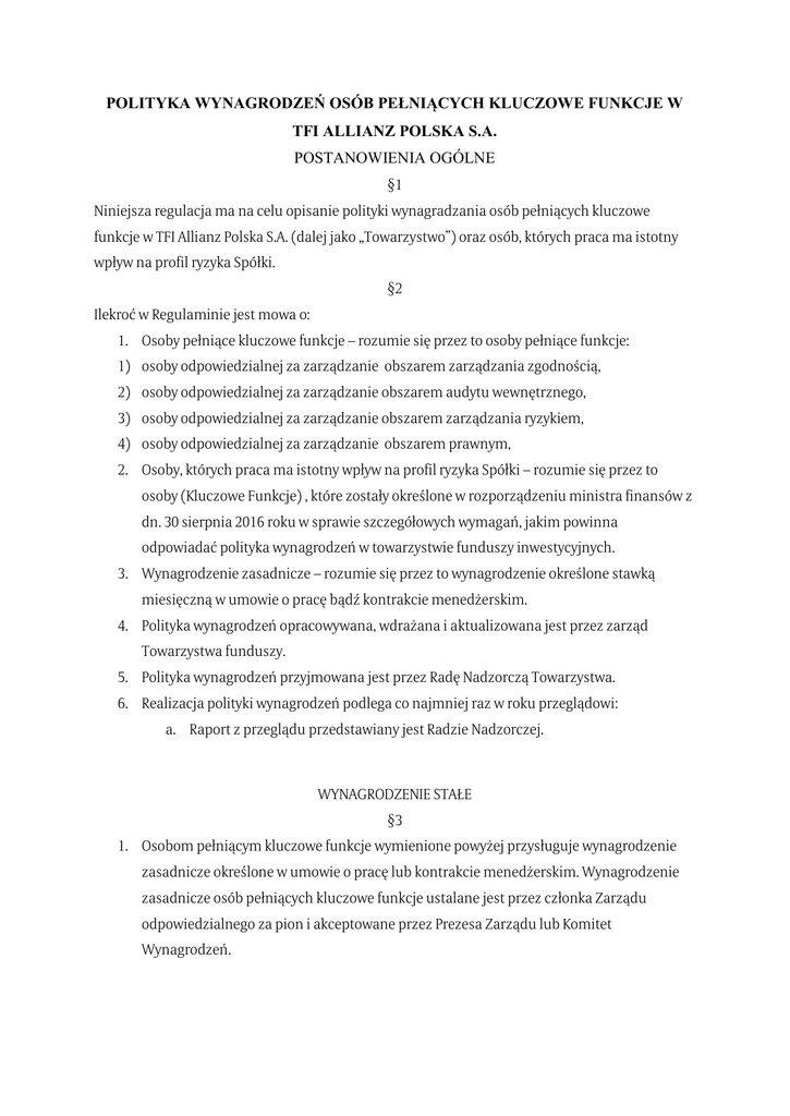 POLITYKA WYNAGRODZEŃ OSÓB PEŁNIĄCYCH KLUCZOWE FUNKCJE W TFI ALLIANZ POLSKA S.A. POSTANOWIENIA OGÓLNE §1 Niniejsza regulacja ma na celu opisanie polityki wynagradzania osób pełniących kluczowe funkcje w TFI Allianz Polska S.A. (dalej jako „Towarzystwo”) oraz osób, których praca ma istotny wpływ na profil ryzyka Spółki. §2 Ilekroć w Regulaminie jest mowa o: 1. Osoby pełniące kluczowe funkcje – rozumie się przez to osoby pełniące funkcje: 1) osoby odpowiedzialnej za zarządzanie obszarem zarządzania zgodnością, 2) osoby odpowiedzialnej za zarządzanie obszarem audytu wewnętrznego, 3) osoby odpowiedzialnej za zarządzanie obszarem zarządzania ryzykiem, 4) osoby odpowiedzialnej za zarządzanie obszarem prawnym, 2. Osoby, których praca ma istotny wpływ na profil ryzyka Spółki – rozumie się przez to osoby (Kluczowe Funkcje) , które zostały określone w rozporządzeniu ministra finansów z dn. 30 sierpnia 2016 roku w sprawie szczegółowych wymagań, jakim powinna odpowiadać polityka wynagrodzeń w towarzystwie funduszy inwestycyjnych. 3. Wynagrodzenie zasadnicze – rozumie się przez to wynagrodzenie określone stawką miesięczną w umowie o pracę bądź kontrakcie menedżerskim. 4. Polityka wynagrodzeń opracowywana, wdrażana i aktualizowana jest przez zarząd Towarzystwa funduszy. 5. Polityka wynagrodzeń przyjmowana jest przez Radę Nadzorczą Towarzystwa. 6. Realizacja polityki wynagrodzeń podlega co najmniej raz w roku przeglądowi: a. Raport z przeglądu przedstawiany jest Radzie Nadzorczej. WYNAGRODZENIE STAŁE §3 1. Osobom pełniącym kluczowe funkcje wymienione powyżej przysługuje wynagrodzenie zasadnicze określone w umowie o pracę lub kontrakcie menedżerskim. Wynagrodzenie zasadnicze osób pełniących kluczowe funkcje ustalane jest przez członka Zarządu odpowiedzialnego za pion i akceptowane przez Prezesa Zarządu lub Komitet Wynagrodzeń. 2. Wynagrodzenie osób pełniących kluczowe funkcje ustalane jest na podstawie rynkowych porównań wynagrodzeń dla osób zarządzających w instytucjach finansowych, w odniesieniu do roli pełnionej w organizacji. WYNAGRODZENIE ZMIENNE §4 1. Osoby pełniące kluczowe funkcje oraz osoby, których praca ma istotny wpływ na profil ryzyka mogą otrzymać wynagrodzenie zmienne na podstawie realizacji celów spisanych w karcie celów. Maksymalne wynagrodzenie zmienne nie powinno przekroczyć 30% rocznego wynagrodzenia zasadniczego. 2. Roczna karta celów zawiera cele roczne stawiane przez członka Zarządu nadzorującego dany obszar. Cele w karcie celów ustalane są najpóźniej do końca lutego każdego roku i obejmują cele na realizację planu finansowego spółki, cele ilościowe dotyczące np. rentowności produktów, wyników sprzedażowych, cele jakościowe, w tym realizację projektów oraz ocenę jakości zarządzania podległym im obszarem. Podstawą wynagrodzenia zmiennego jest procent rocznego wynagrodzenia zasadniczego określony w Procedurze premiowania . Osoby pełniące kluczowe funkcje mogą otrzymać również premię uznaniową na podstawie obowiązującego w Towarzystwie regulaminu wynagradzania. 3. Wynagrodzenie zmienne osób pełniących kluczowe funkcje powinno być uzależnione od jakości zarządzania podległym im obszarem i uwzględniać długoterminowe aspekty działania i sposób realizacji celów strategicznych Towarzystwa. 4. W przypadku osób, które mają istotny wpływ na działalność funduszy, w tym na decyzje inwestycyjne dotyczące portfeli inwestycyjnych funduszy, podstawą określenia zmiennych składników wynagrodzenia uzależnionych od wyników powinny być również wyniki tych funduszy. 5. Począwszy od 1 stycznia 2017 roku podstawą do określenia wyników powinny być dane z co najmniej dwóch ostatnich lat obrotowych, a w przypadku osób zatrudnionych krócej niż dwa lata – dane od momentu nawiązania zatrudnienia 6. Przyznanie lub zmiana uprawnień do uzyskania zmiennych składników wynagrodzenia uzależnionych od wyników nie powinna następować częściej niż raz w roku. 7. Nabycie przez osoby podlegające polityce wynagrodzeń praw do wypłaty zmiennych składników wynagrodzenia nie powinno następować częściej niż raz w roku. 8. Wynagrodzenie z tytułu rozwiązania umowy powinno odzwierciedlać nakład pracy, jej wydajność i jakość za okres co najmniej dwóch lat zajmowania stanowiska, z którym 2 związane było podejmowanie czynności istotnie wpływających na profil ryzyka towarzystwa funduszy inwestycyjnych lub funduszu, a w przypadku osób zajmujących takie stanowisko krócej niż dwa lata – za okres od momentu objęcia tego stanowiska. 9. Gwarantowane wynagrodzenie zmienne przewidziane jest tylko w bardzo rzadkich przypadkach i jest ograniczone do pierwszych 12 miesięcy od chwili zatrudnienia. 10. Osoby pełniące kluczowe funkcje oraz osoby, których praca ma istotny wpływ na profil ryzyka są zobowiązane do niekorzystania z osobistych strategii hedgingowych lub ubezpieczeń dotyczących wynagrodzenia i odpowiedzialności, które osłabiłyby skutki mechanizmów uwzględniania ryzyka wbudowane w ich system wynagradzania. a. W razie przyznania wynagrodzenia w formie jednostek uczestnictwa lub innych instrumentów, Członkowie Zarządu Towarzystwa zobowiązani są do nieprzedstawiania do odkupienia jednostek uczestnictwa lub niezbywania lub nieprzedstawiania do wykupu innych instrumentów w sposób niezgodny z umową zawartą przez tę osobę z towarzystwem funduszy inwestycyjnych w okresie wstrzymania określonym w tej umowie. 11. Pomiar wyników pracy stanowiący podstawę ustalenia wysokości zmiennego składnika wynagrodzenia osób pełniących kluczowe funkcje powinien obejmować korektę w dół z tytułu ekspozycji na bieżące i przyszłe ryzyka, uwzględniającą profil ryzyka Towarzystwa oraz koszt kapitału. 12. Wynagrodzenie zmienne osób, o których mowa w §2 pkt1 ppkt1)-4) powinno być niezależne od