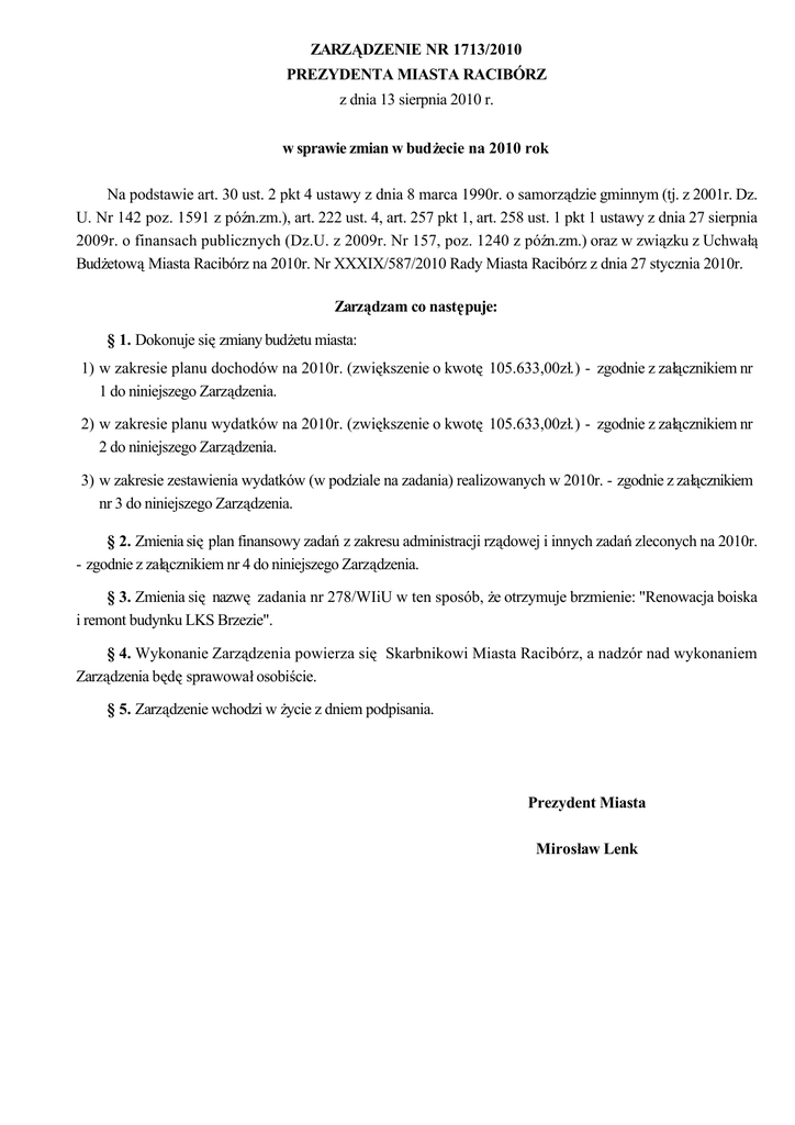 ZARZĄDZENIE NR 1713/2010 PREZYDENTA MIASTA RACIBÓRZ z dnia 13 sierpnia 2010 r. w sprawie zmian w budżecie na 2010 rok Na podstawie art. 30 ust. 2 pkt 4 ustawy z dnia 8 marca 1990r. o samorządzie gminnym (tj. z 2001r. Dz. U. Nr 142 poz. 1591 z późn.zm.), art. 222 ust. 4, art. 257 pkt 1, art. 258 ust. 1 pkt 1 ustawy z dnia 27 sierpnia 2009r. o finansach publicznych (Dz.U. z 2009r. Nr 157, poz. 1240 z późn.zm.) oraz w związku z Uchwałą Budżetową Miasta Racibórz na 2010r. Nr XXXIX/587/2010 Rady Miasta Racibórz z dnia 27 stycznia 2010r. Zarządzam co następuje: § 1. Dokonuje się zmiany budżetu miasta: 1) w zakresie planu dochodów na 2010r. (zwiększenie o kwotę 105.633,00zł.) - zgodnie z załącznikiem nr 1 do niniejszego Zarządzenia. 2) w zakresie planu wydatków na 2010r. (zwiększenie o kwotę 105.633,00zł.) - zgodnie z załącznikiem nr 2 do niniejszego Zarządzenia. 3) w zakresie zestawienia wydatków (w podziale na zadania) realizowanych w 2010r. - zgodnie z załącznikiem nr 3 do niniejszego Zarządzenia. § 2. Zmienia się plan finansowy zadań z zakresu administracji rządowej i innych zadań zleconych na 2010r. - zgodnie z załącznikiem nr 4 do niniejszego Zarządzenia. § 3. Zmienia się nazwę zadania nr 278/WIiU w ten sposób, że otrzymuje brzmienie: "Renowacja boiska i remont budynku LKS Brzezie". § 4. Wykonanie Zarządzenia powierza się Skarbnikowi Miasta Racibórz, a nadzór nad wykonaniem Zarządzenia będę sprawował osobiście. § 5. Zarządzenie wchodzi w życie z dniem podpisania. Prezydent Miasta Mirosław Lenk UZASADNIENIE 1. Zmiany budżetu w zakresie planu dochodów na 2010r. dokonuje się po otrzymaniu informacji z Śląskiego Urzędu Wojewódzkiego w Katowicach o: 1) zwiększeniu dotacji celowej przeznaczonej na sfinansowanie zakupu pomocy dydaktycznych do miejsc zabaw w szkole oraz pokrycie kosztów utworzenia lub modyfikacji szkolnych placów zabaw w ramach Rządowego Programu "Radosna Szkoła", 2) zwiększeniu dotacji celowej z zakresu pomocy społecznej przeznaczonej na wypłatę dodatków dla pracowników socjalnych Ośrodka Pomocy Społecznej, UZASADNIENIE 1. Zmiany budżetu w zakresie planu dochodów na 2010r. dokonuje się po otrzymaniu informacji z Śląskiego Urzędu Wojewódzkiego w Katowicach o: 1) zwiększeniu dotacji celowej przeznaczonej na sfinansowanie zakupu pomocy dydaktycznych do miejsc zabaw w szkole oraz pokrycie kosztów utworzenia lub modyfikacji szkolnych placów zabaw w ramach Rządowego Programu "Radosna Szkoła", 2) zwiększeniu dotacji celowej z zakresu pomocy społecznej przeznaczonej na wypłatę dodatków dla pracowników socjalnych Ośrodka Pomocy Społecznej, 3) zwiększeniu dotacji celowej z zakresu pomocy społecznej przeznaczonej na dofinansowanie realizacji programu wieloletniego "Pomoc państwa w zakresie dożywiania"; 2. Zmiany budżetu w zakresie planu wydatków na 2010r. dokonuje się w celu zabezpieczenia środków na: 1) w dziale 700: a) wydatki na zakupy inwestycyjne w ramach zadania "Pozyskiwanie nieruchomości na rzecz gminy" przesunięcie środków z zadania "Regulacja stanu nieruchomości", b) zakup usług pozostałych w ramach zadania "Przygotowanie mienia komunalnego do obrotu" - środki pochodzą z zadania "Aktualizacja opłat rocznych za użytkowanie wieczyste"; 2) w dziale 754 - wynagrodzenia bezosobowe w obronie cywilnej - zmiana klasyfikacji środków; 3) w dziale 801: a) wydatki inwestycyjne w Szkole Podstawowej Nr 1 w ramach zadania "Radosna szkoła"- środki na realizację zadania pochodzą z budżetu państwa, b) wydatki bieżące w Gimnazjum Nr 3 - środki na realizację zadania pochodzą z rezerwy celowej, 4) w dziale 851 - uzupełnienie środków w ramach zadania "Modernizacją dachu budynku RCRON" przesunięcie środków z zadania "Zagospodarowanie terenu wokół budynku RCRON - urządzenie placu zabaw"; 5) w dziale 852: a) wynagrodzenia osobowe pracowników Ośrodka Pomocy Społecznej przeznaczone na wypłatę dodatków w wysokości 250zł. dla pracowników socjalnych - środki pochodzą z budżetu państwa, b) świadczenia społeczne w Ośrodku Pomocy Społecznej w ramach zadania "Dożywianie uczniów" środki pochodzą z budżetu państwa; 6) w dziale 900: a) uzupełnienie środków na bieżące utrzymanie oświetlenia ulicznego - zmiana klasyfikacji środków, b) uzupełnienie środków na realizację zadania "Oczyszczanie miasta"; 7) w dziale 926: a) zakup usług remontowych (wykonanie izolacji przeciwwilgociowej) w ramach zadania "Renowacja boiska i remont LKS Brzezie" - zmiana klasyfikacji środków, b) wynagrodzenia bezosobowe w ramach zadania "Animator Moje Boisko Orlik 2010" - przesunięcie środków z zadania "Pozostała działalność - bieżące zadania sport"; 3. Zmian planu finansowego zadań z zakresu administracji rządowej i innych zadań zleconych na 2010r. b) wynagrodzenia bezosobowe w ramach zadania "Animator Moje Boisko Orlik 2010" - przesunięcie środków z zadania "Pozostała działalność - bieżące zadania sport"; 3. Zmian planu finansowego zadań z zakresu administracji rządowej i innych zadań zleconych na 2010r. dokonuje się w związku z pismem Śląskiego Urzędu Wojewódzkiego w Katowicach o: 1) zmniejszeniu dotacji celowej z zakresu pomocy społecznej - świadczenia rodzinne, świadczenia z funduszu alimentacyjnego oraz składki na ubezpeczenia emerytalne i rentowe z ubezpieczenia społecznego, 2) zwiększeniu dotacji celowej przeznaczonej na opłacenie składek na ubezpieczenie zdrowotne za osoby pobierające niektóre świadczenia rodzinne z Ośrodka Pomocy Społecznej. 4. Zmiany nazwy zadania nr 278/WIiU dokonuje się w związku z przeznaczeniem środków na " Renowację boiska i remont budynku LKS Brzezie". Załączniki binarne Załącznik nr 1 do Zarządzenia z dnia 13 sierpnia 2010 r. Zmiana planu dochodów na 2010r. Zalacznik1.xls Załącznik nr 2 do Zarządzenia z dnia 13 sierpnia 2010 r. Zmiana planu wydatków na 2010r. Zalacznik
