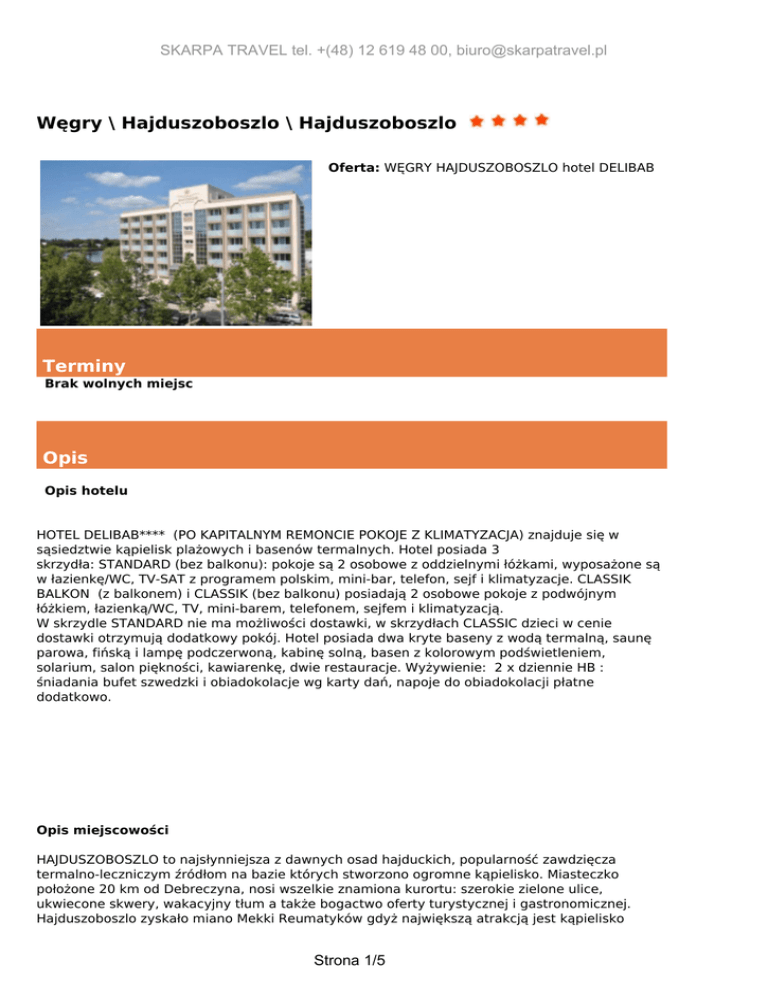 SKARPA TRAVEL tel. +(48) 12 619 48 00, [email protected] Węgry \ Hajduszoboszlo \ Hajduszoboszlo Oferta: WĘGRY HAJDUSZOBOSZLO hotel DELIBAB Terminy Brak wolnych miejsc Opis Opis hotelu HOTEL DELIBAB**** (PO KAPITALNYM REMONCIE POKOJE Z KLIMATYZACJA) znajduje się w sąsiedztwie kąpielisk plażowych i basenów termalnych. Hotel posiada 3 skrzydła: STANDARD (bez balkonu): pokoje są 2 osobowe z oddzielnymi łóżkami, wyposażone są w łazienkę/WC, TV-SAT z programem polskim, mini-bar, telefon, sejf i klimatyzacje. CLASSIK BALKON (z balkonem) i CLASSIK (bez balkonu) posiadają 2 osobowe pokoje z podwójnym łóżkiem, łazienką/WC, TV, mini-barem, telefonem, sejfem i klimatyzacją. W skrzydle STANDARD nie ma możliwości dostawki, w skrzydłach CLASSIC dzieci w cenie dostawki otrzymują dodatkowy pokój. Hotel posiada dwa kryte baseny z wodą termalną, saunę parowa, fińską i lampę podczerwoną, kabinę solną, basen z kolorowym podświetleniem, solarium, salon piękności, kawiarenkę, dwie restauracje. Wyżywienie: 2 x dziennie HB : śniadania bufet szwedzki i obiadokolacje wg karty dań, napoje do obiadokolacji płatne dodatkowo. Opis miejscowości HAJDUSZOBOSZLO to najsłynniejsza z dawnych osad hajduckich, popularność zawdzięcza termalno-leczniczym źródłom na bazie których stworzono ogromne kąpielisko. Miasteczko położone 20 km od Debreczyna, nosi wszelkie znamiona kurortu: szerokie zielone ulice, ukwiecone skwery, wakacyjny tłum a także bogactwo oferty turystycznej i gastronomicznej. Hajduszoboszlo zyskało miano Mekki Reumatyków gdyż największą atrakcją jest kąpielisko Strona 1/5 SKARPA TRAVEL tel. +(48) 12 619 48 00, [email protected] leczniczo-termalne Szent Istavan Park, gdzie woda jest bogata w składniki mineralne. Oprócz 16 basenów są tu: staw z łódkami, plaża śródziemnomorska, Aquapark, mnóstwo knajpek, winiarni, smażalni... Cena w PLN obejmuje przejazd autokarem lub dojazd własny, opłata rezerwacyjna, ubezpieczenie KL+NNW +choroby przewlekłe i nowotworowe+bagaż, turystyczny fundusz gwarancyjny. Cena w EUR obejmuje 7 lub 14 noclegów, wyżywienie 2 x dziennie, korzystanie na terenie hotelu z basenu z wodą termalną, jakuzzi, sauny z lampą podczerwoną, z kabiny zapachowej i tarasu do opalania, szlafrok na czas pobytu, bezpłatny sejf i klimatyzacja, mobilny rezydent węgierski, Dopłaty 1. osoby od 18 lat obowiązkowa taksa klimatyczna płatna w hotelu ok .500 HUF /dzień/osoba. 2. Parking płatny ok. 00 HUF / doba / samochód. 3. Zwierzęta 4000 HUF / doba. Zniżki Dziecko do 2 lat bez świadczeń hotelowych płaci 50 zł / 7 dni, przy dojeździe autokarem 240 zł / 7 dni. Skrzydło CLASIC 1. Dziecko 2-10 lat w osobnym pokoju płaci terminie: 18.02 - 01.07 i 02.09 - 16.12 130 zł + 170 EUR/ 7 dni, przy dojeździe autokarem 320 zł + 170 EUR / 7 dni. 01.07 - 02.09 130 zł + 180 EUR/ 7 dni, przy dojeździe autokarem 320 zł + 180 EUR / 7 dni. 3. Dziecko 10-14 lat w osobnym pokoju w terminie: 18.02 - 01.07 i 02.09 - 16.12 130 zł + 240 EUR/ 7 dni, przy dojeździe autokarem 320 zł + 240 EUR / 7 dni. 01.07 - 02.09 Strona 2/5 SKARPA TRAVEL tel. +(48) 12 619 48 00, [email protected] 130 zł + 250 EUR/ 7 dni, przy dojeździe autokarem 320 zł + 250 EUR / 7 dni. Skrzydło SUPERIOR Z BALKONEM . Dziecko 2-10 lat w osobnym pokoju płaci terminie: 18.02 - 01.07 i 02.09 - 16.12 130 zł + 185 EUR/ 7 dni, przy dojeździe autokarem 320 zł + 185 EUR / 7 dni. 01.07 - 02.09 130 zł + 195 EUR/ 7 dni, przy dojeździe autokarem 320 zł + 195 EUR / 7 dni. 3. Dziecko 10-14 lat w osobnym pokoju w terminie: 18.02 - 01.07 i 02.09 - 16.12 130 zł + 260 EUR/ 7 dni, przy dojeździe autokarem 320 zł + 260 EUR / 7 dni. 01.07 - 02.09 130 zł + 275 EUR/ 7 dni, przy dojeździe autokarem 320 zł + 275 EUR / 7 dni. Uwagi organizatora 1.Kwota w złotych płatna jest w Polsce, kwota w EUR płatna na Węgrzech. 2.Przy dojeździe własnym, gdy potrzebna jest faktura na całość i przy zakupie ubezpieczenia od kosztów rezygnacji wtedy obowiązkowo równowartość kwoty w EUR płatna jest w Polsce. Kwota w EUR przeliczana jest na zł wg kursu NBP pieniądz sprzedaż z dnia ostatniej wpłaty. 3.W dniu wykupienia imprezy/ wpłaty zaliczki klient ma możliwość wykupienia dodatkowego ubezpieczenia od kosztów rezygnacji z imprezy zgodnie z Ogólnymi Warunkmi Ubezpieczenia KOSZTÓW IMPREZY TURYSTYCZNEJ w wysokości 3,3% jednak nie później niż 5 dni od dnia podpisania umowy. 4. Wycieczki fakultatywne organizowane są przez lokalne biura podróży. 5.Doba hotelowa rozpoczyna się o godz 14 i kończy o godz 9. 6. Miejsca i godziny odjazdów autokarów podano w rozkładzie jazdy 7. Potrzebny DOWÓD OSOBISTY lub PASZPORT ! Prosze pamiętać również o dokumencie dla dzieci. 8. Dla osób dojeżdżających do Krakowa możemy zarezerwować przednocleg w cenie od 100 zł.. 9. STAŁY KLIENT: obejmuje osoby korzystające trzeci kolejny rok z naszej oferty! Uwagi przewoźnika 1.Transport na trasach antenowych w Polsce możliwy jest mikrobusem, autokarem klasy turystycznej, samochodem osobowym lub innym przewoźnikiem np. Polskim Busem, Luxbusem, PKP, PKS itp. Ewentualną zmianę godzin odjazdów podamy najpóźniej na 24 godziny przed odjazdem. Trasa połączeń na terenie kraju zależy od zgłoszeń z poszczególnych miast, co może spowodować, ze przejazd nie będzie realizowany najkrótszą z możliwych tras. 2. Na Strona 3/5 SKARPA TRAVEL tel. +(48) 12 619 48 00, [email protected] trasach poza granicami Polski transport odbywa się autokarami wyposażonymi w siedzenia uchylne, klimatyzację, toalety, video i nagłośnienie. Przy małej ilości osób, możliwość przewozu uczestników małym autobusem bez WC i mini baru, wtedy toalety na postojach płatne przez przewoźnika. 3. Podane godziny wyjazdów i przyjazdów mogą ulec zmianie z różnych przyczyn np. złe warunki drogowe, atmosferyczne, zwiększanie ruchu na drogach szczególnie w szczycie sezonu letniego i inne. 4.