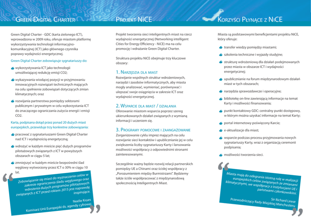 Green Digital Charter Green Digital Charter - GDC (karta zielonego ICT), wprowadzona w 2009 roku, oferuje miastom platformę wykorzystywania technologii informacyjnokomunikacyjnej (ICT) jako głównego czynnika poprawy wydajności energetycznej. wykorzystywania ICT jako technologii umożliwiającej redukcję emisji CO2; wykazywania wiodącej pozycji w przyjmowaniu innowacyjnych rozwiązań technicznych mających na celu spełnienie zobowiązań dotyczących zmian klimatycznych; oraz rozwijania partnerstwa pomiędzy sektorami publicznym i prywatnym w celu wykorzystania ICT do znaczącego ograniczania zużycia energii i emisji CO2. pracować z sygnatariuszami Green Digital Charter nad ICT i wydajnością energetyczną; wdrożyć w każdym mieście pięć dużych programów pilotażowych związanych z ICT w powyższych obszarach w ciągu 5 lat; zmniejszyć w każdym mieście bezpośredni ślad węglowy wytworzony przez ICT o 30% w ciągu 10 lat. w zania celów st do wyznac z ia ra m o ę o si eg ie n w u węglo ad Zobowiąza śl ia n ze h ic yc n w zakresie ogra mów pilotażo dę żych progra w u d ra ia ap n n że st ro je wd em 2015 ki ro ed rz u p z ICT inspir jące. związanych “ „ Neelie Kroes dy cyfrowej ejski ds. agen ii Europ Komisarz Un Projekt tworzenia sieci inteligentnych miast na rzecz wydajności energetycznej (Networking intelligent Cities for Energy Efficiency - NiCE) ma na celu promocję i wdrażanie Green Digital Charter. Miasta są podstawowymi beneficjentami projektu NiCE, który oferuje: transfer wiedzy pomiędzy miastami; szkolenia techniczne i wyjazdy studyjne; strukturę wdrożeniową dla działań podejmowanych przez miasta w obszarze ICT i wydajności energetycznej; upublicznianie na forum międzynarodowym działań miast w tych obszarach; narzędzia sprawozdawcze i operacyjne; bibliotekę on-line zawierającą informacje na temat Karty i możliwości finansowania; Oferowanie miastom wsparcia poprzez szereg ukierunkowanych działań związanych z wymianą informacji i uczeniem się. punkt kontaktowy GDC: centralny punkt dostępowy, w którym można uzyskać informacje na temat Karty; portal internetowy poświęcony Karcie; 3. Programy pomocowe i zaangażowanie e-aktualizacje dla miast; wsparcie podczas procesu przyjmowania nowych sygnatariuszy Karty, wraz z organizacją ceremonii podpisania; możliwości tworzenia sieci. 1. Narzędzia dla miast Karta, podpisana dotąd przez ponad 20 dużych miast europejskich, przewiduje trzy konkretne zobowiązania: Korzyści Płynące z NiCE Struktura projektu NiCE obejmuje trzy kluczowe obszary: Green Digital Charter zobowiązuje sygnatariuszy do: Projekt NiCE Rozwijanie wspólnych struktur wdrożeniowych, narzędzi i zasobów informatycznych, aby miasta mogły analizować, wymieniać, porównywać i ulepszać swoje osiągnięcia w zakresie ICT oraz wydajności energetycznej. 2. Wsparcie dla miast / działania Zorganizowanie cyklu imprez mających na celu rozwijanie sieci kontaktów i upublicznianie jej w celu zwiększenia liczby sygnatariuszy Karty i lansowania możliwości współpracy z odpowiednimi stronami zainteresowanymi. Szczególnie ważny będzie rozwój relacji partnerskich pomiędzy UE a Chinami oraz ścisłej współpracy z „Porozumieniem między Burmistrzami”. Będziemy także ściśle współpracować z międzynarodową społecznością Inteligentnych Miast. “ Miasta mają do odeg europejskich rania istotną rolę w real izacji celów związa klimatycznym nych ze zmia i, we współp n ami racy z instyt państwami cz ucjami UE i łonkowskim i. Przewodnic zący R „ Sir Richard Le ese ady Miejskiej Manchesteru Kontakt Śledź nasze postępy na stronie: www.greendigitalcharter.eu i zapisz się, aby otrzymywać aktualizacje drogą elektroniczną Projekt NiCE został zainicjowany we wrześniu 2011 roku i będzie trwać do lutego 2014 roku. Projekt NiCE prowadzony jest przez EUROCITIES w konsorcjum z Clicks and Links Ltd, miastem Manchester oraz Instytutem Ekologicznego Rozwoju Przestrzeni im. Leibniza. Networking intelligent Cities for Energy Efficiency W sprawie uzyskania dodatkowych informacji o Green Digital Charter i projekcie NiCE, łącznie z informacjami na temat przystąpienia do NiCE lub podpisania Karty, prosimy o kontakt z: Giulia Campodonico NiCE project coordinator @: [email protected] T: +32 2 552 08 46 Skype: giuliacampodonico.eurocities www.greendigitalcharter.eu Projekt NiCE finansowany jest w ramach VII Programu ramowego w zakresie badań i rozwoju technologicznego w dziedzinie technologii informacyjno-komunikacyjnych. Autorzy ponoszą wyłączną odpowiedzialność za treść niniejszej publikacji. Publikacja ta może nie odzwierciedlać opinii Unii Europejskiej. Komisja Europejska nie ponosi odpowiedzialności za jakiekolwiek wykorzystanie zawartych tu informacji.