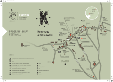 MAPA.pdf 2011-09-02 14:05:06 WROCŁAW trasa 73km WAŁBRZYCH SOKOŁOWSKO KINO SALA GIER i ZABAW KINO TEATR ZDROWIE WAY STUDIO - NAGRANIA WYSTAWA FOTOGRAFII P.JAXA SKLEP SKLEP UL UL. GŁ ÓWNA A N OL K SZ “SOKOŁOWSKA PORTRET WŁASNY” PENSJONAT RADOSNO PLAC im. K.KIEŚLOWSKIEGO KINO PLENEROWE KINO PLENEROWE UL. GŁÓWNA UL. GŁÓWNA 5 KOŚCIÓŁ KAWIARNIA FESTIWALOWA INFO BIBLIOTEKA UL KINO BIAŁY ORZEŁ A UL. WISŁAWSKA AN ÓŻ .R PKS KIERUNEK WAŁBRZYCH W ŁÓ .G . UL mini KINO NON STOP “PÓŁPORTRETY” “KRZYŚ” PENSJONAT EDEN NA “KOCHANI LUDZIE” WA KO AR .P UL ZAMEK LABORATORIUM KULTURY KINO PLENEROWE Laboratorium Kultury w odbudowywanym, dawnym Sanatorium dr Brehmera Internet Wystawa fotografii “Krzyś” w kamienicy Krzysztofa Kieślowskiego WiFi Wystawa fotografii Piotr Jaxa Informacja festiwalowa Akcja artystyczna “Półportrety”, Leszek Krutulski Sklep Wystawa “Kochani Ludzie”, Jacek Bąkowski Restauracja / Lokal gastronomiczny Wystawa fotografii w przestrzenii “Sokołowska portret własny” Nocleg Działania artystyczne studentów ASP Kawiarnia CERKIEW A ZN WAY Studio, Who Are You? - projekt “Gadające głowy dzisiaj” PARK PENSJONAT - OŚRODEK EKUMENICZNY EC RÓŻANKA N ŁO Kino .S UL Kino plenerowe PENSJONAT LEŚNE ŹRÓDŁO UL. GŁÓWNA 12A ŁAWS KA SKLEP BIURO FESTIWALU PROGRAM / MAPA FESTIWALU UL. W IS UL. GŁÓWNA 36 STAW