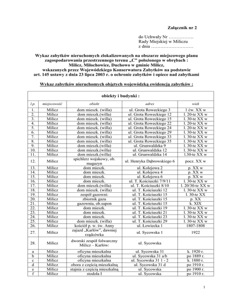 Załącznik nr 2 do Uchwały Nr ……………. Rady Miejskiej w Miliczu z dnia ……………………… Wykaz zabytków nieruchomych zlokalizowanych na obszarze miejscowego planu zagospodarowania przestrzennego terenu „C” połoŜonego w obrębach : Milicz, Miłochowice, Duchowo w gminie Milicz, wskazanych przez Wojewódzkiego Konserwatora Zabytków na podstawie art. 145 ustawy z dnia 23 lipca 2003 r. o ochronie zabytków i opiece nad zabytkami Wykaz zabytków nieruchomych objętych wojewódzką ewidencją zabytków : obiekty i budynki : l.p. miejscowość obiekt adres wiek 1. 2. 3. 4. 5. 6. 7. 8. 9. 10. 11. Milicz Milicz Milicz Milicz Milicz Milicz Milicz Milicz Milicz Milicz Milicz ul. Grota Roweckiego 3 ul. Grota Roweckiego 12 ul. Grota Roweckiego 15 ul. Grota Roweckiego 22 ul. Grota Roweckiego 24 ul. Grota Roweckiego 29 ul. Grota Roweckiego 33 ul. Grota Roweckiego 35 ul. Grunwaldzka 9 ul. Grunwaldzka 12 ul. Grunwaldzka 14 1 ćw. XX w l. 20-te XX w l. 30-te XX w l. 20-te XX w l. 20-te XX w l. 30-te XX w l. 30-te XX w l. 30-te XX w l. 30-te XX w l. 30-te XX w l.30-te XX w 12. Milicz ul. Henryka Dąbrowskiego 6 pocz. XX w 13. 14. 15. 16. 17. 18. 19. 20. 21. 22. 23. 24. 25. 26. Milicz Milicz Milicz Milicz Milicz Milicz Milicz Milicz Milicz Milicz Milicz Milicz Milicz Milicz ul. Kolejowa 2 ul. Kolejowa 4 ul. Kolejowa 6 ul. T. Kościuszki 7/9/11 ul. T. Kościuszki 8/10 ul. T. Kościuszki 12 ul. T. Kościuszki 15 ul. T. Kościuszki 15 ul. T. Kościuszki 15 ul. T. Kościuszki 19 ul. T. Kościuszki 21 ul. T. Kościuszki 23 ul. T. Kościuszki 29 ul. Łowiecka 1 p. XX w p. XX w p. XX w l. 30-te XX w l. 20/30-te XX w l. 30-te XX w l. 30-te XX p. XX k. XIX l. 30-te XX w l. 30-te XX w l. 30-te XX w l. 30-te XX w 1807-1808 27. Milicz dom mieszk. (willa) dom mieszk.(willa) dom mieszk. (willa) dom mieszk. (willa) dom mieszk. (willa) dom mieszk. (willa) dom mieszk. (willa) dom mieszk. (willa) dom mieszk.(willa) dom mieszk.(willa) dom mieszk.(willa) spichlerz wojskowy, ob. magazyn dom mieszk. dom mieszk. dom mieszk. dom mieszk. dom mieszk.(willa) dom mieszk. (willa) zespół gazowni: zbiornik gazu gazownia, ob.supon dom mieszk. dom mieszk. dom mieszk. dom mieszk. (willa) kościół p. w. św. Anny zajazd „Karłów”, dawniej rządcówka ul. Sycowska 1 1922 28. Milicz dworski zespół folwarczny Milicz – Karłów: ul. Sycowska a b c d e f Milicz Milicz Milicz Milicz Milicz Milicz oficyna mieszkalna oficyna mieszkalna oficyna mieszkalna obora z częścią mieszkalną stajnia z częścią mieszkalną stodoła I ul. Sycowska 31 ul. Sycowska 31 a/b ul. Sycowska 31 1 - 2 ul. Sycowska 31 d ul. Sycowska ul. Sycowska k. 1920 r. po 1889 r. k. 1880 r. po 1910 r. po 1900 r. po 1910 r. 1 g Milicz h Milicz i j k 29. 30. 31. 32. 33. 34. 35. 36. 37. 38. Milicz Milicz Milicz Milicz Milicz Milicz Milicz Milicz Milicz Milicz Milicz Milicz Milicz 39a Milicz 39 b Milicz 40. Milicz 41. Milicz 42. Milicz 43. Milicz 44. Milicz 45. Milicz 46. 47. 48. Milicz Milicz Milicz stodoła II dyspozycja wewnętrznego majdanu gospodarczego Spichlerz Gołębnik Park dom mieszk., ob. bank dom mieszk.(willa) dom mieszk.(kamienica) dom mieszk.(kamienica) dom mieszk. dom mieszk. dom mieszk.(kamienica) dom mieszk. dom mieszk.(kamienica) dom mieszk.(kamienica) obiekt magazynowohandlowy, d. mleczarnia Bud. produkcyjny mleczarni dom mieszk.(kamienica), ob.biura d. gorzelnia Starostwo Powiatowe, Rada Powiatu Milicz, Powiatowy Urząd Pracy, dawniej dom mieszk. Starostwo Powiatowe, dawniej dom mieszk. Dom mieszk., ob. biura budynek biurowy Gospodarstwa Sadowniczego magazyn dom mieszk.(kamienica) transformator ul. Sycowska k. 1900 r. ul. Sycowska ul. Sycowska ul. Sycowska ul. Trzebnicka 7 ul. Trzebnicka 9 ul. Wojska Polskiego 17 ul. Wojska Polskiego 18 ul. Wojska Polskiego 19 ul. Wojska Polskiego 20 ul. Wojska Polskiego 24 ul. Wojska Polskiego 25 ul. Wojska Polskiego 28 ul. Wojska Polskiego 33 po 1880 po 1920 XIX/XX XIX/XX w 1904 r. 4 ćw. XIX w 4 ćw. XIX w XIX/XX k. XIX 1909 r. 4 ćw. XIX w 4 ćw. XIX w 4 ćw. XIX w ul. Wojska Polskiego 35 1893 ul. Wojska Polskiego 35 XIX/XX ul. Wojska Polskiego 36 l. 20-te XX w ul. Wojska Polskiego 37 1893 ul. Wojska Polskiego 38 1911 ul. Wojska Polskiego 40 a pocz. XX w ul. Wojska Polskiego 41 k. XIX ul. Wojska Polskiego 43 k. XIX w ul. Wojska Polskiego 43 ul. Wojska Polskiego 44 ul. Wojska Polskiego 49 k. XIX w 4 ćw. XIX w p. XX tereny zielone: l.p. miejscowość teren adres 49. Miłochowice na północ od wsi 50. Milicz dawny cmentarz cmentarz katolicki, ob. nie uŜytkowany ul. Łowiecka wiek 1808 r. stanowiska archeologiczne: l.p. AZP nr na mapie obręb Funkcja 51. 71 – 31 18/39 Milicz 52. 71 – 31 15/42 Milicz 53. 54. 71 – 31 71 - 31 17/38 11/32 Milicz Milicz punkt osadniczy grodzisko grodzisko stoŜkowate ślad osadnictwa ślad osadnictwa kultura chronologia średniowiecze średniowiecze średniowiecze epoka kamienia 2