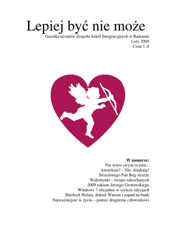 Lepiej być nie może Gazetka uczniów Zespołu Szkół Integracyjnych w Radomiu Luty 2009 Cena 1 zł W numerze: Nie wierz swym oczom... Anoreksja? – Nie, dziękuję! Strzeżonego Pan Bóg strzeże Walentynki – święto zakochanych 2009 rokiem Jerzego Grotowskiego Windows 7 oficjalnie w sześciu edycjach Sherlock Holms, doktor Watson i napad na bank Najważniejsze w życiu – pomoc drugiemu człowiekowi Od redakcji 2 Opiekunki sekcji redakcyjnej: Agnieszka Iwańska Renata Jesionek Irmina Warmiak Autorzy artykułów: Michał Cebula Adrianna Iwańska Anna Kaczmarska Dawid Kwiecień Daniel Nagrodzki Oliwia Pasik Piotr Pażdzior Przemysław Pstrągowski Patrycja Sułek ...Zima postanowiła jednak zagościć u Nas dłużej i od kilku dni bezustannie pada śnieg. No, a skoro śnieg za oknem, zimno i nie chce się wychodzić z domu, warto zajrzeć do nowego numeru naszej szkolnej gazetki. Przeczytacie w niej o tym, że najważniejsze w życiu to pomoc drugiemu człowiekowi a także o obchodach Roku Grotowskiego. Przypomnimy Wam kilka zasad bezpiecznego spędzania czasu wolnego oraz o tym, że „kochanego ciała nigdy nie za wiele”. W tym wydaniu zapraszamy Was do wspólnego zastanowienia się nad tym, czy należy okazywać uczucia oraz udowodnimy, że warto kochać i być kochanym. Na zimowe wieczory proponujemy nowe przygody Sherlocka Holmesa i jego przyjaciela Watsona. Przedstawiamy również oficjalne edycje Windowsa 7. Życzymy przyjemnej lektury . P.S. Zapraszamy wszystkich chętnych do współtworzenia naszej gazetki. Redakcja Adres redakcji: ul: Wierzbicka 81/83 26-600 Radom Aktualności 3 Strzeżonego Pan Bóg strzeże Dobrze jest, że w trakcie roku szkolnego mamy kilka przerw w nauce. Chyba najbardziej wypatrywanym odpoczynkiem są ferie zimowe, czyli dwa tygodnie laby, podczas których raczej nikt z nas nie myśli o lekcjach, klasówkach i różnych szkolnych sprawach. I mimo tego, że niektórzy wyjechali, a inni zostali w domu, to każdego cieszą wolne dni, które można poświęcić na wypoczynek i robienie tego, co lubimy. Jednak, aby ten okres okazał się dla wszystkich szczęśliwym, to mimo „rozluźnienia” musimy pamiętać o tym, by dobrej zabawie towarzyszyła zawsze rozwaga i zdrowy rozsądek. Dlatego należy przestrzegać rad rodziców, którzy przecież zawsze chcą naszego dobra. Ktoś złośliwie mógłby powiedzieć: to siedźmy i nie róbmy nic, ale przecież nie w tym rzecz, bo jak mówi powiedzenie: „strzeżonego Pan Bóg strzeże”. Miejmy świadomość, że ferie to nie urlop od myślenia, zwłaszcza, że często bezmyślnym postępowaniem możemy skrzywdzić innych. W czasie zabawy i wypoczynku nie można zapomnieć o podstawowych zasadach bezpieczeństwa. Nie ślizgajmy się po lodzie na rzece lub stawie, bo już dawno minęły czasy mroźnych zim, a lód jest kruchy i grozi pęknięciem. Nie chodźmy po tej części górki, po której zjeżdżają na sankach, czy nartach inne osoby, aby im nie przeszkadzać i nie spowodować kolizji. W czasie zjeżdżania ze stoku zachowujmy bezpieczną odległość między innymi narciarzami, nie zatrzymujmy się nagle bez potrzeby, a co najważniejsze nie zjeżdżajmy na tzw. strzałę z niebezpieczną prędkością. Pamiętajmy o odpowiednim stroju i kasku, który podczas upadku może uratować nam życie. Amatorzy zabaw na śniegu muszą wiedzieć, że śnieżki nie mogą być za twarde, a już na pewno nie z kamieniem w środku. Rzucanie śnieżkami w samochody, zwłaszcza będące w ruchu, może spowodować wypadek. Podczas zorganizowanych wyjazdów słuchamy poleceń opiekunów i nie oddalamy się od grupy, gdyż szczególnie podczas górskich wycieczek, o tragedię nietrudno. Ci, którzy zostali w domu, nie mogli zapomnieć o zasadach nieufności w stosunku do obcych. Nie otwierajmy drzwi żadnym panom z gazowni, hydraulikom i innym nieznajomym domokrążcom. Zawsze, gdy usłyszymy dzwonek lub pukanie do drzwi, sprawdźmy kto to – wyjrzyjmy przez okno lub spójrzmy przez wizjer w drzwiach. Jeśli nie mamy ochoty na zabawę na dworze, lepiej przeczytać jest dobrą książkę niż kolejne dni spędzać przy komputerze. Bezpieczne ferie to czas rekonwalescencji dla naszego organizmu przed kolejnym etapem roku szkolnego. Teraz już tylko czekamy niecierpliwie na wakacje. Piotr Paździor, kl. 2gD Aktualności 4 NAJWAŻNIEJSZE W ŻYCIU – POMOC DRUGIEMU CZŁOWIEKOWI! „Są takie chwile kiedy z radością unosimy ręce do góry i wykrzykujemy swoją miłość do ludzi. Są takie chwile, które trwają wiecznie w naszych sercach i każą wierzyć, że świat potrafi być przyjazny i pełen życzliwości. Są takie chwile kiedy wiara w człowieka zaczyna być dotykalna i rozpala nasze marzenia o szczęściu wszystkich ludzi.” 9 stycznia 2009 roku po raz pierwszy w naszej szkole odbyła się zbiórka pieniędzy na rzecz Wielkiej Orkiestry Świątecznej Pomocy. W czasie kwesty zebrano 842,79 zł. Był to niezwykle radosny dzień niesienia pomocy najmłodszym i najbardziej potrzebującym. Cieszymy się, że choć trochę mogliśmy wspomóc akcję. Liczymy, że w przyszłym roku uda nam się przekazać fundacji wyższą kwotę. Chcemy podziękować rodzicom oraz uczniom, którzy wsparli akcję jak i tym, którzy byli zaangażowani w przygotowanie zbiórki. Oliwia Pasik, kl. 3gD 11 stycznia 2009 r. odbył się XVII Finał Wielkiej Orkiestry Świątecznej Pomocy. Tym razem głównym tematem było WCZESNE WYKRYWANIE NOWOTWORÓW U DZIECI. Ponadto realizowane było także hasło: W zdrowym ciele zdrowy duch! Może na początek trochę o fundacji. W skład zarządu wchodzą 4 osoby: Bohdan Maruszewski, Jerzy Owsiak, Lidia Niedźwiedzka, Piotr Burczyński. Pierwszy finał został zorganizowany 16 lat temu – 3 stycznia 1993r. i był poświęcony chorobom serca. Wtedy nikt nie spodziewał się, jakie przyniesie on korzyści. Miał to być jednorazowe wydarzenie, zainspirowane rozmową Bohdana i Piotra w telewizyjnej