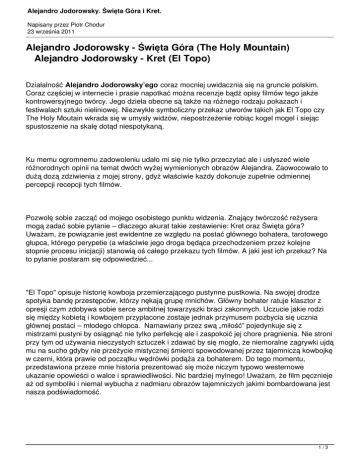 Alejandro Jodorowsky. Święta Góra i Kret. Napisany przez Piotr Chodur 23 września 2011 Alejandro Jodorowsky - Święta Góra (The Holy Mountain) Alejandro Jodorowsky - Kret (El Topo) Działalność Alejandro Jodorowsky’ego coraz mocniej uwidacznia się na gruncie polskim. Coraz częściej w internecie i prasie napotkać można recenzje bądź opisy filmów tego jakże kontrowersyjnego twórcy. Jego dzieła obecne są także na różnego rodzaju pokazach i festiwalach sztuki nieliniowej. Niezwykle symboliczny przekaz utworów takich jak El Topo czy The Holy Moutain wkrada się w umysły widzów, niepostrzeżenie robiąc kogel mogel i siejąc spustoszenie na skalę dotąd niespotykaną. Ku memu ogromnemu zadowoleniu udało mi się nie tylko przeczytać ale i usłyszeć wiele różnorodnych opinii na temat dwóch wyżej wymienionych obrazów Alejandra. Zaowocowało to dużą dozą zdziwienia z mojej strony, gdyż właściwie każdy dokonuje zupełnie odmiennej percepcji recepcji tych filmów. Pozwolę sobie zacząć od mojego osobistego punktu widzenia. Znający twórczość reżysera mogą zadać sobie pytanie – dlaczego akurat takie zestawienie: Kret oraz Święta góra? Uważam, że powiązanie jest ewidentne ze względu na postać głównego bohatera, tarotowego głupca, którego perypetie (a właściwie jego droga będąca przechodzeniem przez kolejne stopnie procesu inicjacji) stanowią oś całego przekazu tych filmów. A jaki jest ich przekaz? Na to pytanie postaram się odpowiedzieć... "El Topo" opisuje historię kowboja przemierzającego pustynne pustkowia. Na swojej drodze spotyka bandę przestępców, którzy nękają grupę mnichów. Główny bohater ratuje klasztor z opresji czym zdobywa sobie serce ambitnej towarzyszki braci zakonnych. Uczucie jakie rodzi się między kobietą i kowbojem przypłacone zostaje jednak przymusem pozbycia się ucznia głównej postaci – młodego chłopca. Namawiany przez swą „miłość” pojedynkuje się z mistrzami pustyni by osiągnąć nie tylko perfekcję ale i zaspokoić jej chore pragnienia. Nie stroni przy tym od używania nieczystych sztuczek i zdawać by się mogło, że niemoralne zagrywki ujdą mu na sucho gdyby nie przeżycie mistycznej śmierci spowodowanej przez tajemniczą kowbojkę w czerni, która prawie od początku wędrówki podąża za bohaterem. Do tego momentu, przedstawiona przeze mnie historia prezentować się może niczym typowo westernowe ukazanie opowieści o walce i sprawiedliwości. Nic bardziej mylnego! Uważam, że film pęcznieje aż od symboliki i niemal wybucha z nadmiaru obrazów tajemniczych jakimi bombardowana jest nasza podświadomość. 1/3 Alejandro Jodorowsky. Święta Góra i Kret. Napisany przez Piotr Chodur 23 września 2011 Moja uproszczona interpretacja jest następująca: Kowboj to głupiec (jak już wcześniej wspomniałem) ale innego rodzaju niż idiota stereotypowy. Jest on jakby wielki, potężny, jego ego przejmuje kontrolę nad jaźnią (co jest objawem niebezpiecznym). Towarzyszy mu mały uczeń – niewinność. W momencie kiedy Kowboj poznaje kobietę wkracza w świat doznań dorosłych poprzez które wyzbyć musi się swej dziecięcej ale i czystej natury. Pada ofiarą nie tylko pożądania ale i chorobliwego pragnienia władzy, dominacji i bycia najlepszym. Po czasie, w postaci czarno ubranej kowbojki ujawnia się jego anima. W momencie konfrontacji ze swoją żeńską naturą symbol męskiego macho ulega totalnemu rozpadowi. Druga część filmu staje się odwrotnym lustrzanym odbiciem pierwszej. Ex-kowboj uratowany zostaje przez grupę żyjących w jaskiniach karłów i kalek, którzy oczekując od lat na ratunek, możliwość wyjścia z podziemnego świata cierpień (godny pochwały jest fakt zatrudniania przez reżysera ludzi niepełnosprawnych i odwaga w pokazywaniu ich). Osoby te dostrzegają w Głupcu zbawiciela, który czczony niczym bóstwo budzi się po latach i podejmuje się zadania uwolnienia swoich podopiecznych… Świat zewnętrzny nie jest jednak tak piękny jak wydaje się plemieniu kalek. Jest on pełen rozpusty i zepsucia z jednej strony, z drugiej zaś - hipokryzji religijnej. Nasz bohater upodobniony do buddyjskiego mnicha, wraz ze swoją małą przyjaciółką zarabia pieniądze ogrywając przedstawienia ulicznego teatrzyku. Pracuje by pomóc tym, którzy przywrócili go do życia. Przy okazji dochodzi do spotkania z porzuconym niegdyś chłopcem, który widząc upadek swojego mistrza, w ostateczności wybacza mu. Gdy dzieło życia Kreta-Głupca zostaje ukończone – ludzie z podziemi zostają uwolnieni – dochodzi do tragedii, ludzie z miasta zabijają ich. Kret dokonuje samospalenia. Wydaje mi się, że po przeżyciu śmierci i ponownych narodzinach Głupiec wkracza w nowy świat, w którym on sam podobny do karła uczy się żyć na nowo. Pozbawiony swojej niegdysiejszej mocy, nie posiadający materialnych dóbr dokonuje największego dzieła, dzieła miłości, gdyż poświęca się on dla mniejszych i słabszych od siebie ofiarując swoją godność, siłę, męskość i całe swoje poprzednie życie. Zastanawiająca jest pointa filmu. Dlaczego Ci mali giną i dzieło, poświęcenie głównego bohatera idzie na marne? Być może autorowi chodziło o postawienie ważnego dla ludzkości pytania – czy niemoralność zawsze musi zwyciężyć? Czy miłość przegrywa? Odpowiedzią na nie jest następne, legendarne już dzieło Jodorowsky’ego –Święta Góra. The Holy Moutain opowiada o losach kolejnego głupca, który pod wodzą Maga-Mistrza dokonuje ogromu pracy nad własnym rozwojem. Innymi uczniami są moralnie zepsuci, władcy i władczynie różnych sfer planetarnych. Celem ich wszystkich staje się dotarcie na świętą górę i doznanie oświecenia. Jakże wielkie jest ich zaskoczenie, gdy na końcu cały ich świat, trud, 2/3 Alejandro Jodorowsky. Święta Góra i Kret. Napisany przez Piotr Chodur 23 września 2011 wyzbywanie się sam