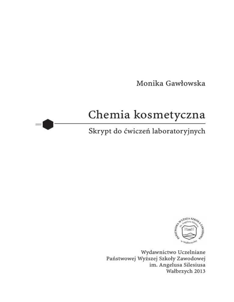 Monika Gawłowska Chemia kosmetyczna Skrypt do ćwiczeń laboratoryjnych Wydawnictwo Uczelniane Państwowej Wyższej Szkoły Zawodowej im. Angelusa Silesiusa Wałbrzych 2013 SPIS TREŚCI 1. Regulamin pracowni, przepisy BHP............................................................................ 5 2. Przygotowywanie roztworów o zadanym stężeniu procentowym i molowym .... 7 2.1. Przygotowywanie 100 ml 2% roztworu NaCl ............................................................ 9 2.2. Przygotowywanie 100 ml 1M roztworu HCl ............................................................ 10 3. Miareczkowanie alkacymetryczne............................................................................ 11 3.1. Oznaczanie stężenia roztworu NaOH przez miareczkowanie 0,1 M roztworem HCl wobec fenoloftaleiny jako wskaźnika .......................................... 12 3.2. Oznaczanie stężenia roztworu HCl przez miareczkowanie 0,1 M roztworem NaOH wobec oranżu metylowego jako wskaźnika ............................ 13 4. 4.1. 4.2. 4.3. pH roztworów wodnych .............................................................................................. 15 Pomiar pH roztworów wodnych za pomocą pehametru ...................................... 18 Określanie odczynu roztworów wodnych za pomocą wskaźników pH .............. 18 Badanie wpływu rozcieńczania na pH roztworu buforowego .............................. 19 5. 5.1. 5.2. 5.3. 5.4. Metody rozdzielania i oczyszczania substancji ...................................................... 21 Rozdzielanie mieszaniny acetonu i wody za pomocą destylacji prostej ............ 28 Sublimacja kamfory .................................................................................................... 29 Izolacja olejku cytrynowego ze skórki cytryny za pomocą ekstrakcji ciągłej...... 30 Chromatografia TLC wybranych olejków eterycznych stosowanych w kosmetykach ............................................................................................................ 31 6. Analiza jakościowa wybranych biopierwiastków występujących w preparatach kosmetycznych .................................................................................. 33 6.1. Reakcje charakterystyczne biopierwiastków .......................................................... 33 6.2. Wykrywanie jonów pierwiastków biologicznie aktywnych w badanej próbce 39 7. 7.1. 7.2. 7.3. Związki kompleksowe ................................................................................................ 41 Otrzymywanie wybranych związków kompleksowych .......................................... 42 Badanie trwałości związków kompleksowych ........................................................ 43 Reakcje wymiany w związkach kompleksowych .................................................... 44 8. Charakterystyka głównych klas związków organicznych .................................... 45 Niektóre reakcje charakterystyczne wybranych grup związków organicznych Alkohole i fenole .......................................................................................................... 55 Aldehydy i ketony ........................................................................................................ 56 Kwasy karboksylowe, estry, aminy ............................................................................ 57 Aminokwasy, peptydy, białka .................................................................................... 59 8.1. 8.2. 8.3. 8.4. 9. Mydła jako podstawowe preparaty kosmetyczne.................................................... 61 9.1. Otrzymywanie mydła i badanie jego własności .................................................... 63 10. Układy koloidalne ........................................................................................................ 65 10.1. Otrzymywanie emulsji o/w i w/o oraz ich ocena .................................................... 67 11. Witaminy zamknięte w kosmetykach ...................................................................... 69 11.1. Wykrywanie witamin A, E i C w preparatach kosmetycznych.............................. 75 12. Oznaczanie gęstości względnej i bezwzględnej gliceryny i jej wodnych roztworów ............................................................................................ 77 12.1. Wyznaczanie gęstości względnej gliceryny i jej roztworów wodnych ................ 79 12.2. Wyznaczanie gęstości bezwzględnej gliceryny i jej roztworów wodnych .......... 79 Spis rycin ................................................................................................................................ 81 Spis tabel.................................................................................................................................. 82 Literatura i adresy internetowe .......................................................................................... 83
