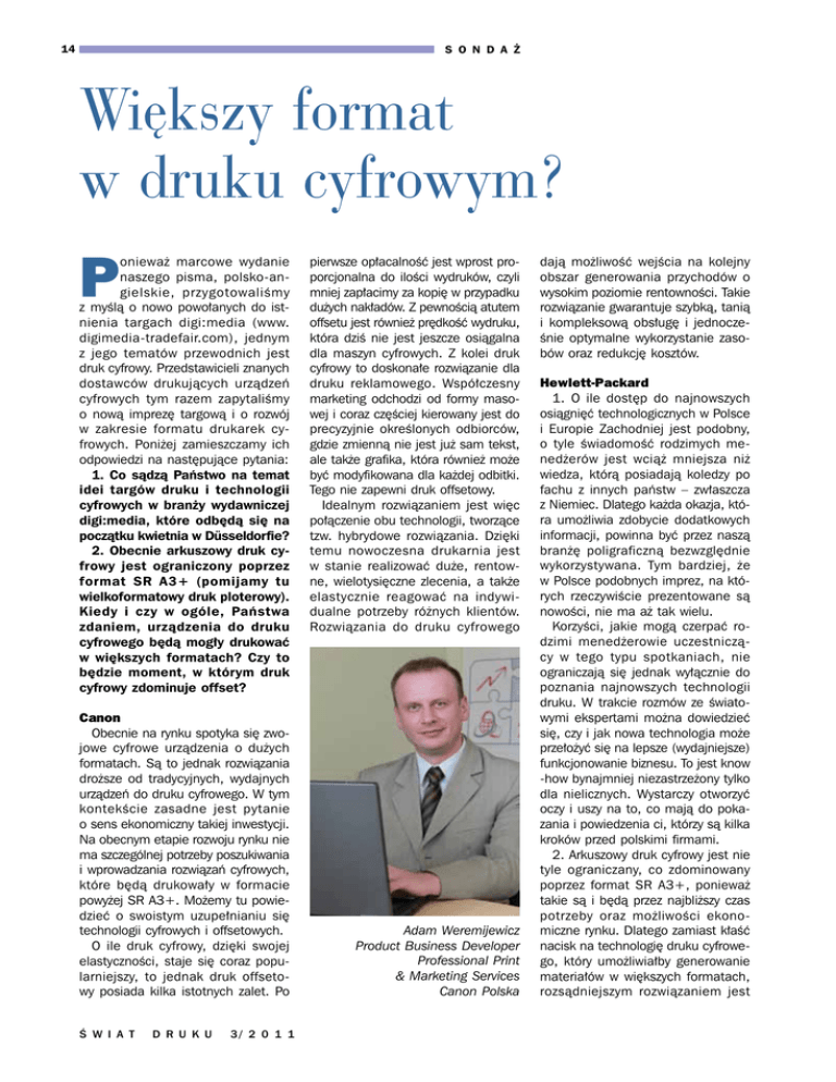 S O N D A Ż 14 Większy format w druku cyfrowym? P onieważ marcowe wydanie naszego pisma, polsko-angielskie, przygotowaliśmy z myślą o nowo powołanych do istnienia targach digi:media (www. digimedia-tradefair.com), jednym z jego tematów przewodnich jest druk cyfrowy. Przedstawicieli znanych dostawców drukujących urządzeń cyfrowych tym razem zapytaliśmy o nową imprezę targową i o rozwój w zakresie formatu drukarek cyfrowych. Poniżej zamieszczamy ich odpowiedzi na następujące pytania: 1. Co sądzą Państwo na temat idei targów druku i technologii cyfrowych w branży wydawniczej digi:media, które odbędą się na początku kwietnia w Düsseldorfie? 2. Obecnie arkuszowy druk cyfrowy jest ograniczony poprzez format SR A3+ (pomijamy tu wielkoformatowy druk ploterowy). Kiedy i czy w ogóle, Państwa zdaniem, urządzenia do druku cyfrowego będą mogły drukować w większych formatach? Czy to będzie moment, w którym druk cyfrowy zdominuje offset? Canon Obecnie na rynku spotyka się zwojowe cyfrowe urządzenia o dużych formatach. Są to jednak rozwiązania droższe od tradycyjnych, wydajnych urządzeń do druku cyfrowego. W tym kontekście zasadne jest pytanie o sens ekonomiczny takiej inwestycji. Na obecnym etapie rozwoju rynku nie ma szczególnej potrzeby poszukiwania i wprowadzania rozwiązań cyfrowych, które będą drukowały w formacie powyżej SR A3+. Możemy tu powiedzieć o swoistym uzupełnianiu się technologii cyfrowych i offsetowych. O ile druk cyfrowy, dzięki swojej elastyczności, staje się coraz popularniejszy, to jednak druk offsetowy posiada kilka istotnych zalet. Po ś W I A T D R U K U 3/ 2 0 1 1 pierwsze opłacalność jest wprost proporcjonalna do ilości wydruków, czyli mniej zapłacimy za kopię w przypadku dużych nakładów. Z pewnością atutem offsetu jest również prędkość wydruku, która dziś nie jest jeszcze osiągalna dla maszyn cyfrowych. Z kolei druk cyfrowy to doskonałe rozwiązanie dla druku reklamowego. Współczesny marketing odchodzi od formy masowej i coraz częściej kierowany jest do precyzyjnie określonych odbiorców, gdzie zmienną nie jest już sam tekst, ale także grafika, która również może być modyfikowana dla każdej odbitki. Tego nie zapewni druk offsetowy. Idealnym rozwiązaniem jest więc połączenie obu technologii, tworzące tzw. hybrydowe rozwiązania. Dzięki temu nowoczesna drukarnia jest w stanie realizować duże, rentowne, wielotysięczne zlecenia, a także elastycznie reagować na indywidualne potrzeby różnych klientów. Rozwiązania do druku cyfrowego Adam Weremijewicz Product Business Developer Professional Print & Marketing Services Canon Polska dają możliwość wejścia na kolejny obszar generowania przychodów o wysokim poziomie rentowności. Takie rozwiązanie gwarantuje szybką, tanią i kompleksową obsługę i jednocześnie optymalne wykorzystanie zasobów oraz redukcję kosztów. Hewlett-Packard 1. O ile dostęp do najnowszych osiągnięć technologicznych w Polsce i Europie Zachodniej jest podobny, o tyle świadomość rodzimych menedżerów jest wciąż mniejsza niż wiedza, którą posiadają koledzy po fachu z innych państw – zwłaszcza z Niemiec. Dlatego każda okazja, która umożliwia zdobycie dodatkowych informacji, powinna być przez naszą branżę poligraficzną bezwzględnie wykorzystywana. Tym bardziej, że w Polsce podobnych imprez, na których rzeczywiście prezentowane są nowości, nie ma aż tak wielu. Korzyści, jakie mogą czerpać rodzimi menedżerowie uczestniczący w tego typu spotkaniach, nie ograniczają się jednak wyłącznie do poznania najnowszych technologii druku. W trakcie rozmów ze światowymi ekspertami można dowiedzieć się, czy i jak nowa technologia może przełożyć się na lepsze (wydajniejsze) funkcjonowanie biznesu. To jest know -how bynajmniej niezastrzeżony tylko dla nielicznych. Wystarczy otworzyć oczy i uszy na to, co mają do pokazania i powiedzenia ci, którzy są kilka kroków przed polskimi firmami. 2. Arkuszowy druk cyfrowy jest nie tyle ograniczany, co zdominowany poprzez format SR A3+, ponieważ takie są i będą przez najbliższy czas potrzeby oraz możliwości ekonomiczne rynku. Dlatego zamiast kłaść nacisk na technologię druku cyfrowego, który umożliwiałby generowanie materiałów w większych formatach, rozsądniejszym rozwiązaniem jest S O N D A Ż rozwijanie i wdrażanie aplikacji wspomagających zarządzanie drukiem. Korzyści, jakie można uzyskać w tym obszarze (większa wydajność, niższe koszty), wymagają pokonania nieporównywalnie niższego progu inwestycyjnego niż rozbudowa portfolio usług poprzez wprowadzenie technologii zadruku większych formatów. obciążenia w postaci wykończenia, na przykład dodatkowego docinania. Mając na względzie te wszystkie czynniki, my jako producent nie mamy zamiarów podążać w stronę offsetu, zmieniając wielkość formatów. Obserwujemy tak duże zapotrzebowanie na technologię cyfrową, która jest obecnie dostępna, że nie widzimy realnej potrzeby zmiany rozwiązań. Przynajmniej na tę chwilę. Oczywiście, jeśli pojawi się w przyszłości realna potrzeba rynkowa ze strony naszych klientów – nie będziemy zamykać się na jej urzeczywistnienie. 15 2. Nie jest prawdą, że druk cyfrowy jest ograniczony do formatu SR A3+. Istnieją już na rynku urządzenia arkuszowe, które drukują w formacie 350×500 (np. VarioPrint 6000), jak również urządzenia rolowe drukujące w większym niż SR A3+ formacie. Rynek poligraficzny, który wyrósł na urządzeniach offsetowych, w których standardem są formaty „B”, oczekuje również od rozwiązań cyfrowych możliwości druku właśnie w takich formatach. Nie zawsze jest to konieczne i bardzo często jest to tylko kwestia zmiany mentalności. Natomiast na pewno nie nastąpi to z dnia na dzień. Dlatego dla firm oferujących rozwiązania do druku cyfrowego istotne jest, aby wyjść na przeciw oczeki