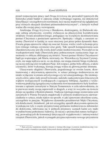 Kamil KOPANIA 418 przed rozpoczęciem pracy nad Drogą krzyżową nie prowadził typowych dla historyka sztuki badań w zakresie sztuki wybranego regionu, nie dokonywał klasyfikacji i szczegółowych rozróżnień, lecz raczej inspirował się oglądanymi przy różnych okazjach dziełami późnośredniowiecznymi18, z których wybrał ważne dla swojej pracy rozwiązania. Analizując Drogę krzyżową z Burakowa, dostrzegamy, że Bielawski stosuje zabieg artystyczny, czytelny zwłaszcza na płaszczyźnie kształtowania struktury świata przedstawionego, polegający na wyraźnym skontrastowaniu postaci Chrystusa z postaciami oprawców. Spokojny i uległy, a zarazem samotny Zbawiciel w każdej ze scen otoczony jest przez pełen dynamiki tłum. Zwarta grupa oprawców zdaje się osaczać Jezusa, wielu z nich wykonuje przy tym różnego rodzaju czynności oraz gesty. Taki sposób komponowania scen charakterystyczny jest dla wielu dzieł sztuki średniowiecznej. Pozwalał on na wyeksponowanie męki Zbawiciela przy jednoczesnym zaznaczeniu Jego samotności w obliczu zbliżającej się śmierci. Nawet postaci bliskie Chrystusowi bądź go wspierające, jak Maria, niewiasty, św. Weronika czy Szymon Cyrenejczyk, nie mają wpływu na to, co się dzieje, nie mogą zmienić biegu wydarzeń, są raczej milczącymi świadkami Pasji. Ich rozpacz, pełne bólu oblicza, a także czynności, które wykonują, kierują uwagę widza na główną postać dramatu. Ukazywanie uległości Zbawiciela, pogodzonego ze swoim losem, skontrastowanej z aktywnością oprawców, w sztuce późnego średniowiecza nie miało wyłącznie wymiaru artystycznego czy też emocjonalnego. Do istotniejszych celów, jakie stały przed twórcami, należało zaakcentowanie kluczowych wątków teologicznych wynikających z egzegezy biblijnej. Zgodnie z wielowiekową praktyką egzegetyczną wydarzenia nowotestamentowe były konfrontowane z opisami zawartymi w Starym Testamencie w celu udowodnienia, że te pierwsze miały swoją zapowiedź w drugich, a więc że wszystko na świecie dzieje się zgodnie z Boskim planem. Tradycja typologicznego zestawiania scen zawartych w Piśmie Świętym znajdowała w późnym średniowieczu odzwierciedlenie w sztuce, miała wpływ na sposób, w jaki ujmowano określone sceny, szczególnie te pasyjne. Wyjątkowa dynamika przedstawień Męki Chrystusa, ich detaliczność, brutalność, jak też szczególny sposób ukazywania oprawców wynikają nie tyle z często przypisywanej późnemu średniowieczu skłonności do doloryzmu, lubowania się w pełnych przemocy scenach kaźni czy mało wyrafinowanej pobożności ludowej, ile raczej z przemyśleń natury teologicznej, prowadzących do konstatacji dotyczących wyjątkowości i intensywności cierpień Zbawiciela, jakich wymagało przypieczętowanie nowego przymierza Sam artysta wspomina między innymi o ważnej dla niego wystawie średniowiecznej i nowożytnej sztuki o tematyce pasyjnej, którą miał okazję oglądać w Kopenhadze. 18 Tradycja, aktualizacja i obrazowanie męki Zbawiciela 419 z Bogiem i danie ludziom szansy na życie wieczne19. Przedstawienia umęczonego ciała Chrystusa, naznaczonego śladami męki, poranionego, obitego, stanowiącego wymowny dowód bezgranicznej miłości Boga do człowieka, miały poruszyć sumienia wiernych, skłonić ich do głębokiej modlitwy oraz refleksji nad własnym zachowaniem w kontekście spraw ostatecznych20. Myślenie typologiczne ujawnia się w sztuce średniowiecza w inny jeszcze, zaskakujący dla współczesnego widza sposób. Mowa o motywach ikonograficznych, które traktowane są zazwyczaj jako rodzajowe, na przykład takich, jak psy pojawiające się w różnych momentach Pasji Chrystusa. W stacji IX Drogi krzyżowej Bielawskiego znajdujący się na pierwszym planie pies stanowi swoisty odpowiednik umundurowanego oprawcy trzymającego pałkę. Analizując głębiej problem obecności psów w sztuce późnego średniowiecza, zauważyć możemy, że na niektórych obrazach czy dziełach graficznych przybierają one pozy analogiczne do charakterystycznych dla stojących blisko nich oprawców. Wykształconemu odbiorcy z tej epoki zwierzęta obecne w czasie męki Zbawiciela przywodziły na myśl określone fragmenty Starego Testamentu, na przykład psalmu, w którym czytamy: „Bo psy mnie opadają, / osacza mnie zgraja złoczyńców. / Przebili ręce i nogi moje, / policzyć mogę wszystkie moje kości. / A oni się wpatrują, sycą mym widokiem; / moje szaty dzielą między siebie / i losy rzucają o moją suknię” (Ps 22,17-19)21. W sztuce późnego średniowiecza przedstawienia cierpień Chrystusa wzmacniane były dodatkowo poprzez wymowne gesty postaci oprawców, profilowe ujęcie pozwalające wyostrzyć rysy, jak też wyraz ich twarzy, pełnych okrucieństwa, zaciętości, a przede wszystkim zwyczajnie brzydkich. Geneza tego rodzaju rozwiązań jest dla większości współczesnych odbiorców niezrozumiała. Wizerunki wynaturzonych fizycznie, wykonujących różnego 19 Powyższe zagadnienia szeroko opracował James H. Marrow. Zob. J.H. M a r r o w, Passion Iconography in Northern European Art of the late Middle Ages and Early Renaissance:. A Study of Transformation of Sacred Metaphor into Descriptive Narrative, Van Ghemmert Publishing Co., Kortrijk 1979; t e n ż e, Inventing the Passion in the Late Middle Ages, w: The Passion Story: From Visual Representation to Social Drama, red. M. Kupfer, J.H. Marrow, Penn State University Press, University Park 2008, s. 23-52. Zob. też: S. K o b i e l u s, Concordia Novi et Veteris Testamenti: zapowiedzi dzieła odkupienia i jego spełnienie w teologii i sztuce średniowiecza, Wydawnictwo Pallottinum, Poznań 2013; F.P. P i c k e r i n g, Literatur und darstellende Kunst im Mittelalter, Erich Schmidt Verlag, Berlin 1966. 20 Zob. K. K o p a n i a, Słowo – obraz – teatr. Uwagi na temat „Rozmyślań dominikańskich”, „Biuletyn Historii Sztuki” 6