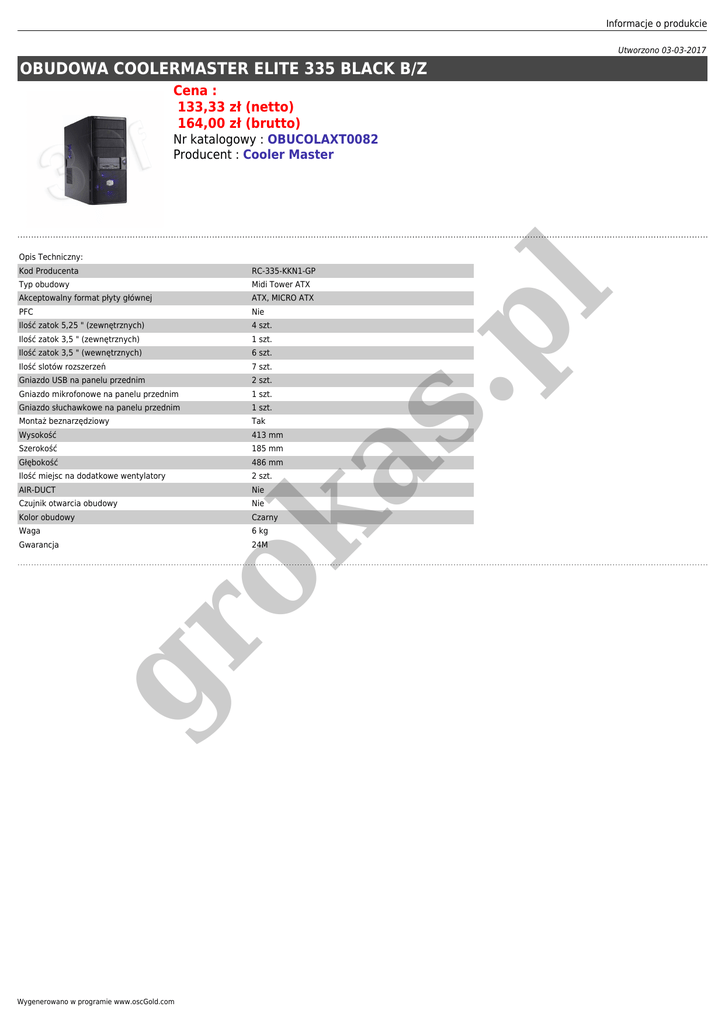 Informacje o produkcie Utworzono 03-03-2017 OBUDOWA COOLERMASTER ELITE 335 BLACK B/Z Cena : 133,33 zł (netto) 164,00 zł (brutto) Nr katalogowy : OBUCOLAXT0082 Producent : Cooler Master RC-335-KKN1-GP Typ obudowy Midi Tower ATX Akceptowalny format płyty głównej ATX, MICRO ATX PFC Nie Ilość zatok 5,25 " (zewnętrznych) 4 szt. Ilość zatok 3,5 " (zewnętrznych) 1 szt. Ilość zatok 3,5 " (wewnętrznych) 6 szt. Ilość slotów rozszerzeń 7 szt. Gniazdo USB na panelu przednim 2 szt. Gniazdo mikrofonowe na panelu przednim 1 szt. Gniazdo słuchawkowe na panelu przednim 1 szt. Montaż beznarzędziowy Tak Wysokość 413 mm Szerokość 185 mm Głębokość 486 mm Ilość miejsc na dodatkowe wentylatory 2 szt. AIR-DUCT Nie Czujnik otwarcia obudowy Nie Kolor obudowy Czarny ok Waga as Kod Producenta 6 kg 24M gr Gwarancja Wygenerowano w programie www.oscGold.com .p l Opis Techniczny: