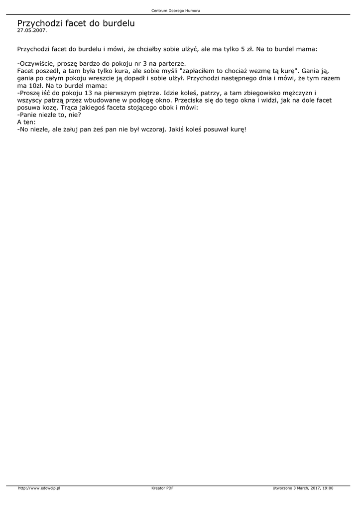 Centrum Dobrego Humoru Przychodzi facet do burdelu 27.05.2007. Przychodzi facet do burdelu i mówi, że chciałby sobie ulżyć, ale ma tylko 5 zł. Na to burdel mama: -Oczywiście, proszę bardzo do pokoju nr 3 na parterze. Facet poszedł, a tam była tylko kura, ale sobie myśli "zapłaciłem to chociaż wezmę tą kurę". Gania ją, gania po całym pokoju wreszcie ją dopadł i sobie ulżył. Przychodzi następnego dnia i mówi, że tym razem ma 10zł. Na to burdel mama: -Proszę iść do pokoju 13 na pierwszym piętrze. Idzie koleś, patrzy, a tam zbiegowisko mężczyzn i wszyscy patrzą przez wbudowane w podłogę okno. Przeciska się do tego okna i widzi, jak na dole facet posuwa kozę. Trąca jakiegoś faceta stojącego obok i mówi: -Panie niezłe to, nie? A ten: -No niezłe, ale żałuj pan żeś pan nie był wczoraj. Jakiś koleś posuwał kurę! http://www.edowcip.pl Kreator PDF Utworzono 3 March, 2017, 19:00