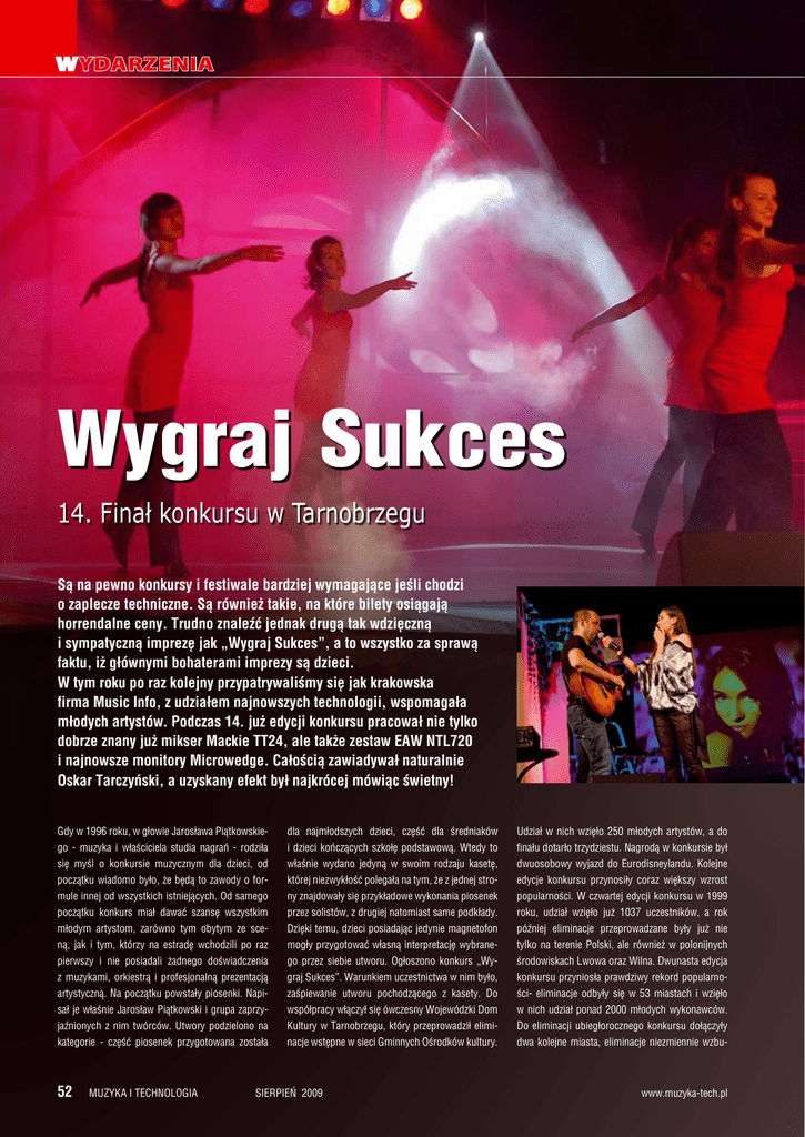 Wydarzenia Wygraj Sukces 14. Finał konkursu w Tarnobrzegu Są na pewno konkursy i festiwale bardziej wymagające jeśli chodzi o zaplecze techniczne. Są również takie, na które bilety osiągają horrendalne ceny. Trudno znaleźć jednak drugą tak wdzięczną i sympatyczną imprezę jak „Wygraj Sukces”, a to wszystko za sprawą faktu, iż głównymi bohaterami imprezy są dzieci. W tym roku po raz kolejny przypatrywaliśmy się jak krakowska firma Music Info, z udziałem najnowszych technologii, wspomagała młodych artystów. Podczas 14. już edycji konkursu pracował nie tylko dobrze znany już mikser Mackie TT24, ale także zestaw EAW NTL720 i najnowsze monitory Microwedge. Całością zawiadywał naturalnie Oskar Tarczyński, a uzyskany efekt był najkrócej mówiąc świetny! Gdy w 1996 roku, w głowie Jarosława Piątkowskie- dla najmłodszych dzieci, część dla średniaków Udział w nich wzięło 250 młodych artystów, a do go - muzyka i właściciela studia nagrań - rodziła i dzieci kończących szkołę podstawową. Wtedy to finału dotarło trzydziestu. Nagrodą w konkursie był się myśl o konkursie muzycznym dla dzieci, od właśnie wydano jedyną w swoim rodzaju kasetę, dwuosobowy wyjazd do Eurodisneylandu. Kolejne początku wiadomo było, że będą to zawody o for- której niezwykłość polegała na tym, że z jednej stro- edycje konkursu przynosiły coraz większy wzrost mule innej od wszystkich istniejących. Od samego ny znajdowały się przykładowe wykonania piosenek popularności. W czwartej edycji konkursu w 1999 początku konkurs miał dawać szansę wszystkim przez solistów, z drugiej natomiast same podkłady. roku, udział wzięło już 1037 uczestników, a rok młodym artystom, zarówno tym obytym ze sce- Dzięki temu, dzieci posiadając jedynie magnetofon później eliminacje przeprowadzane były już nie ną, jak i tym, którzy na estradę wchodzili po raz mogły przygotować własną interpretację wybrane- tylko na terenie Polski, ale również w polonijnych pierwszy i nie posiadali żadnego doświadczenia go przez siebie utworu. Ogłoszono konkurs „Wy- środowiskach Lwowa oraz Wilna. Dwunasta edycja z muzykami, orkiestrą i profesjonalną prezentacją graj Sukces”. Warunkiem uczestnictwa w nim było, konkursu przyniosła prawdziwy rekord popularno- artystyczną. Na początku powstały piosenki. Napi- zaśpiewanie utworu pochodzącego z kasety. Do ści- eliminacje odbyły się w 53 miastach i wzięło sał je właśnie Jarosław Piątkowski i grupa zaprzy- współpracy włączył się ówczesny Wojewódzki Dom w nich udział ponad 2000 młodych wykonawców. jaźnionych z nim twórców. Utwory podzielono na Kultury w Tarnobrzegu, który przeprowadził elimi- Do eliminacji ubiegłorocznego konkursu dołączyły kategorie - część piosenek przygotowana została nacje wstępne w sieci Gminnych Ośrodków kultury. dwa kolejne miasta, eliminacje niezmiennie wzbu- 52 muzyka i technologia sierpień 2009 www.muzyka-tech.pl Wygraj Sukces z Jarkiem Piątkowskim, po drugie, ponieważ pojawiła się propozycja użycia cyfrowej konsolety, na potrzeby realizacji dźwięku na koncercie. Przesłuchanie ok. 120 osób i nagłośnienie ponad setki w finale konkursu pracując na stole analogowym jest zadaniem delikatnie mówiąc bardzo trudnym do zrealizowania. Tutaj w sukurs przyszła zatem cyfrowa konsoleta Mackie TT24, która znacznie ułatwiła pracę. Rok później cała realizacja została rozszerzona również o użycie systemu EAW KF730, w tym roku natomiast na imprezie zadebiutował zestaw NTL720 z dołami SB730. Na potrzeby imprezy stworzone zostały w zasadzie dwie konfiguracje całego systemu… To prawda, ze względu na dwa miejsca gdzie odbywały się prezentacje młodych artystów musiały powstać dwa różne zestawy. W Tarnobrzeskim Domu Kultury, gdzie miejsce miały przesłuchania konkursowe zastosowaliśmy jeden subbas SB730 i cztery górki NTL720 (zestackowane) na stronę. W hali widowiskowo-sportowej natomiast, gdzie odbył się ścisły finał całej imprezy, stanęły dwa subbasy SB730 i sześć elementów NTL720 na stronę. Dodatkowo w torach monitorowych pracowały tutaj konstrukcje EAW Microwedge. W Domu Kultury graliśmy w granicach 15 metrów do przodu, w hali widowiskowo-sportowej było to ok. 25 metrów - nie graliśmy na długość hali, tylko na szerokość. Pozwoliło nam to wyeliminować R E K L dziły ogromne zainteresowanie, bezpośrednio dosyć dużo odbić i sam system dzięki temu, że gra przekładające się na 2200 młodych wokalistów. W samym finale było ich 111, jury przyznało oprócz bardzo szeroko, sprawdził się świetnie w tej aplika- M cji. Całość skonfigurowana była w taki sposób, aby A nagrody w postaci wycieczki do Eurodisneylandu, zestaw grał na naprawdę bardzo dużą szerokość również 12 innych nagród, którymi były instrumen- (szerokość hali wynosiła 60 metrów). W całym ty muzyczne i sprzęt RTV. Po raz drugi również tym systemie zainstalowanym w hali obyło się bez przyznana została nagroda specjalna Polsko-Nie- frontfilla. Natomiast w Tarnobrzeskim Domu Kul- mieckiego Towarzystwa Folklorystycznego Polo- tury obok dwóch głównych słupków zastosowali- nia z Monachium. Emocji zatem z pewnością nie śmy na środku sceny dwie sztuki NTL720 pracują- zabrakło. Najlepszym podsumowaniem konkursu ce właśnie jako wypełnienie bliskiego pola. Biorąc może być stwierdzenie, że dzieci, które brały udział pod uwagę fakt, iż cała impreza była nagrywana w pierwszej edycji konkursu, mają już swoje dzieci, przez TVP INFO, kolumny zlokalizowane zostały a całe wydarzenie cieszy się rosnącą z roku na rok mniej więcej na osi głębokości sceny, wokaliści popularnością. natomiast występowali przed kolumnami - często A nawet w odległości 10 metrów przed nimi. O systemie nagłośnieniowym zainstalowanym na potrzeby Jak udało się osiągnąć dźwięk bez sprzę