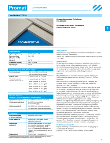 Dane techniczne Płyty PROMATECT®-H Europejska Aprobata Techniczna: ETA-06/0206 Deklaracja Właściwości Użytkowych 0749-CPR 06/0206 -2013-1 Dane techniczne Gęstość objętościowa ρ Ok. 870 kg/m3 ± 15% Zawartość wilgoci (stan pow. – suchy) Ok. 5-10% Odczyn pH Ok. 12 Przewodność cieplna λ Ok. 0,175 W/mK Opór dyfuzyjny μ Ok. 20 Formaty i ciężar (+20 °C, 65% w.w.p.) Szerokość x długość (1) 1250 mm x 2500 mm (± 3,0 mm) 1250 mm x 3000 mm (± 3,0 mm) Grubość, ciężar 6 mm ± 0,5 mm*, ok. 5,6 kg/m2 * W sprzedaży dostępne tylko o wymiarach 1250 mm x 2500 mm 8 mm ± 0,5 mm*, ok. 7,4 kg/m2 10 mm ± 0,5 mm, ok. 9,2 kg/m2 12 mm ± 0,5 mm, ok. 11,1 kg/m2 15 mm ± 1,0 mm, ok. 13,9 kg/m2 20 mm ± 1,0 mm, ok. 18,5 kg/m2 25 mm ± 1,5 mm, ok. 23,1 kg/m2 Wartości statyczne (ugięcie f Ł l/250, współczynnik bezpieczeństwa ν ł 3) Wytrzymałość na zginanie ς Ok. 4,5 N/mm2 (w kierunku podłużnym) Wytrzymałość na ściskanie Ok. 9,3 N/mm2 (prostopadle do powierzchni płyty) Moduł sprężystości E Ok. 4200 N/mm2 (w kierunku podłużnym) Ok. 2900 N/mm2 (w kierunku poprzecznym) Właściwości Klasyfikacja ogniowa w zakresie niepalności A1 (wg EN 13501-1:2002) Wygląd zewnętrzny Powierzchnie licowe gładkie, matowe o jednolitym zabarwieniu Postępowanie z odpadami Resztki produktu traktować jak gruz budowlany; może być składowany na wysypisku komunalnym; kod identyfikacji odpadu 17 01 03 (Odpady innych materiałów ceramicznych i elementów wyposażenia, zgodnie z EWCode) Magazynowanie Przechowywać w miejscu suchym 3 Opis produktu Ogniochronne płyty silikatowo-cementowe, niewrażliwe na wilgoć, wielkoformatowe, samonośne. Jakość płyt zapewniona jest przez system kontroli jakości zgodnie z ISO 9001. Zastosowanie Płyty przeznaczone są do stosowania w budownictwie ogólnym i przemysłowym, do wykonywania ogniochronnych okładzin elementów budowlanych (ściany, stropy, belki, słupy), jak również do konstrukcji samodzielnych elementów o deklarowanej klasie odporności ogniowej (ściany, sufity, klapy rewizyjne). Obróbka Płyty PROMATECT®-H można obrabiać ogólnie dostępnymi narzędziami do obróbki drewna; można je przycinać, wiercić i frezować. Przy obróbce płyt powstaje pył. Może być on szkodliwy dla zdrowia. Należy unikać kontaktu z oczami oraz skórą. Nie wdychać. Pył należy odciągać. Można stosować tynki dekoracyjne na bazie hydraulicznie związanej zaprawy lub dyspersji tworzyw sztucznych. W zależności od wymagań można stosować różne systemy malowania, np.: farbami dyspersyjnymi, lakierami z żywic syntetycznych, lakierami poliuretanowymi, pokrycie płynnym tworzywem sztucznym np.: z żywicy epoksydowej lub pochodnej PVC. Przed ostatecznym wykonaniem prac zaleca się przeprowadzić próbę. Promat®-Imprägnierung 2000 służy do skutecznej impregnacji płyt przed bezpośrednim działaniem wód opadowych oraz wysoką wilgotnością otoczenia. Promat®-SR-lmprägnierung stanowi skuteczną ochronę przed agresywnymi mediami. Dyfuzja pary wodnej po użyciu obu impregnatów jest zachowana. Jednocześnie Promat®-Imprägnierung 2000 wzmacnia podłoże przez działanie wgłębne oraz chroni przed ścieraniem. Możliwe jest klejenie płytek ceramicznych, mozaiki oraz cienkich płytek klinkierowych. Mogą być również zastosowane hydraulicznie związana zaprawa, klej dyspersyjny i epoksydowy klej żywiczny. Przy dodatkowym użyciu kotew ze stali szlachetnej możliwe jest mocowanie okładzin z kamieni naturalnych. Dodatkowe wskazówki Więcej informacji oraz dodatkowe wskazówki znajdują się na wcześniejszych stronach. Klejenie – zobacz dane techniczne kleju Promat®-K84. Do określenia ciężaru konstrukcji należy posłużyć się wartościami z powyższej tabeli jako wartości minimalne. Możliwe jest zamówienie płyt o innych grubościach oraz wymiarach – cena na zapytanie. (1) 17