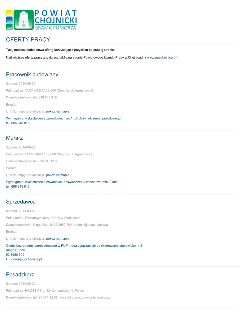 OFERTY PRACY Tutaj możesz dodać nową ofertę korzystając z przycisku po prawej stronie. Najświeższe oferty pracy znajdziesz także na stronie Powiatowego Urzędu Pracy w Chojnicach ( www.pupchojnice.pl) Pracownik budowlany dodane: 2014-09-22 Pełny adres: "KAMIONKA" 89-600 Chojnice ul. Agrestowa 6 Dane kontaktowe: tel. 696 848 816 Branża: Link do mapy z lokalizacją: pokaż na mapie Wymagania: wykształcenie zawodowe, min. 1 rok doświadczenia zawodowego. tel. 696 848 816 Murarz dodane: 2014-09-22 Pełny adres: "KAMIONKA" 89-600 Chojnice ul. Agrestowa 6 Dane kontaktowe: tel. 696 848 816 Branża: Link do mapy z lokalizacją: pokaż na mapie Wymagania: wykształcenie zawodowe, doświadczenie zawodowe min. 2 lata. tel. 696 848 816 Sprzedawca dodane: 2014-09-22 Pełny adres: Powiatowy Urząd Pracy w Chojnicach Dane kontaktowe: Kinga Rudnik 52 3950 704 [email protected] Branża: Link do mapy z lokalizacją: pokaż na mapie Osoby bezrobotne, zarejestrowane w PUP mogą zgłaszać się po skierowanie stanowisko nr 2 Kinga Rudnik 52 3950 704 [email protected] Posadzkarz dodane: 2014-09-22 Pełny adres: PROST PB ul. M. Konopnickiej 4, Police Dane kontaktowe: tel. 91 431 62 05 I kontakt z pracodawcą telefoniczny. Branża: Link do mapy z lokalizacją: pokaż na mapie wymagania: wykształcenie średnie, uprawnienia budowlane, mile widziane doświadczenie, mile widziana znajomość języków obcych. Praca w miejscowości Police (województwo zachodniopomorskie)od 8.00 do 16.00. Praca polega na instalacji posadzek żywicznych. tel. 91 431 62 05 I kontakt z pracodawcą telefoniczny. Brukarz dodane: 2014-09-19 Pełny adres: Usługi drogowo-budowlane Gryga Zbigniew Kurcze 30, 89-650 Czersk Dane kontaktowe: tel. 602 893 817 Branża: Link do mapy z lokalizacją: pokaż na mapie Prace brukarskie tel. 602 893 817 Cukiernik dodane: 2014-09-19 Pełny adres: Cukiernia Górski Bogumił Człuchów, Wojska Polskiego 18b Dane kontaktowe: tel. 601 193 120 pierwszy kontakt telefoniczny Branża: Link do mapy z lokalizacją: pokaż na mapie wykształcenie zawodowe kierunkowe, staż pracy do. 5 lat, aktualna książeczka zdrowia. świadectwo pracy od ostatniego pracodawcy tel. 601 193 120 pierwszy kontakt telefoniczny Technolog/ konstruktor dodane: 2014-09-19 Pełny adres: PARTNER Systems Sp. z o. o. Człuchów, Jerzego z Dąbrowy 5d Dane kontaktowe: tel. 604 491 883 Zabrowarna Szulc Marta pierwszy kontakt telefoniczny Branża: Technolog/ konstruktor Link do mapy z lokalizacją: pokaż na mapie wykształcenie wyższe techniczne, znajomość rysunku technicznego, bardzo dobra znajomość AutoCad, Inventor, umiejętność tworzenia dokumentacji technicznej, komunikatywność, umiejętność pracy w zespole tel. 604 491 883 Zabrowarna Szulc Marta pierwszy kontakt telefoniczny Pracownik budowlany dodane: 2014-09-19 Pełny adres: "CZERNIHÓWKA" Karsin, Miedzno 16 Dane kontaktowe: tel. 604 520 992 Branża: Link do mapy z lokalizacją: pokaż na mapie Wymagania: wykształcenie zawodowe ogólnobudowlane. tel. 604 520 992 KOSZTORYSANT BUDOWLANY dodane: 2014-09-19 Pełny adres: PPHU KARMAN Sp. z o.o. ul. Powstañców 14, 41-204 Sosnowiec Dane kontaktowe: tel. 32 266 43 60 Branża: Link do mapy z lokalizacją: pokaż na mapie Wymagania: wykształcenie średnie, mile widziane doświadczenie zawodowe, organizacja, prawo jazdy kat. B, biegła znajomość języka niemieckiego tel. 32 266 43 60 Mechanik pojazdów ciężarowych i osobowych dodane: 2014-09-18 Pełny adres: Centrum Obsługi Samochodowej Błażej Myśliwiec Dane kontaktowe: tel. 693114603 Branża: Link do mapy z lokalizacją: pokaż na mapie Wymagania: Mile widziane doświadczenie zawodowe oraz prawo jazdy tel. 693114603 Pomocnik mechanika dodane: 2014-09-18 Pełny adres: AUTO-NAPRAWA Krzysztof Górnowicz Dane kontaktowe: tel. 604173952 Branża: Link do mapy z lokalizacją: pokaż na mapie Wymagania: Pracodawca poszukuje kandydata na stanowisko mechanika tel. 604173952 Tokarz dodane: 2014-09-18 Pełny adres: "REGALUX" Topole 40 Dane kontaktowe: I kontakt telefoniczny tel. 52 3950246 lub mailowy [email protected] Branża: Link do mapy z lokalizacją: pokaż na mapie wymagania: wykształcenie minimum zawodowe, doswiadczenie w pracy na obrabiarkach CNC, znajomość rysunku technicznego, umiejętność posługiwania się przyrządami pomiarowymi. I kontakt telefoniczny tel. 52 3950246 lub mailowy [email protected] Pomocnik stolarza dodane: 2014-09-17 Pełny adres: PPH "SPAR-MEBLE" Pawłówko, Bydgoska 5 Dane kontaktowe: tel. 52 39 71188 Branża: Link do mapy z lokalizacją: pokaż na mapie Wymagania: wykształcenie zawodowe lub śrenie, mile widziane doświadczenie zawodowe, orzeczenie o stopniu niepełnosprawności, umiejętność pracy w zespole, bezkonfliktowość. tel. 52 39 71188 Rolnik dodane: 2014-09-17 Pełny adres: GOSPODARSTWO ROLNE Jan Brzeziñski Łubna 36, 89-650 Czersk Dane kontaktowe: kontakt z pracodawcą: telefoniczny lub osobisty tel. 516 784 772 Branża: Link do mapy z lokalizacją: pokaż na mapie Wymagania: mile widziane prawo jazdy kat. B, T kontakt z pracodawcą: telefoniczny lub osobisty tel. 516 784 772 Technik prac biurowych- umowa stażowa dodane: 2014-09-17 Pełny adres: Powiatowy Urząd Pracy w Chojnicach Dane kontaktowe: Osoby zainteresowane proszone są o bezpośredni kontakt z Referatem Pośrednictwa Pracy- hol- stanowisko nr 4 Branża: Link do mapy z lokalizacją: pokaż na mapie osoby zarejestrowane jako bezrobotne z wykształceniem wyższym Osoby zainteresowane proszone są o bezpośredni kontakt z Referatem Pośrednictwa Pracy- holstanowisko nr 4