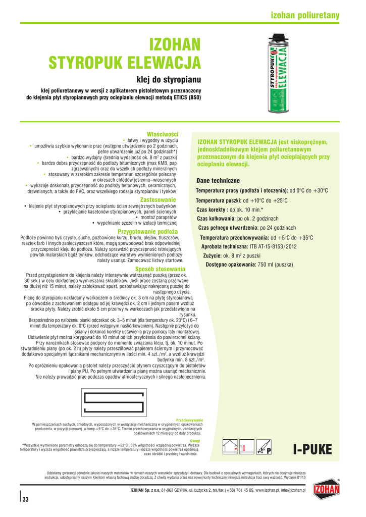 izohan poliuretany IZOHAN styropuk elewacja klej do styropianu klej poliuretanowy w wersji z aplikatorem pistoletowym przeznaczony do klejenia płyt styropianowych przy ocieplaniu elewacji metodą ETICS (BS0) Właściwości • łatwy i wygodny w użyciu • umożliwia szybkie wykonanie prac (wstępne utwardzenie po 2 godzinach, pełne utwardzenie już po 24 godzinach*) • bardzo wydajny (średnia wydajność ok. 8 m2 z puszki) • bardzo dobra przyczepność do podłoży bitumicznych (mas KMB, pap zgrzewalnych) oraz do wszelkich podłoży mineralnych • stosowany w szerokim zakresie temperatur, szczególnie polecany w okresach chłodów jesienno–wiosennych • wykazuje doskonałą przyczepność do podłoży betonowych, ceramicznych, drewnianych, a także do PVC, oraz wszelkiego rodzaju styropianów i tynków Zastosowanie • klejenie płyt styropianowych przy ocieplaniu ścian zewnętrznych budynków • przyklejanie kasetonów styropianowych, paneli ściennych • montaż parapetów • wypełnianie szczelin w izolacji termicznej Przygotowanie podłoża IZOHAN styropuk elewacja jest niskoprężnym, jednoskładnikowym klejem poliuretanowym przeznaczonym do klejenia płyt ocieplających przy ocieplaniu elewacji. Dane techniczne Temperatura pracy (podłoża i otoczenia): od 0°C do +30°C Temperatura puszki: od +10°C do +25°C Czas korekty : do ok. 10 min.* Czas kołkowania: po ok. 2 godzinach Czas pełnego utwardzenia: po 24 godzinach Podłoże powinno być czyste, suche, pozbawione kurzu, brudu, olejów, tłuszczów, resztek farb i innych zanieczyszczeń które, mogą spowodować brak odpowiedniej przyczepności kleju do podłoża. Należy sprawdzić przyczepność istniejących powłok malarskich bądź tynków, odchodzące warstwy wymienionych podłoży należy usunąć. Zamocować listwy startowe. Temperatura przechowywania: od +5°C do +35°C Aprobata techniczna: ITB AT-15-8153 / 2012 Sposób stosowania Zużycie: ok. 8 m2 z puszki Dostępne opakowania: 750 ml (puszka) Przed przystąpieniem do klejenia należy intensywnie wstrząsnąć puszką (przez ok. 30 sek.) w celu dokładnego wymieszania składników. Jeśli prace zostaną przerwane na dłużej niż 15 minut, należy zablokować spust, pozostawiając nakręconą puszkę do następnego użycia. Pianę do styropianu nakładamy warkoczem o średnicy ok. 3 cm na płytę styropianową po obwodzie z zachowaniem odstępu od jej krawędzi ok. 2 cm i jednym pasem wzdłuż środka płyty. Należy zrobić około 5 cm przerwy w warkoczach jak przedstawiono na rysunku. Bezpośrednio po nałożeniu pianki odczekać ok. 3–5 minut (dla temperatury ok. 23°C) i 6–7 minut dla temperatury ok. 0°C (przed wstępnym naskórkowaniem). Następnie przyłożyć do ściany i dokonać korekty ustawienia przy pomocy łaty montażowej. Ustawienie płyt można korygować do 10 minut od ich przyłożenia do powierzchni ściany. Przy narożnikach stosować podpory do momentu związania kleju, tj. ok. 10 minut. Po stwardnieniu piany (po ok. 2 h) płyty należy przeszlifować papierem ściernym i przymocować dodatkowo specjalnymi łącznikami mechanicznymi w ilości min. 4 szt. / m2, a wzdłuż krawędzi budynku min. 8 szt. / m2. Po opróżnieniu opakowania pistolet należy przeczyścić płynem czyszczącym do pistoletów i piany PU. Po pełnym utwardzeniu pianę można usunąć mechanicznie. Nie należy prowadzić prac podczas opadów atmosferycznych i silnego nasłonecznienia. Przechowywanie W pomieszczeniach suchych, chłodnych, wyposażonych w wentylację mechaniczną w oryginalnych opakowaniach producenta, w pozycji pionowej w temp.+5°C do +35°C. Termin przechowywania w oryginalnych, zamkniętych opakowaniach 12 miesięcy od daty produkcji. Uwagi *Wszystkie wymienione parametry odnoszą się do temperatury +23°C i 55% wilgotności względnej powietrza. Wyższe temperatury i wyższa wilgotność powietrza przyspieszają, a niższe temperatury i niższa wilgotność powietrza opóźniają czas obróbki i przebieg twardnienia. I-PUKE Udzielamy gwarancji odnośnie jakości naszych materiałów w ramach naszych warunków sprzedaży i dostawy. Dla budowli o specjalnych wymaganiach, których nie obejmuje niniejsza instrukcja, udostępniamy naszym Klientom własną fachową służbę doradczą. Z chwilą wydania przez nas nowej karty technicznej niniejsza instrukcja traci swą ważność. Wydanie 01/13 IZOHAN Sp. z o.o. 81-963 GDYNIA, ul. Łużycka 2, tel./fax (+58) 781 45 85, www.izohan.pl, [email protected] 33