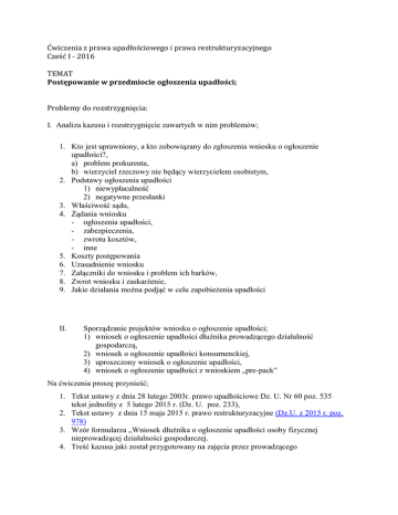 Ćwiczenia z prawa upadłościowego i prawa restrukturyzacyjnego Cześć I - 2016 TEMAT Postępowanie w przedmiocie ogłoszenia upadłości; Problemy do rozstrzygnięcia: I. Analiza kazusu i rozstrzygnięcie zawartych w nim problemów; 1. Kto jest uprawniony, a kto zobowiązany do zgłoszenia wniosku o ogłoszenie upadłości?, a) problem prokurenta, b) wierzyciel rzeczowy nie będący wierzycielem osobistym, 2. Podstawy ogłoszenia upadłości 1) niewypłacalność 2) negatywne przesłanki 3. Właściwość sądu, 4. Żądania wniosku - ogłoszenia upadłości, - zabezpieczenia, - zwrotu kosztów, - inne 5. Koszty postępowania 6. Uzasadnienie wniosku 7. Załączniki do wniosku i problem ich barków, 8. Zwrot wniosku i zaskarżenie, 9. Jakie działania można podjąć w celu zapobieżenia upadłości II. Sporządzanie projektów wniosku o ogłoszenie upadłości; 1) wniosek o ogłoszenie upadłości dłużnika prowadzącego działalność gospodarczą, 2) wniosek o ogłoszenie upadłości konsumenckiej, 3) uproszczony wniosek o ogłoszenie upadłości, 4) wniosek o ogłoszenie upadłości z wnioskiem „pre-pack” Na ćwiczenia proszę przynieść; 1. Tekst ustawy z dnia 28 lutego 2003r. prawo upadłościowe Dz. U. Nr 60 poz. 535 tekst jednolity z 5 lutego 2015 r. (Dz. U. poz. 233), 2. Tekst ustawy z dnia 15 maja 2015 r. prawo restrukturyzacyjne (Dz.U. z 2015 r. poz. 978) 3. Wzór formularza „Wniosek dłużnika o ogłoszenie upadłości osoby fizycznej nieprowadzącej działalności gospodarczej. 4. Treść kazusa jaki został przygotowany na zajęcia przez prowadzącego Kazus na ćw. TEMAT; Wniosek o ogłoszenie upadłości; Postępowanie w przedmiocie ogłoszenia upadłości Spółka Polskie Składy Glazury Sp. z o.o. z siedzibą w Krakowie zwana dalej „Spółka” w celu zabezpieczenia umowy pożyczki udzielonej przez Marka Kwaka w dniu 2 sierpnia 2015r. w kwocie 200.000 zł , a której termin zwrotu wraz z odsetkami ustalono na 2 lutego 2017r. spółce zależnej Skład Glazurniczy Sp. z o.o. z siedzibą w Bytomiu ustanowiła hipotekę umowną na kwotę 250.000 zł tytułem zabezpieczenia na stanowiącej jej własność nieruchomości położonej w Bytomiu przy ul. Strzelców Bytomski 12 stanowiącej niezabudowaną działkę gruntu oznaczoną geodezyjnie nr 101/11 wpisanej do KW SR w Bytomiu pod nr KW K1B/000001234/8. Spółka Polskie Składy Glazury Sp. z o.o. od 2006 roku prowadzi działalność gospodarczą produkując w zakładzie w Katowicach przy ulicy Porcelanowej 6 porcelanowe wyroby łazienkowe tj. muszle, umywalki, brodziki i sprzedawała je głównie na rynku krajowym. Od połowy 2014 produkcja sedesów stała się nierentowna w związku importem z Chin. W związku z powyższym stale narastała strata wynikająca z wyższych kosztów produkcji nad przychodami ze sprzedaży, a sprawozdania finansowe za rok 2014 i rok 2015 wykazują nadwyżkę zobowiązań nad aktywami. Aby zabezpieczyć bieżące funkcjonowanie wspólnicy Spółki Jan Ćwiek i Marek Mucha w 15 stycznia 2016r. zawarli ze Spółką umowy pożyczki i pożyczyli po 500.000 zł złotych , każdy z nich. W dniu 12 czerwca 2016 Bank Ochrony Środowiska S.A. wypowiedział Spółce kredyt i zażądał natychmiastowej spłaty kwoty 2.000.000 zł wraz z odsetkami 23 % w skali roku do dnia spłaty, a w dniu 25 czerwca 2016 Bank dokonał zajęcia rachunku bankowego Spółki w Banku Ochrony Środowiska S.A. na podstawie bankowego tytułu egzekucyjnego. Zarząd Spółki Polskie Składy Glazury Sp. z o.o. w osobach Jana Ćwieka i Marka Muchy w dniu 30 czerwca 2016 na Nadzwyczajnym Zgromadzeniu Wspólników Spółki Polskie Składy Glazury Sp. z o.o. złożył rezygnację ustanawiając wcześniej tj. 14 czerwca 2016 r. prokurenta samoistnego Jana Kurka. Na Nadzwyczajnym Zgromadzeniu Wspólników w dniu 30 czerwca 2016r. nie wybrano zarządu i ogłoszono przerwę w zgromadzeniu do 30 lipca 2016r. W dniu 1 lipca 2016r. Marek Kwak złożył wniosek o ogłoszenie upadłości. W dniu 8 lipca 2016r stan aktywów i pasywów Spółki Polskie Składy Glazury Sp. z o.o. wygląda następująco. Majątek Spółki Polskie Składy Glazury Sp. z o.o. z siedzibą w Krakowie stanowią ; 1) Nieruchomość wpisana do KW SR w Katowicach pod nr KW K1K/000002222/82 położona w Katowicach przy ul. Porcelanowej 6 zabudowana halą produkcyjną i halą magazynową, wraz z linią produkcyjną porcelanowej armatury łazienkowej o łącznej wartości szacunkowej 3.000.000,- zł 2) nieruchomości położona w Bytomiu przy ul. Strzelców Bytomski 12 wpisana do KW SR w Bytomiu pod nr KW K1B/000001234/8 o wartości szacunkowej 300.000,- zł , 3) 50 udziałów o wartości nominalnej 1000,- zł , każdy w Spółce działającej pod firmą Skład Glazurniczy sp. z o.o. , które stanowią 100 % kapitału zakładowego, 4) zapasy magazynowe - wyroby glazurnicze tj. płytki znajdujące się na składzie w Bytomiu prowadzonym przez Skład Glazurniczy sp. z o.o. z siedzibą w Bytomiu o wartości według kosztów zakupu 50.000,zł 5) samochód dostawczy Fiat Dukato rocznik 2009 o wartości księgowej – 0 zł w związku z jego zamortyzowaniem, 6) dwa komputery Mac PRO o wartości szacunkowej 5000, zł, 7) ruchomości w postaci mebli biurowych o łącznej wartości szacunkowej – 5000,- zł, 8) Wierzytelność pieniężna w stosunku do dłużnika Skład Glazurniczy sp. z o.o. na kwotę należności głównych 300.000 zł. z tytułu pożyczki udzielonej w dniu 1 stycznia 2016r. z terminem spłaty na 1 stycznia 2017r. 9) Środki pieniężne w kasie 5.000 zł, 10) Środki pieniężne na rachunku bieżącym w PKO BP S.A. 22.000,- zł Zobowiązania wobec 1. Dostawców surowców na łączną kwotę 2.556.000,- zł z czego przeterminowane powyżej 3 miesięcy nie występują 2. Banku Ochrony Środowiska S.A. z tytułu postawionego w stan natychmiastowej wymagalności kredytu w kwocie należności głównej 2.000.000 zł i odsetek liczonych od dnia 3 czerwca 2016r. ,