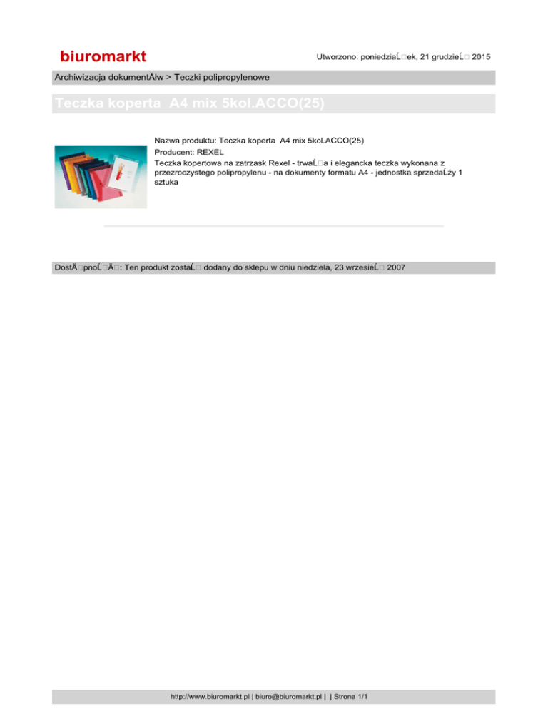 biuromarkt Utworzono: poniedziaĹ ek, 21 grudzieĹ Archiwizacja dokumentĂłw > Teczki polipropylenowe Teczka koperta A4 mix 5kol.ACCO(25) Nazwa produktu: Teczka koperta A4 mix 5kol.ACCO(25) Producent: REXEL Teczka kopertowa na zatrzask Rexel - trwaĹ a i elegancka teczka wykonana z przezroczystego polipropylenu - na dokumenty formatu A4 - jednostka sprzedaĹźy 1 sztuka DostÄ pnoĹ Ä : Ten produkt zostaĹ dodany do sklepu w dniu niedziela, 23 wrzesieĹ http://www.biuromarkt.pl | [email protected] | | Strona 1/1 2007 2015