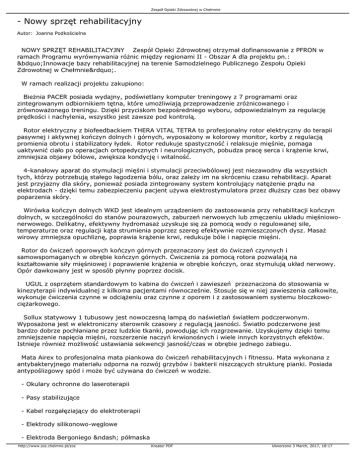 Zespół Opieki Zdrowotnej w Chełmnie - Nowy sprzęt rehabilitacyjny Autor: Joanna Podkościelna NOWY SPRZĘT REHABILITACYJNY Zespół Opieki Zdrowotnej otrzymał dofinansowanie z PFRON w ramach Programu wyrównywania różnic między regionami II - Obszar A dla projektu pn.: „Innowacje bazy rehabilitacyjnej na terenie Samodzielnego Publicznego Zespołu Opieki Zdrowotnej w Chełmnie”. W ramach realizacji projektu zakupiono: Bieżnia PACER posiada wydajny, podświetlany komputer treningowy z 7 programami oraz zintegrowanym odbiornikiem tętna, które umożliwiają przeprowadzenie zróżnicowanego i zrównoważonego treningu. Dzięki przyciskom bezpośredniego wyboru, odpowiedzialnym za regulację prędkości i nachylenia, wszystko jest zawsze pod kontrolą. Rotor elektryczny z biofeedbackiem THERA VITAL TETRA to profesjonalny rotor elektryczny do terapii pasywnej i aktywnej kończyn dolnych i górnych, wyposażony w kolorowy monitor, korby z regulacją promienia obrotu i stabilizatory łydek. Rotor redukuje spastyczność i relaksuje mięśnie, pomaga uaktywnić ciało po operacjach ortopedycznych i neurologicznych, pobudza pracę serca i krążenie krwi, zmniejsza objawy bólowe, zwiększa kondycję i witalność. 4-kanałowy aparat do stymulacji mięśni i stymulacji przeciwbólowej jest niezawodny dla wszystkich tych, którzy potrzebują stałego łagodzenia bólu, oraz zależy im na skróceniu czasu rehabilitacji. Aparat jest przyjazny dla skóry, ponieważ posiada zintegrowany system kontrolujący natężenie prądu na elektrodach - dzięki temu zabezpieczeniu pacjent używa elektrostymulatora przez dłuższy czas bez obawy poparzenia skóry. Wirówka kończyn dolnych WKD jest idealnym urządzeniem do zastosowania przy rehabilitacji kończyn dolnych, w szczególności do stanów pourazowych, zaburzeń nerwowych lub zmęczeniu układu mięśniowonerwowego. Delikatny, efektywny hydromasaż uzyskuje się za pomocą wody o regulowanej sile, temperaturze oraz regulacji kąta strumienia poprzez szereg efektywnie rozmieszczonych dysz. Masaż wirowy zmniejsza opuchliznę, poprawia krążenie krwi, redukuje bóle i napięcie mięśni. Rotor do ćwiczeń oporowych kończyn górnych przeznaczony jest do ćwiczeń czynnych i samowspomaganych w obrębie kończyn górnych. Ćwiczenia za pomocą rotora pozwalają na kształtowanie siły mięśniowej i poprawienie krążenia w obrębie kończyn, oraz stymulują układ nerwowy. Opór dawkowany jest w sposób płynny poprzez docisk. UGUL z osprzętem standardowym to kabina do ćwiczeń i zawieszeń przeznaczona do stosowania w kinezyterapii indywidualnej z kilkoma pacjentami równocześnie. Stosuje się w niej zawieszenia całkowite, wykonuje ćwiczenia czynne w odciążeniu oraz czynne z oporem i z zastosowaniem systemu bloczkowociężarkowego. Sollux statywowy 1 tubusowy jest nowoczesną lampą do naświetlań światłem podczerwonym. Wyposażona jest w elektroniczny sterownik czasowy z regulacją jasności. Światło podczerwone jest bardzo dobrze pochłaniane przez ludzkie tkanki, powodując ich rozgrzewanie. Uzyskujemy dzięki temu zmniejszenie napięcia mięśni, rozszerzenie naczyń krwionośnych i wiele innych korzystnych efektów. Istnieje również możliwość ustawiania sekwencji jasność/czas w obrębie jednego zabiegu. Mata Airex to profesjonalna mata piankowa do ćwiczeń rehabilitacyjnych i fitnessu. Mata wykonana z antybakteryjnego materiału odporna na rozwój grzybów i bakterii niszczących strukturę pianki. Posiada antypoślizgowy spód i może być używana do ćwiczeń w wodzie. - Okulary ochronne do laseroterapii - Pasy stabilizujące - Kabel rozgałęziający do elektroterapii - Elektrody silikonowo-węglowe - Elektroda Bergoniego – półmaska http://www.zoz.chelmno.pl/zoz Kreator PDF Utworzono 3 March, 2017, 18:17 Zespół Opieki Zdrowotnej w Chełmnie - Elektrody żelowe samoprzylepne W parku również pojawił się nowy sprzęt. Biegacz trenuje mięśnie nóg i bioder imitując ruch biegu przy minimalnym obciążeniu stawów. Urządzenie wpływa także na poprawę zmysłu równowagi. Ćwiczenia na Orbitereku to trening ogólorozwojowy dla dużych partii mięśniowych górnych i dolnych części ciała. Duża liczba powtórzeń wpływa na kształtowanie sylwetki, dodatkowo wpływa na poprawę koordynacji ruchowej. Wahadło to sprzęt przeznaczony do treningu dla osób w każdym wieku. Ćwiczenia zwiększają wydolność serca i płuc oraz koordynacje ruchową. Poprawiają także krążenie krwi oraz funkcjonowanie układu trawiennego, wzmacniają mięśnie talii. Twister ćwiczy pas i pomaga zrelaksować mięśnie pasa i pleców, poprawia ruchliwość i giętkość odcinka krzyżowego.ÿÿÿ Wioślarz to jedno z bardziej wszechstronnych urządzeń, które aktywizuje właściwie wszystkie części ciała i wpływa na ogólną poprawę wydolności organizmu. Prasa nożna pomaga usprawnić prawidłowe funkcjonowanie nóg, buduje masę mięśniową kończyn dolnych, nieznacznie obciąża stawy. Urządzenie stabilizuje stawy kolanowe, jeżeli podczas wykonywania ćwiczenia kolana nie są wychylane do wewnątrz ani na zewnątrz. Wyciąg górny wzmacnia górne partie mięśniowe w szczególności przedramię oraz mięsień najszerszy grzbietu. Wyciskanie siedząc ćwiczy przede wszystkim górne partie mięśniowe. Poprawia rozwój mięśni klatki piersiowej, obręczy barkowej oraz kończyn górnych. http://www.zoz.chelmno.pl/zoz Kreator PDF Utworzono 3 March, 2017, 18:17