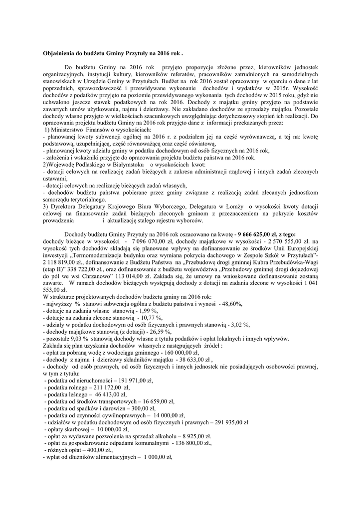 Objaśnienia do budżetu Gminy Przytuły na 2016