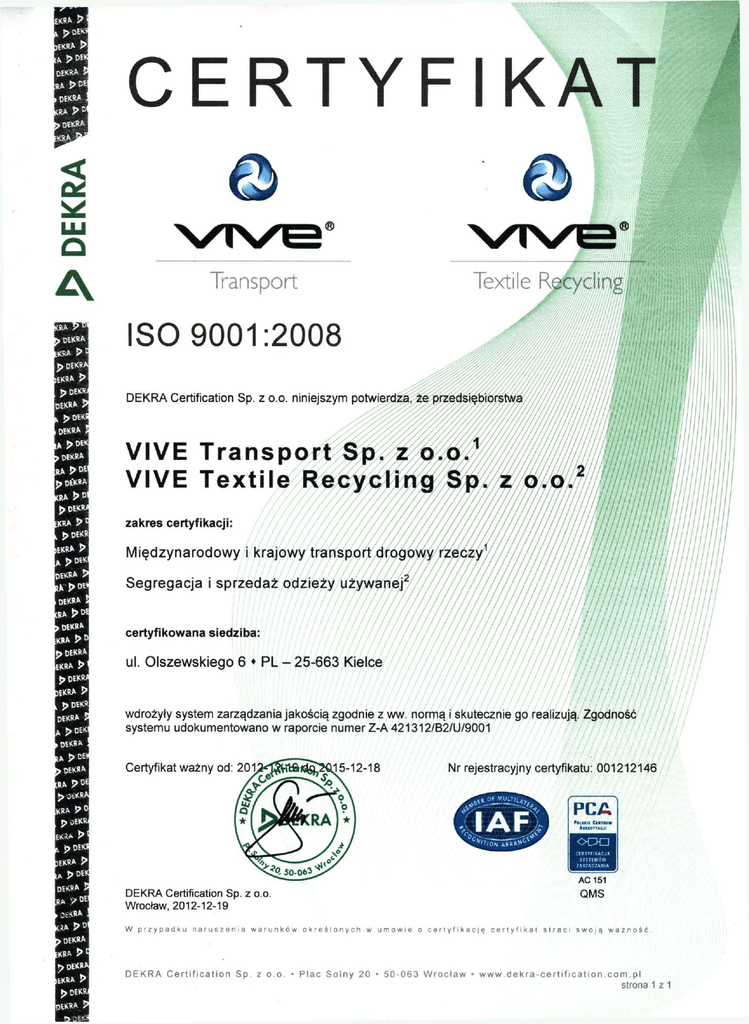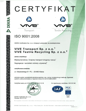 CERTYFIKAT ransDort ISO 9001:2008 DEKRA Certification Sp. z o.o. niniejszym potwierdza, że przedsiębiors VIVE Transport VIVE Textilę/R^cv zakres certyfikacji: Międzynarodowy i krajowy transport d Segregacja i sprzedaż odzieży używ9 certyfikowana siedzi!^: / / / / / ul. Olszewskiego 6 • PL - 25-663 Kielce ^:i.'nnM(i;//////////////// wdrożyły system zarządzania jakością zgodnie z ww. normą i skutecznie go realizują. Zgodność systemu udokumentowano w raporcie numer Z-A421312/B2/U/9001 / / / / / / 7 / ' / / / / / / / / /. Certyfikat ważny od: ^ ' -12-18 • /'!Ii^U1111iI!//////1/111111i // ^ / / / Nr rejestracyjny certyfikatu: 001212146 ' ' /.' AC 151 DEKRA Certification Sp. z o.o. Wrocław, 2012-12-19 w przypadku naruszenia warunków QMS określonych w umowie o certyfikację certyfikat straci swoją ważność. D E K R A C e r t i f i c a t i o n S p . z o.o. • Plac Solny 20 • 50-063 W r o c ł a w • w w w . d e k r a - c e r t i f i c a t i o n . c o m . p l strona 1 z 1 ///