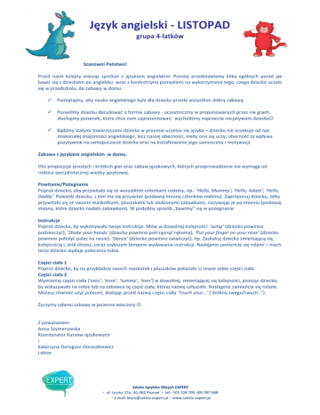 Język angielski - LISTOPAD grupa 4-latków Szanowni Państwo! Przed nami kolejny miesiąc spotkań z językiem angielskim. Poniżej przedstawiamy kilka ogólnych porad jak bawić się z dzieckiem po angielsku wraz z konkretnymi pomysłami na wykorzystanie tego, czego dziecko uczyło się w przedszkolu, do zabawy w domu. Pamiętajmy, aby nauka angielskiego była dla dziecka przede wszystkim dobrą zabawą. Pozwólmy dziecku decydować o formie zabawy - uczestniczmy w proponowanych przez nie grach, słuchajmy piosenek, które chce nam zaprezentować; wychodźmy naprzeciw inicjatywom dziecka☺ Bądźmy stałymi towarzyszami dziecka w procesie uczenia się języka – dziecko nie oczekuje od nas doskonałej znajomości angielskiego, lecz naszej obecności, kiedy ono się uczy; obecność ta wpływa pozytywnie na samopoczucie dziecka oraz na kształtowanie jego samooceny i motywacji. Zabawa z językiem angielskim w domu. Oto propozycje prostych i krótkich gier oraz zabaw językowych, których przeprowadzenie nie wymaga od rodzica specjalistycznej wiedzy językowej. Powitanie/Pożegnanie Poproś dziecko, aby przywitało się ze wszystkimi członkami rodziny, np.: ‘Hello, Mummy’; ‘Hello, Adam’; ‘Hello, Daddy’. Powiedz dziecku, z kim ma się przywitać (podawaj imiona członków rodziny). Zaproponuj dziecku, żeby przywitało się ze swoimi maskotkami, pluszakami lub ulubionymi zabawkami, nazywając je po imieniu (podawaj imiona, które dziecko nadało zabawkom). W podobny sposób „bawimy” się w pożegnanie. Instrukcje Poproś dziecko, by wykonywało twoje instrukcje. Mów w dowolnej kolejności: ‘Jump’ (dziecko powinno podskoczyć), ‘Shake your hands’ (dziecko powinno potrząsnąć rękoma), ‘Put your finger on your nose’ (dziecko powinno położyć palec na nosie), ‘Dance’ (dziecko powinno zatańczyć), itp. Zaskakuj dziecko zmieniającą się kolejnością i, jeśli chcesz, coraz szybszym tempem wydawania instrukcji. Następnie zamieńcie się rolami – niech teraz dziecko wydaje polecenia tobie. Części ciała 1 Poproś dziecko, by na przykładzie swoich maskotek i pluszaków pokazało ci znane sobie części ciała. Części ciała 2 Wymieniaj części ciała (‘ears’, ‘nose’, ‘tummy’, ‘toes’) w dowolnej, zmieniającej się kolejności, prosząc dziecko, by wskazywało na sobie lub na zabawce tę część ciała, której nazwę usłyszało. Następnie zamieńcie się rolami. Możesz również użyć poleceń, dodając przed nazwą części ciała ‘Touch your…’ (‘dotknij swego/swych…’). Życzymy udanej zabawy w jesienne wieczory ☺ Z poważaniem Anna Szymerowska Koordynator Kursów Językowych i Katarzyna Dorogusz-Doroszkiewicz Lektor Szkoła Języków Obcych EXPERT ◦ ul. Leszka 37a, 61-062 Poznań ◦ tel.: 501 228 709, 605 997 668 ◦e-mail: [email protected] ◦www.szkola-expert.pl Język angielski - LISTOPAD grupa 4-latków Słowa i zwroty, które pojawią się na spotkaniach w przedszkolu w LISTOPADZIE: BODY head - głowa arms - ręce tummy - brzuch fingers - palce legs - nogi feet - stopy Body! – song Shake, shake, shake your head, shake your head with me! x2 Wave, wave, wave your arms, wave your arms with me! x2 Pat, pat, pat your tummy, pat your tummy with me! x2 shoulders - ramiona knees - kolana toes - palce u stóp chin - broda Wave, wave, wave your fingers, wave yuor fingers with me! x2 Zwroty i wyrażenia: What's the matter? - Co się stało? It hurts! - To boli! Knock! Knock! - Puk! Puk! Stand up! - Wstań! Sit down! - Usiądź! Shake your head! - Potrząśnij głową! Wave your arms! - Pomachaj rękami! Pat your tummy! - Poklep się po brzuchu! Wave your fingers! - Pomachaj paluszkami! Pat your legs! - Poklep się po nogach! Stomp your feet! - Zatup stopami! Put your finer on your (nose)! - Połóż palec na (nosie)! Wave goodbye! - Pomachaj na pożegnanie! Pat, pat, pat your legs, pat your legs with me! x2 Stomp, stomp, stomp your feet, stomp your feet with me! x2 One little finger! - song One little finger, one little finger, One little finger, tap tap tap. Put your finger up, put your finger down, Put it on your head! Head! One little finger, ..... ... Put in on your nose! Nose! ... Put it on your chin! Chin! ... Put it on your arm! Arm! ... Put it on your leg! Leg! ... Put it on your foot! Foot! Now let's wave goodbye! Goodbye! ----------------------------------------------------------------------- ----------------------------------------------------------------------- Hello Song Hello everyone, tra la la la la! Hello everyone, tra la la la la! Hello everyone, tra la la la la! Hello everyone! Bye bye Song Bye bye everyone, tra la la la la! Bye bye everyone, tra la la la la! Bye bye everyone, tra la la la la! Bye bye everyone! Szkoła Języków Obcych EXPERT ◦ ul. Leszka 37a, 61-062 Poznań ◦ tel.: 501 228 709, 605 997 668 ◦e-mail: [email protected] ◦www.szkola-expert.pl