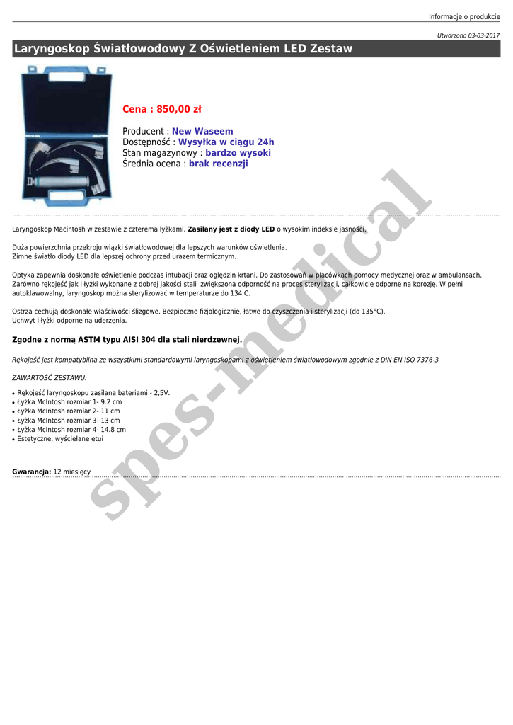 Informacje o produkcie Utworzono 03-03-2017 Laryngoskop Światłowodowy Z Oświetleniem LED Zestaw Cena : 850,00 zł al Producent : New Waseem Dostępność : Wysyłka w ciągu 24h Stan magazynowy : bardzo wysoki Średnia ocena : brak recenzji Laryngoskop Macintosh w zestawie z czterema łyżkami. Zasilany jest z diody LED o wysokim indeksie jasności. ic Duża powierzchnia przekroju wiązki światłowodowej dla lepszych warunków oświetlenia. Zimne światło diody LED dla lepszej ochrony przed urazem termicznym. ed Optyka zapewnia doskonałe oświetlenie podczas intubacji oraz oględzin krtani. Do zastosowań w placówkach pomocy medycznej oraz w ambulansach. Zarówno rękojeść jak i łyżki wykonane z dobrej jakości stali zwiększona odporność na proces sterylizacji, całkowicie odporne na korozję. W pełni autoklawowalny, laryngoskop można sterylizować w temperaturze do 134 C. Ostrza cechują doskonałe właściwości ślizgowe. Bezpieczne fizjologicznie, łatwe do czyszczenia i sterylizacji (do 135°C). Uchwyt i łyżki odporne na uderzenia. -m Zgodne z normą ASTM typu AISI 304 dla stali nierdzewnej. Rękojeść jest kompatybilna ze wszystkimi standardowymi laryngoskopami z oświetleniem światłowodowym zgodnie z DIN EN ISO 7376-3 ZAWARTOŚĆ ZESTAWU: ● ● ● ● ● Rękojeść laryngoskopu zasilana bateriami - 2,5V. Łyżka McIntosh rozmiar 1- 9.2 cm Łyżka McIntosh rozmiar 2- 11 cm Łyżka McIntosh rozmiar 3- 13 cm Łyżka McIntosh rozmiar 4- 14.8 cm Estetyczne, wyściełane etui sp es ● Gwarancja: 12 miesięcy