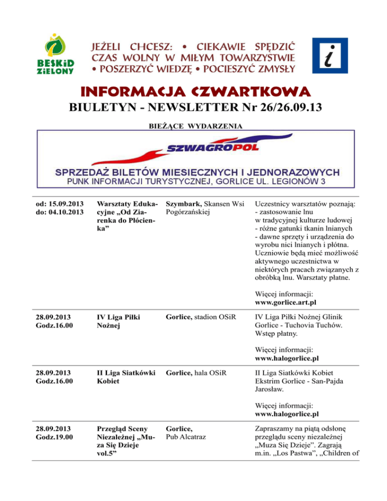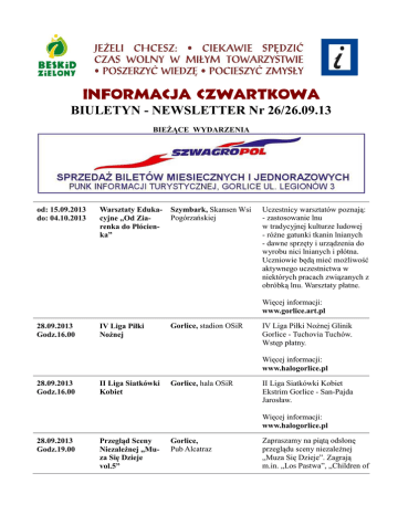 INFORMACJA CZWARTKOWA BIULETYN - NEWSLETTER Nr 26/26.09.13 BIEŻĄCE WYDARZENIA od: 15.09.2013 do: 04.10.2013 Warsztaty Edukacyjne „Od Ziarenka do Płócienka” Szymbark, Skansen Wsi Pogórzańskiej Uczestnicy warsztatów poznają: - zastosowanie lnu w tradycyjnej kulturze ludowej - różne gatunki tkanin lnianych - dawne sprzęty i urządzenia do wyrobu nici lnianych i płótna. Uczniowie będą mieć możliwość aktywnego uczestnictwa w niektórych pracach związanych z obróbką lnu. Warsztaty płatne. Więcej informacji: www.gorlice.art.pl 28.09.2013 Godz.16.00 IV Liga Piłki Nożnej Gorlice, stadion OSiR IV Liga Piłki Nożnej Glinik Gorlice - Tuchovia Tuchów. Wstęp płatny. Więcej informacji: www.halogorlice.pl 28.09.2013 Godz.16.00 II Liga Siatkówki Kobiet Gorlice, hala OSiR II Liga Siatkówki Kobiet Ekstrim Gorlice - San-Pajda Jarosław. Więcej informacji: www.halogorlice.pl 28.09.2013 Godz.19.00 Przegląd Sceny Niezależnej „Muza Się Dzieje vol.5” Gorlice, Pub Alcatraz Zapraszamy na piątą odsłonę przeglądu sceny niezależnej „Muza Się Dzieje”. Zagrają m.in. „Los Pastwa”, „Children of the Fairground”. Więcej informacji: www.abcgorlice.pl 28.09.2013 Godz.19.00 „Retro Dancing przy Świecach” Gorlice, Kino „Wiarus” Impreza dla wszystkich miłośników tańca i dobrej zabawy przy muzyce na żywo. Wstęp 39 zł od pary. Więcej informacji: www.halogorlice.pl od: 28.09.2013 do: 29.09.2013 „Święto Rydza” Wysowa-Zdrój, Park Zdrojowy W programie pokaz mody „Utkane Karpaty”, prelekcja: „Grzyby chronione w Polsce”, koncerty „Drive”, „Na łuku Karpat”, dancing „Rudy, rudy, rudy rydz”. Ponadto pokazy rzemiosła, kulinarne, warsztaty tańców i instrumentów ludowych. Więcej informacji: www.abcgorlice.pl 29.09.2013 Godz.14.00 "Jesienny Puchar Burmistrza"zawody strzeleckie Gorlice, strzelnica LOK LOK oraz Miasto Gorlice serdecznie zaprasza wszystkich chętnych sympatyków strzelectwa sportowego na zawody strzeleckie. Celem zawodów jest popularyzacja strzelectwa sportowego wśród młodzieży i dorosłych. Więcej informacji: www.gorlice24.pl 29.09.2013 Godz.10.0016.00 „Dzień Dawcy Szpiku” Gorlice Podczas akcji zapraszamy do obejrzenia widowiska w wykonaniu młodzieży powiatu gorlickiego, która brała udział w Interdyscyplinarnym Obozie Artystycznym w Lublinie. Pamiętaj, weź ze sobą dokument tożsamości z nr. PESEL. Więcej informacji: www.abcgorlice.pl od: 03.10.2013 do: 06.10.2013 „XIV Międzynarodowy Festiwal Bobowa, Hala sportowowidowiskowa W programie: pokazy mody, warsztaty koronki klockowej, Godz.09.00 prezentacje artystyczne i muzyczne. Koronki Klockowej” Więcej informacji: www.ck.bobowa.pl 03.10.2013 Godz.18.00 Gorlice, Sala „Pod Sową” MBP „Pecha Kucha Night” „Pecha Kucha Night” to wydarzenie na pół artystyczne, pół towarzyskie. Jest okazją do spotkań ludzi twórczych, do pokazania ciekawych projektów szerszej publiczności oraz wymiany zdań. Więcej informacji: www.abcgorlice.pl 04.10.2013 Godz.18.00 „XXIII Międzynarodowa Galicyjska Jesień Literacka” Gorlice, Dwór Karwacjanów W programie: "Na Pięciolinii Marzeń" - koncert jubileuszowy 35-lecia zespołu „Ostatnia Wieczerza w Karczmie Przeznaczonej do Rozbiórki” oraz wieczór literacki z udziałem poetów z kraju i zagranicy. Więcej informacji: www.gorlice.art.pl 04.10.2013 Godz.18.00 „10-lecie Cechu Koronki Klockowej z Prešova” Gorlice, Dom PolskoSłowacki Dyrektor Gorlickiego Centrum Kultury i Kierownik Domu Polsko-Słowackiego serdecznie zapraszają na wernisaż wystawy koronki klockowej z Prešova. Więcej informacji: www.dompolskoslowacki.eu od: 05.10.2013 do: 06.10.2013 Godz.09.00 „Ogólnopolskie Targi Rękodzieła” Bobowa, plac przy Zespole Szkół nr 1 Pokazy balonowe, degustacje potraw regionalnych, dyskoteka, stoiska handlowe i prezentacje artystyczne. Więcej informacji: www.ck.bobowa.pl STAŁE EKSPOZYCJE od: 01.07.2013 do: 30.09.2013 „Bursztyn Złoto Północy” Krosno, Muzeum Podkarpackie Wystawa pt. „Bursztyn Złoto Północy”. Więcej informacji: www.muzeum.krosno.pl od: 19.07.2013 „Koleją rzeczy” Gorlice, Dwór Karwacjanów Wystawa malarsko-graficzna pt.: ”Koleją rzeczy”, artystki Emilii Gąsienica-Setlak. Więcej informacji: www.gorlice.art.pl od: 02.08.2013 do: 30.09.2013 od: 23.08.2013 Wystawa fotograficzna: „Szlak Architektury Drewnianej” oraz „Krajobraz światłem malowany…” Szymbark, Kasztel „Sposoby Obrazowania” Gorlice, Dwór Karwacjanów Wystawa fotograficzna autorstwa Michała Sośnickiego. Więcej informacji: www.gorlice.art.pl Wystawa pt.: „Sposoby Obrazowania”, autorstwa artystów Wydziału Malarstwa Akademii Sztuk Pięknych w Gdańsku Więcej informacji: www.gorlice.art.pl od: 24.08.2013 „Łosie- inspiracją dla malarzy” Łosie, Zagroda Maziarska Wystawa malarska autorstwa Towarzystwa Przyjaciół Sztuk Pięknych w Lublinie. Więcej informacji: www.gorlice.art.pl od: 03.09.2013 do: 27.09.2013 „Gorlice moją inspiracją” Gorlice, Pawilon Historii Wystawa pastelami suchymi Miasta „Gorlice moją inspiracją” autorstwa Krystiana Dziewanowskiego. Więcej informacji: www.abcgorlice.pl od: 03.09.2013 do: 28.09.2013 „Gorlickie Twarze- spotkałam Ich…” Gorlice, Dom PolskoSłowacki, Rynek 1 Dyrektor Gorlickiego Centrum Kultury - Adam Nowak oraz Kierownik Domu PolskoSłowackiego im. Dušana Jurkoviča - Krzysztof Szadkowski serdecznie zapraszają na wystawę fotografii Barbary Sterzel pt.: „Gorlickie Twarze- spotkałam Ich…”. Więcej informacji: www.halogorlice.pl od: 09.09.2013 do: 31.10.2013 Wystawa fotogra- Krempna, Ośrodek ficzna Fotoklubu z Edukacyjny Stropkova Wystawa fotograficzna Fotoklubu z Stropkova. Więcej informacji: www.magurskipn.pl od: 04.10.2013 do: 06.11.2013 „10-lecie Cechu Koronki Klockowej z Prešova” Gorlice, Dom PolskoSłowacki Dyrektor Gorlickiego Centrum Kultury i Kierownik Domu Polsko-Słowackiego s