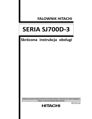 FALOWNIK HITACHI SERIA SJ700D-3 Skrócona instrukcja obsługi Należy przeczytać niniejszą Skróconą instrukcję obsługi i zachować ją w łatwo dostępnym miejscu w celu ponownego wykorzystania. NT2311X Wprowadzenie Wprowadzenie Dziękujemy za zakup falownika Hitachi serii SJ700D-3. Niniejsza Skrócona instrukcja obsługi zawiera informacje na temat planowania instalacji, instalowania, przekazywania do eksploatacji, eksploatacji oraz serwisowania falownika Hitachi serii SJ700D-3. Przed rozpoczęciem obsługi urządzenia należy dokładnie przeczytać niniejszy dokument oraz instrukcję obsługi, aby zrozumieć zasady dotyczące prawidłowego i bezpiecznego postępowania z urządzeniem zapewniające właściwą eksploatację falownika. Przed rozpoczęciem instalacji, obsługi oraz konserwacji należy zapoznać się z zasadą działania urządzenia, informacjami dotyczącymi bezpieczeństwa, środkami ostrożności oraz zasadami obsługi i serwisowania falownika. Podczas korzystania z falownika należy stosować się do zamieszczonych specyfikacji oraz zapobiegać zagrożeniom poprzez wykonywanie czynności konserwacyjnych. Niniejszy dokument jest „Skróconą instrukcją obsługi”. Więcej informacji znajduje się w dokumencie „Instrukcja obsługi falownika serii SJ700D-3” zamieszczonym na płycie CD dostarczonej z falownikiem. Jeżeli falownik jest używany z opcjonalnym wyposażeniem, należy także przeczytać instrukcje obsługi tego wyposażenia. Niniejszą Skróconą instrukcję obsługi oraz instrukcje obsługi wyposażenia opcjonalnego należy przekazać użytkownikowi końcowemu falownika. Korzystanie z niniejszej Skróconej instrukcji obsługi oraz dokumentów zamieszczonych na płycie CD (Instrukcją obsługi) Zawartość niniejszej instrukcji oraz dokumentów zamieszczonych na płycie CD może ulec zmianie bez uprzedzenia. W przypadku utraty niniejszej instrukcji nowa kopia nie zostanie dostarczona, dlatego należy chronić ją przed zagubieniem. Bez zezwolenia wydawcy zabronione jest powielanie części niniejszej instrukcji oraz zawartości płyty CD niezależnie od formy. W przypadku stwierdzenia nieprawidłowych lub brakujących opisów albo pytań dotyczących treści podręczników należy skontaktować się z wydawcą. Historia wersji Nr 1 Opis wersji Pierwsze wydanie Data wydania 1 czerwca 2014 Kod publikacji NT2311X - W obecnym wydaniu Skróconej instrukcji obsługi uwzględniono również korekty błędów drukarskich i literowych oraz nieprawidłowych opisów, a także dodano opisy, które nie zostały uwzględnione w powyższej tabeli historii wersji. Instrukcje dotyczące bezpieczeństwa Instrukcje dotyczące bezpieczeństwa Przed instalacją, obsługą, konserwacją lub przeglądem falownika należy uważnie przeczytać tę Skróconą instrukcję obsługi i dołączone do niej dokumenty. Zalecenia dotyczące bezpieczeństwa, zamieszczone w Skróconej instrukcji obsługi, wyróżniono etykietami OSTRZEŻENIE lub PRZESTROGA. OSTRZEŻENIE : Oznaczenie wskazuje, że nieprawidłowa obsługa może doprowadzić do niebezpiecznych sytuacji, które grożą poważnymi obrażeniami ciała lub śmiercią. PRZESTROGA : Oznaczenie wskazuje, że nieprawidłowa obsługa może doprowadzić do niebezpiecznych sytuacji, które grożą średnimi lub lekkimi obrażeniami ciała lub uszkodzeniem wyposażenia. PRZESTROGA może doprowadzić do Należy pamiętać, że nawet sytuacja oznaczona symbolem poważnych konsekwencji w pewnych okolicznościach. Należy pamiętać o przestrzeganiu wszystkich instrukcji bezpieczeństwa, które zawierają ważne dla zachowania bezpieczeństwa kwestie. Należy również zwrócić szczególną uwagę na zalecenia i instrukcje zawarte w sekcjach „Uwagi”. PRZESTROGA Wiele rysunków zamieszczonych w Skróconej instrukcji obsługi przedstawia falownik ze zdjętymi pokrywami i/lub częściami przesłaniającymi widok. Nie należy eksploatować falownika w stanie przedstawionym na tych rysunkach. Jeśli pokrywy i/lub części zostały usunięte, należy pamiętać o ich ponownym zamontowaniu w pierwotnych miejscach przed rozpoczęciem pracy i stosować się do wszystkich instrukcji opisanych w podręczniku obsługi podczas eksploatacji falownika. 1. Instalacja PRZESTROGA – Falownik należy zainstalować na niepalnej (np. metalowej) powierzchni. W przeciwnym razie wystąpi ryzyko pożaru. – Nie wolno umieszczać łatwopalnych materiałów w pobliżu zainstalowanego falownika. W przeciwnym razie wystąpi ryzyko pożaru. – Podczas przenoszenia falownika nie wolno chwytać urządzenia, trzymając za jego górną pokrywę. W przeciwnym razie wystąpi ryzyko zranienia na skutek upuszczenia urządzenia. – Należy uważać, aby ciała obce (np. ucięte kawałki drutu, pryskające odłamki podczas spawania, żelazne opiłki, kable i kurz) nie dostały się do wnętrza falownika. W przeciwnym razie wystąpi ryzyko pożaru. – Falownik należy zainstalować na powierzchni zdolnej do utrzymania ciężaru określonego w tym dokumencie. W przeciwnym razie wystąpi ryzyko obrażeń ciała na skutek upadku falownika. – Falownik należy zainstalować na pionowej ścianie, na której nie występują wibracje. W przeciwnym razie wystąpi ryzyko obrażeń ciała na skutek upadku falownika. – Nie wolno instalować ani eksploatować falownika, jeśli został on uszkodzony lub brakuje w nim części. W przeciwnym razie wystąpi ryzyko obrażeń ciała. – Falownik należy zainstalować w odpowiednio wentylowanym pomieszczeniu niewystawionym na bezpośrednie działanie promieni słonecznych. Należy unikać miejsc, w których falownik będzie narażony na działanie wysokiej temperatury, dużej wilgotności, kondensacji, pyłu, wybuchowych, żrących lub łatwopalnych gazów, mgły z płynu do szlifowania lub wody morskiej. W przeciwnym razie wystąpi ryzyko pożaru. – Falownik jest urządzeniem precyzyjnym. Należy chronić je przed upadkiem lub s