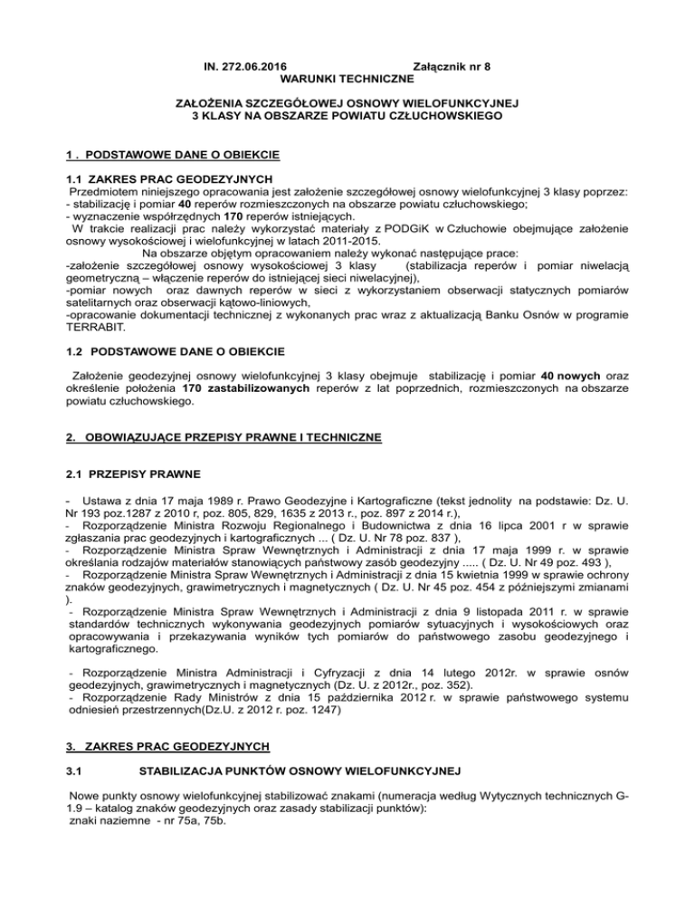 IN. 272.06.2016 Załącznik nr 8 WARUNKI TECHNICZNE ZAŁOŻENIA SZCZEGÓŁOWEJ OSNOWY WIELOFUNKCYJNEJ 3 KLASY NA OBSZARZE POWIATU CZŁUCHOWSKIEGO 1 . PODSTAWOWE DANE O OBIEKCIE 1.1 ZAKRES PRAC GEODEZYJNYCH Przedmiotem niniejszego opracowania jest założenie szczegółowej osnowy wielofunkcyjnej 3 klasy poprzez: - stabilizację i pomiar 40 reperów rozmieszczonych na obszarze powiatu człuchowskiego; - wyznaczenie współrzędnych 170 reperów istniejących. W trakcie realizacji prac należy wykorzystać materiały z PODGiK w Człuchowie obejmujące założenie osnowy wysokościowej i wielofunkcyjnej w latach 2011-2015. Na obszarze objętym opracowaniem należy wykonać następujące prace: -założenie szczegółowej osnowy wysokościowej 3 klasy (stabilizacja reperów i pomiar niwelacją geometryczną – włączenie reperów do istniejącej sieci niwelacyjnej), -pomiar nowych oraz dawnych reperów w sieci z wykorzystaniem obserwacji statycznych pomiarów satelitarnych oraz obserwacji kątowo-liniowych, -opracowanie dokumentacji technicznej z wykonanych prac wraz z aktualizacją Banku Osnów w programie TERRABIT. 1.2 PODSTAWOWE DANE O OBIEKCIE Założenie geodezyjnej osnowy wielofunkcyjnej 3 klasy obejmuje stabilizację i pomiar 40 nowych oraz określenie położenia 170 zastabilizowanych reperów z lat poprzednich, rozmieszczonych na obszarze powiatu człuchowskiego. 2. OBOWIĄZUJĄCE PRZEPISY PRAWNE I TECHNICZNE 2.1 PRZEPISY PRAWNE - Ustawa z dnia 17 maja 1989 r. Prawo Geodezyjne i Kartograficzne (tekst jednolity na podstawie: Dz. U. Nr 193 poz.1287 z 2010 r, poz. 805, 829, 1635 z 2013 r., poz. 897 z 2014 r.), - Rozporządzenie Ministra Rozwoju Regionalnego i Budownictwa z dnia 16 lipca 2001 r w sprawie zgłaszania prac geodezyjnych i kartograficznych ... ( Dz. U. Nr 78 poz. 837 ), - Rozporządzenie Ministra Spraw Wewnętrznych i Administracji z dnia 17 maja 1999 r. w sprawie określania rodzajów materiałów stanowiących państwowy zasób geodezyjny ..... ( Dz. U. Nr 49 poz. 493 ), - Rozporządzenie Ministra Spraw Wewnętrznych i Administracji z dnia 15 kwietnia 1999 w sprawie ochrony znaków geodezyjnych, grawimetrycznych i magnetycznych ( Dz. U. Nr 45 poz. 454 z późniejszymi zmianami ). - Rozporządzenie Ministra Spraw Wewnętrznych i Administracji z dnia 9 listopada 2011 r. w sprawie standardów technicznych wykonywania geodezyjnych pomiarów sytuacyjnych i wysokościowych oraz opracowywania i przekazywania wyników tych pomiarów do państwowego zasobu geodezyjnego i kartograficznego. - Rozporządzenie Ministra Administracji i Cyfryzacji z dnia 14 lutego 2012r. w sprawie osnów geodezyjnych, grawimetrycznych i magnetycznych (Dz. U. z 2012r., poz. 352). - Rozporządzenie Rady Ministrów z dnia 15 października 2012 r. w sprawie państwowego systemu odniesień przestrzennych(Dz.U. z 2012 r. poz. 1247) 3. ZAKRES PRAC GEODEZYJNYCH 3.1 STABILIZACJA PUNKTÓW OSNOWY WIELOFUNKCYJNEJ Nowe punkty osnowy wielofunkcyjnej stabilizować znakami (numeracja według Wytycznych technicznych G1.9 – katalog znaków geodezyjnych oraz zasady stabilizacji punktów): znaki naziemne - nr 75a, 75b. Głowice znaków należy umieścić w szczycie słupa. Głowice nie mogą wystawać ponad szczytu słupa więcej niż 3 cm. Po określeniu położenia nowych punktów 3 klasy, z uwzględnieniem lokalizacji proponowanych przez Zamawiającego oraz położenia dotychczasowych punktów szczegółowej osnowy 3 klasy, wykonawca sporządzi projekt techniczny sieci i przedłoży go Zamawiającemu w terminie do dnia 10 czerwca 2016 r. Zatwierdzony projekt, składający się z dwóch części – mapy projektu i części opisowej, stanowi podstawę do osadzenia znaków w terenie. Wyboru położenia punktów dokonywać jedynie w miejscach ogólnie dostępnych (w pasach ulic, chodników, placów, będących w dyspozycji, własności Urzędu Gminy, itp.). Stabilizację, pomiar i określenie położenia przeprowadzić: dwa do wyboru Wykonawcy terminy wykonania podlegające punktacji w siwz przez Zamawiającego: a) 15 lipiec 2016 r. albo b) 30 lipiec 2016 r. Dla każdego nowego punktu osnowy wysokościowej należy wykonać opis topograficzny oraz wykonać zdjęcia aparatem cyfrowym z rozdzielczością 1024x768 pikseli w formacie JPEG w pełnym kolorze. Dla nowych punktów osnowy należy przygotować zawiadomienia o założeniu znaku, które należy przekazać władającym nieruchomością lub gruntem. Numerację punktów określa projekt osnowy. Wszelkie odstępstwa należy uzgodnić z ośrodkiem dokumentacji. Wszystkie punkty osnowy wielofunkcyjnej powinny mieć określone płaskie współrzędne geodezyjne z dokładnością przewidzianą dla poziomej osnowy geodezyjnej 3 klasy. 3.2 POMIAR SZCZEGÓŁOWEJ OSNOWY WIELOFUNKCYJNEJ 3 KLASY Pomiar wysokościowy należy wykonać sprawdzonymi niwelatorami zapewniającymi uzyskanie dokładności przewidziane dla osnowy wysokościowej 3 klasy, używając łat niwelacyjnych z aktualnym świadectwem komparacji. Przed przystąpieniem do pomiaru należy przedłożyć Zamawiającemu świadectwa komparacji łat. Określenie położenia i wysokości punktów osnowy wielofunkcyjnej należy wykonać zgodnie rozdz. 6 i 7 rozporządzenia Ministra Administracji i Cyfryzacji z dnia 14 lutego 2012r. w sprawie osnów geodezyjnych, grawimetrycznych i magnetycznych (Dz. U. z 2012r., poz. 352). 3.3 KAMERALNE OPRACOWANIE WYNIKÓW POMIARU Należy wykonać kontrolę i zestawienia wyników pomiaru i przedłożyć przed wyrównaniem Zamawiającemu do sprawdzenia. Następnie uzupełnić brakującymi informacjami będącymi wynikiem założenia szczegółowej osnowy wielofunkcyjnej bazę osnów programu TERRABIT. Wyrównanie osnowy wielofunkcyjnej należy wykonać metodą najmniejszych kwadratów z wykorzystaniem odpowiedniego oprogramowania. Dodatkowo sporządzić zestawienie ciągów niwelacyjnych w pliku txt, w układzie: Nr ciągu Nnr punktu Wstecz Nr punktu Wprzód Przewyższenie Dł. odcinka. 3.3