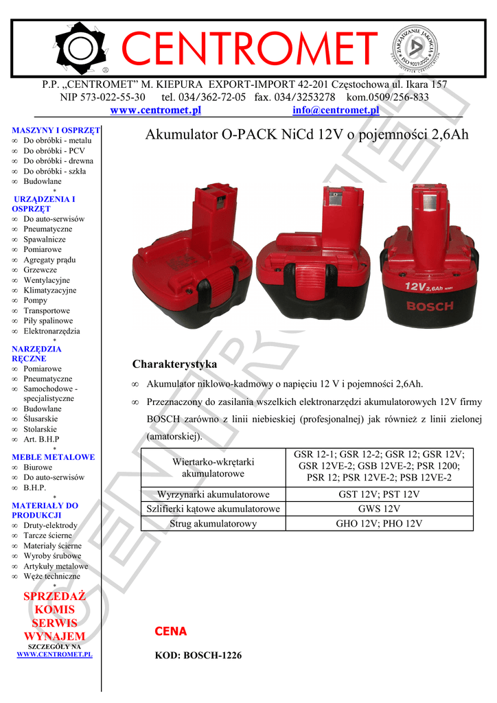CENTROMET P.P. „CENTROMET” M. KIEPURA EXPORT-IMPORT 42-201 Częstochowa ul. Ikara 157 NIP 573-022-55-30 tel. 034/362-72-05 fax. 034/3253278 kom.0509/256-833 www.centromet.pl [email protected] MASZYNY I OSPRZĘT • Do obróbki - metalu • Do obróbki - PCV • Do obróbki - drewna • Do obróbki - szkła • Budowlane Akumulator O-PACK NiCd 12V o pojemności 2,6Ah ∗ URZĄDZENIA I OSPRZĘT • Do auto-serwisów • Pneumatyczne • Spawalnicze • Pomiarowe • Agregaty prądu • Grzewcze • Wentylacyjne • Klimatyzacyjne • Pompy • Transportowe • Piły spalinowe • Elektronarzędzia ∗ NARZĘDZIA RĘCZNE • Pomiarowe • Pneumatyczne • Samochodowe specjalistyczne • Budowlane • Ślusarskie • Stolarskie • Art. B.H.P Charakterystyka • Akumulator niklowo-kadmowy o napięciu 12 V i pojemności 2,6Ah. • Przeznaczony do zasilania wszelkich elektronarzędzi akumulatorowych 12V firmy BOSCH zarówno z linii niebieskiej (profesjonalnej) jak również z linii zielonej (amatorskiej). ∗ MEBLE METALOWE • Biurowe • Do auto-serwisów • B.H.P. ∗ MATERIAŁY DO PRODUKCJI • Druty-elektrody • Tarcze ścierne • Materiały ścierne • Wyroby śrubowe • Artykuły metalowe • Węże techniczne Wiertarko-wkrętarki akumulatorowe GSR 12-1; GSR 12-2; GSR 12; GSR 12V; GSR 12VE-2; GSB 12VE-2; PSR 1200; PSR 12; PSR 12VE-2; PSB 12VE-2 Wyrzynarki akumulatorowe Szlifierki kątowe akumulatorowe Strug akumulatorowy GST 12V; PST 12V GWS 12V GHO 12V; PHO 12V ∗ SPRZEDAŻ KOMIS SERWIS WYNAJEM SZCZEGÓŁY NA WWW.CENTROMET.PL CENA KOD: BOSCH-1226 CENTROMET P.P. „CENTROMET” M. KIEPURA EXPORT-IMPORT 42-201 Częstochowa ul. Ikara 157 NIP 573-022-55-30 tel. 034/362-72-05 fax. 034/3253278 kom.0509/256-833 www.centromet.pl [email protected] Akumulator wyposażony jest w: • Styk dodatni i styk ujemny – o kształcie noży podwójnie zwiększają powierzchnię stykową, umożliwiając przewodzenie prądu o natężeniu do 100A przy minimalnej oporności, wykonane z niklowej blachy stalowej zapewniają wysoką jakość połączenia i odporność na zużycie. • Styk kodujący – służy do przekazywania danych pomiędzy akumulatorem, a ładowarką w celu identyfikacji typu akumulatora i optymalnego sterowania liczbą przewidzianych dla danego akumulatora cykli ładowania i rozładowania. • Styk NTC (styk termistora) – przekazuje do ładowarki dane, dzięki którym możliwe jest kontrolowanie temperatury akumulatora podczas procesu ładowania, aby w momencie osiągnięcia wartości granicznej (ok. 45°C) przerwać dopływ prądu ładowania i przełączyć na tryb pracy podtrzymującej. • Wtyk APT (Akku-Pack-Top) – gwarantuje poprawny dobór akumulatora do elektronarzędzia i ładowarki, zintegrowane kodowanie mechaniczne zapobiega przed nieprawidłowym osadzeniem akumulatora w narzędziu i tym samym nieprawidłowej polaryzacji. • System O-PACK – opatentowany przez firmę BOSCH system mocowania akumulatora gwarantuje pewniejsze osadzenie akumulatora w narzędziu i ułatwia jego obsługę. Zatrzaski schowane są w obudowie, dzięki czemu nie zostaną uszkodzone nawet przy upadku akumulatora z wysokości.