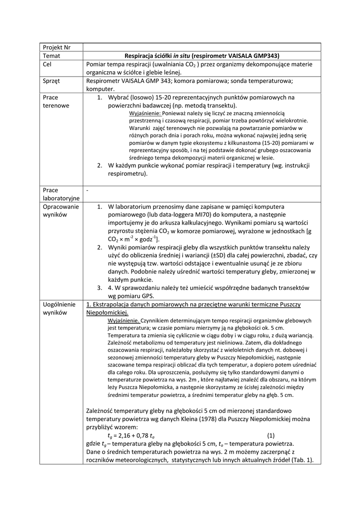 Projekt Nr Temat Cel Sprzęt Prace terenowe Respiracja ściółki in situ (respirometr VAISALA GMP343) Pomiar tempa respiracji (uwalniania CO2 ) przez organizmy dekomponujące materie organiczna w ściółce i glebie leśnej. Respirometr VAISALA GMP 343; komora pomiarowa; sonda temperaturowa; komputer. 1. Wybrać (losowo) 15-20 reprezentacyjnych punktów pomiarowych na powierzchni badawczej (np. metodą transektu). Wyjaśnienie: Ponieważ należy się liczyć ze znaczną zmiennością przestrzenną i czasową respiracji, pomiar trzeba powtórzyć wielokrotnie. Warunki zajęć terenowych nie pozwalają na powtarzanie pomiarów w różnych porach dnia i porach roku, można wykonać najwyżej jedną serię pomiarów w danym typie ekosystemu z kilkunastoma (15-20) pomiarami w reprezentacyjny sposób, i na tej podstawie dokonać grubego oszacowania średniego tempa dekompozycji materii organicznej w lesie. 2. W każdym punkcie wykonać pomiar respiracji i temperatury (wg. instrukcji respirometru). Prace laboratoryjne Opracowanie wyników Uogólnienie wyników 1. W laboratorium przenosimy dane zapisane w pamięci komputera pomiarowego (lub data-loggera MI70) do komputera, a następnie importujemy je do arkusza kalkulacyjnego. Wynikami pomiaru są wartości przyrostu stężenia CO2 w komorze pomiarowej, wyrażone w jednostkach [g CO2 × m-2 × godz-1]. 2. Wyniki pomiarów respiracji gleby dla wszystkich punktów transektu należy użyć do obliczenia średniej i wariancji (±SD) dla całej powierzchni, zbadać, czy nie występują tzw. wartości odstające i ewentualnie usunąć je ze zbioru danych. Podobnie należy uśrednić wartości temperatury gleby, zmierzonej w każdym punkcie. 3. 4. W sprawozdaniu należy też umieścić współrzędne badanych transektów wg pomiaru GPS. 1. Ekstrapolacja danych pomiarowych na przeciętne warunki termiczne Puszczy Niepołomickiej. Wyjaśnienie. Czynnikiem determinującym tempo respiracji organizmów glebowych jest temperatura; w czasie pomiaru mierzymy ją na głębokości ok. 5 cm. Temperatura ta zmienia się cyklicznie w ciągu doby i w ciągu roku, z dużą wariancją. Zależność metabolizmu od temperatury jest nieliniowa. Zatem, dla dokładnego oszacowania respiracji, należałoby skorzystać z wieloletnich danych nt. dobowej i sezonowej zmienności temperatury gleby w Puszczy Niepołomickiej, następnie szacowane tempa respiracji obliczać dla tych temperatur, a dopiero potem uśredniać dla całego roku. Dla uproszczenia, posłużymy się tylko standardowymi danymi o temperaturze powietrza na wys. 2m , które najłatwiej znaleźć dla obszaru, na którym leży Puszcza Niepołomicka, a następnie skorzystamy ze ścisłej zależności między średnimi temperatur powietrza, a średnimi temperatur gleby na głęb. 5 cm. Zależność temperatury gleby na głębokości 5 cm od mierzonej standardowo temperatury powietrza wg danych Kleina (1978) dla Puszczy Niepołomickiej można przybliżyć wzorem: tg = 2,16 + 0,78 ta (1) gdzie tg – temperatura gleby na głębokości 5 cm, ta – temperatura powietrza. Dane o średnich temperaturach powietrza na wys. 2 m możemy zaczerpnąć z roczników meteorologicznych, statystycznych lub innych aktualnych źródeł (Tab. 1). Tab. 1. Średnie temperatury miesięczne w regionie krakowskim . Rocznik Statystyczny Rolnictwa, 2014. GUS, Warszawa, 2015. (http://stat.gov.pl/obszary- tematyczne/roczniki-statystyczne/roczniki-statystyczne/rocznik-statystyczny-rolnictwa2013,6,7.html) miesiąc IX 2011/2012 8,7 2012/2013 8,4 X XI XII I II III IV V VI VII VIII 15,1 8,1 2,0 1,6 -1,4 -7,0 4,4 9,7 15,0 17,8 20,2 14,5 8,5 5,0 -2,8 -2,4 -0,5 -0,9 8,9 14,3 17,5 19,6 2. Szacowanie zależności tempa respiracji od temperatury wg współczynnika Q10 Wyjaśnienie. Wykonując pomiary respiracji przy różnych temperaturach można dla danego układu ustalić empirycznie ilościową zależność tempa respiracji od temperatury. Można to zrobić albo w warunkach laboratoryjnych (kontrolując wszystkie warunki i zmieniając temperaturę doświadczenia), albo w terenie – ale tu sprawa się komplikuje, bo wykonując pomiary w różnych terminach (a tylko wtedy możemy mieć wystarczający zakres temperatur), nie możemy kontrolować wielu innych czynników, które też się zmieniają. Wyodrębnienie wpływu samej temperatury jest możliwe przy odpowiednio dużej liczbie pomiarów, ale jest to zadanie dość złożone i nie będzie tutaj omawiane. Jedynie powtarzając pomiary terenowe dokładnie w tych samych miejscach, w niedługich odstępach czasu (np. kilku – kilkunastogodzinnych), przy niezmieniającej się zasadniczo pogodzie, ale zmiennej temperaturze, możemy się uzyskać porównywalny materiał i obliczyć krzywą zależności metabolizmu od temperatury metoda regresji. Rysując wykres tej zależności dla wystarczająco dużego zakresu temperatur zauważymy, że jest t o zależność krzywoliniowa – wykładnicza. Dlatego regresję dopasowujemy w transformacji logarytmicznej. Równanie tej regresji posłuży nam do szacowania tempa respiracji ściółki przez cały rok. Jeżeli zakres temperatur pomiarowych jest zbyt mały i nie ma możliwości powtórzyć pomiarów co kilka dni, można również oszacować zależność metabolizmu od temperatury, zakładając, że jest to zależność wykładnicza. Z wielu danych fizjologicznych (w tym z respiracji ściółki) wynika, że tempo metabolizmu wzrasta 2-3 razy przy podniesieniu temperatury o 10°C, najczęściej przyjmuje się stałą 2,5; inaczej: Q10 = R(t+10)/Rt = 2,5 (2) Rt = Rref Q10 [(t-tref)/10] (3) Zatem, znając respirację w temperaturze t, łatwo otrzymamy respirację w temperaturze o 10º wyższej lub niższej. Przekształcając to równanie otrzymujemy wzór ogólny, dla dowolnej różnicy temperatur: gdzie Rt – respiracja obliczana dla temperatury t, Rref – respiracja zmierzona w temperaturze tref. Literatura 3. Oszacowanie rocznej respiracji gleby 3.1. Z dany