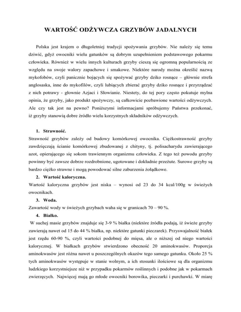 WARTOŚĆ ODŻYWCZA GRZYBÓW JADALNYCH