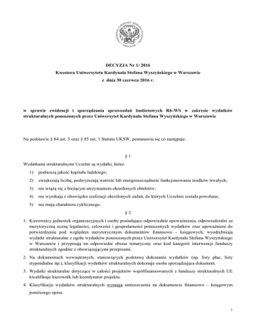 DECYZJA Nr 1/ 2016 Kwestora Uniwersytetu Kardynała Stefana Wyszyńskiego w Warszawie z dnia 30 czerwca 2016 r. w sprawie ewidencji i sporządzania sprawozdań budżetowych Rb-WS w zakresie wydatków strukturalnych ponoszonych przez Uniwersytet Kardynała Stefana Wyszyńskiego w Warszawie Na podstawie § 84 ust. 5 oraz § 85 ust. 1 Statutu UKSW, postanawia się co następuje: §1 Wydatkami strukturalnymi Uczelni są wydatki, które: 1) podnoszą jakość kapitału ludzkiego; 2) zwiększają liczbę, podwyższają wartość lub energooszczędność funkcjonowania środków trwałych; 3) nie wiążą się z bieżącym utrzymaniem określonych obiektów; 4) nie wynikają z obowiązku realizacji określonych zadań, do których Uczelnia została powołana; 5) nie mają charakteru cyklicznego. §2 1. Kierownicy jednostek organizacyjnych i osoby posiadające odpowiednie upoważnienia, odpowiedzialni za merytoryczną ocenę legalności, celowości i gospodarności ponoszonych wydatków oraz upoważnieni do potwierdzenia pod względem merytorycznym dokumentów finansowo - księgowych, wyodrębniają wydatki strukturalne z ogółu wydatków ponoszonych przez Uniwersytet Kardynała Stefana Wyszyńskiego w Warszawie i przypisują im odpowiedni obszar tematyczny oraz kod kategorii interwencji funduszy strukturalnych zgodnie z obowiązującymi przepisami. 2. Na dokumentach wewnętrznych, stanowiących podstawę dokonania wydatków (np. listy płac, listy stypendialne itp.), klasyfikacji wydatków strukturalnych dokonuje osoba sporządzająca dokument. 3. Wydatki strukturalne dotyczące w całości projektów współfinansowanych z funduszy strukturalnych UE kwalifikuje kierownik lub koordynator projektu. 4. Klasyfikacja wydatków strukturalnych wymaga umieszczenia na dokumencie finansowo – księgowym poniższego opisu. 1 Wydatek strukturalny TAK / NIE * obszar tematyczny.............. kod...................................... kwota.................................. data............. podpis........... przykład: Wydatek strukturalny TAK / NIE obszar tematyczny ....– II** kod ...........................– 13** kwota ...................... – 1000,00 data.............. podpis........... 5. Każdy dokument finansowo - księgowy należy opisać niezależnie od tego, czy wydatek jest wydatkiem strukturalnym czy też nie. W sytuacji gdy wydatek nie jest wydatkiem strukturalnym należy bezwzględnie w pozycji kod i kwota wpisać „0”. W przypadku kiedy wydatek strukturalny dotyczy więcej niż jednego obszaru należy kwotę odpowiednio podzielić i przypisać do właściwych obszarów. 6. Pracownicy Działu Finansowego przyjmują do realizacji wyłącznie dokumenty prawidłowo opisane. Brak prawidłowego opisu skutkuje zwrotem dokumentu źródłowego do właściwej jednostki organizacyjnej Uczelni w celu dokonania korekty opisu lub uzupełnienia. 7. Dział Księgowości UKSW dokonuje odpowiedniej ewidencji wydatków na cele strukturalne według klasyfikacji i w kwotach wskazanych w opisie dokumentów finansowo – księgowych. 8. Zobowiązuje się wszystkich kierowników jednostek do wprowadzenia odpowiednich procedur obiegu dokumentów wewnątrz jednostek organizacyjnych zapewniających opis dokumentu finansowo księgowego zgodnie zasadami określonymi niniejszą decyzją. §3 Nadzór nad wykonaniem postanowień niniejszej i osobom upoważnionych, o których mowa w § 2 ust. 1. decyzji powierza się kierownikom jednostek §4 1. Obszary tematyczne i kody wydatków strukturalnych stanowią załącznik do niniejszej decyzji. 2. W sprawach nieuregulowanych Decyzją stosuje się przepisy prawa powszechnie obowiązującego, a w szczególności: rozporządzenia Ministra Finansów w sprawie sprawozdawczości budżetowej i w sprawie szczegółowej klasyfikacji wydatków strukturalnych. §5 Decyzja wchodzi w życie z dniem podpisania. 2